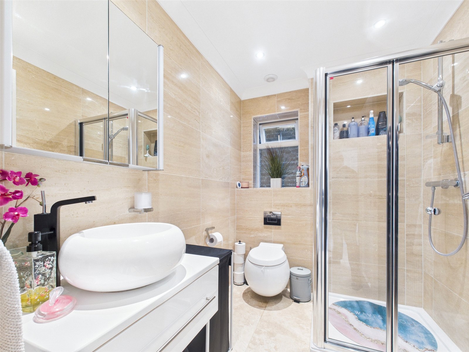 The master bedroom has a fully tiled en-suite comprising a full width shower cubicle, wash hand basin with vanity drawer and built in storage alongside, inset WC, chrome heated towel rail and an obscured glazed window.