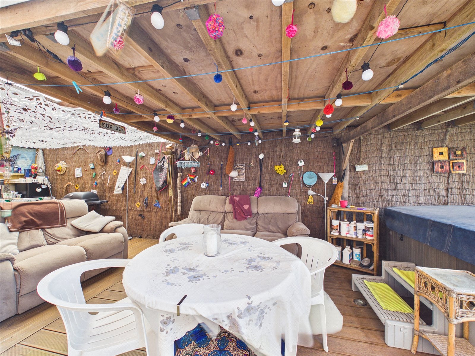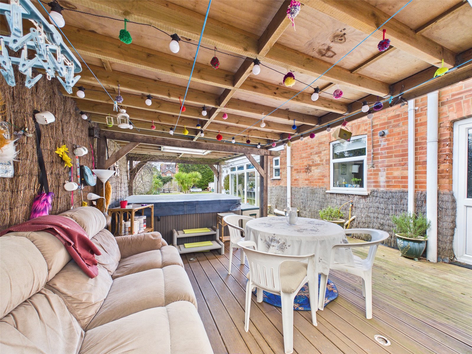 Externally, the property benefits from a generous rear garden. To the side of the property is a large covered terrace providing an ideal alfresco dining area or entertaining space. To the front there is a storage area. the rest of the garden is mainly laid to lawn with shrub borders.