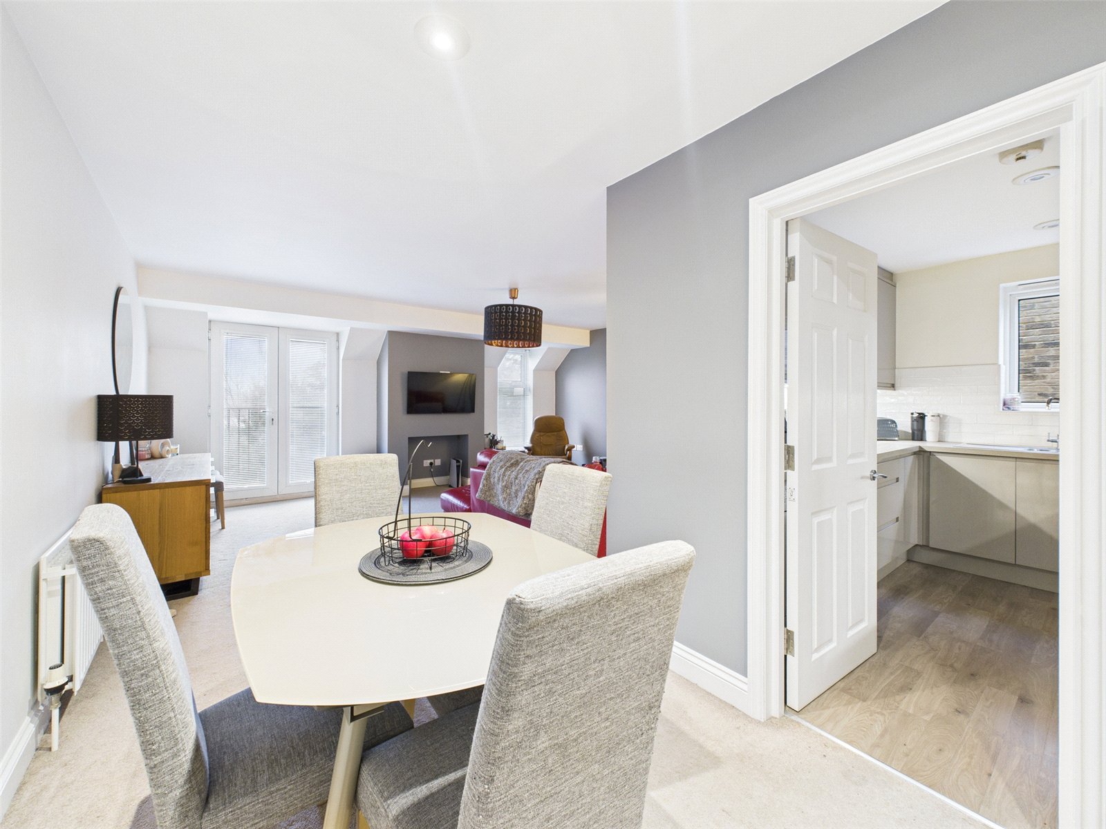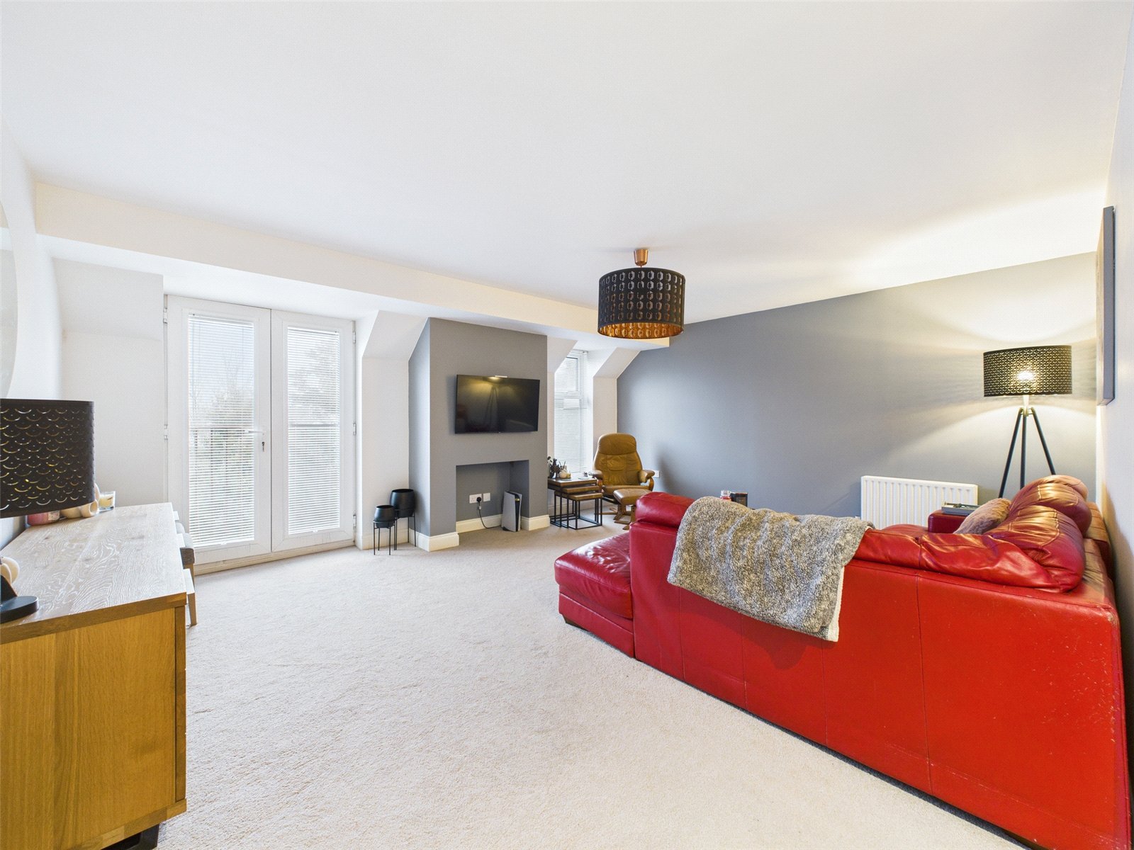 A communal entrance with stairs leads to the property’s front door, opening into a central hallway which provides access to all principal rooms. The standout feature is the generous living room, offering ample space for both relaxing and dining, and further enhanced by Juliette balcony doors, allowing plenty of natural light to flood the room and creating a lovely airy feel.