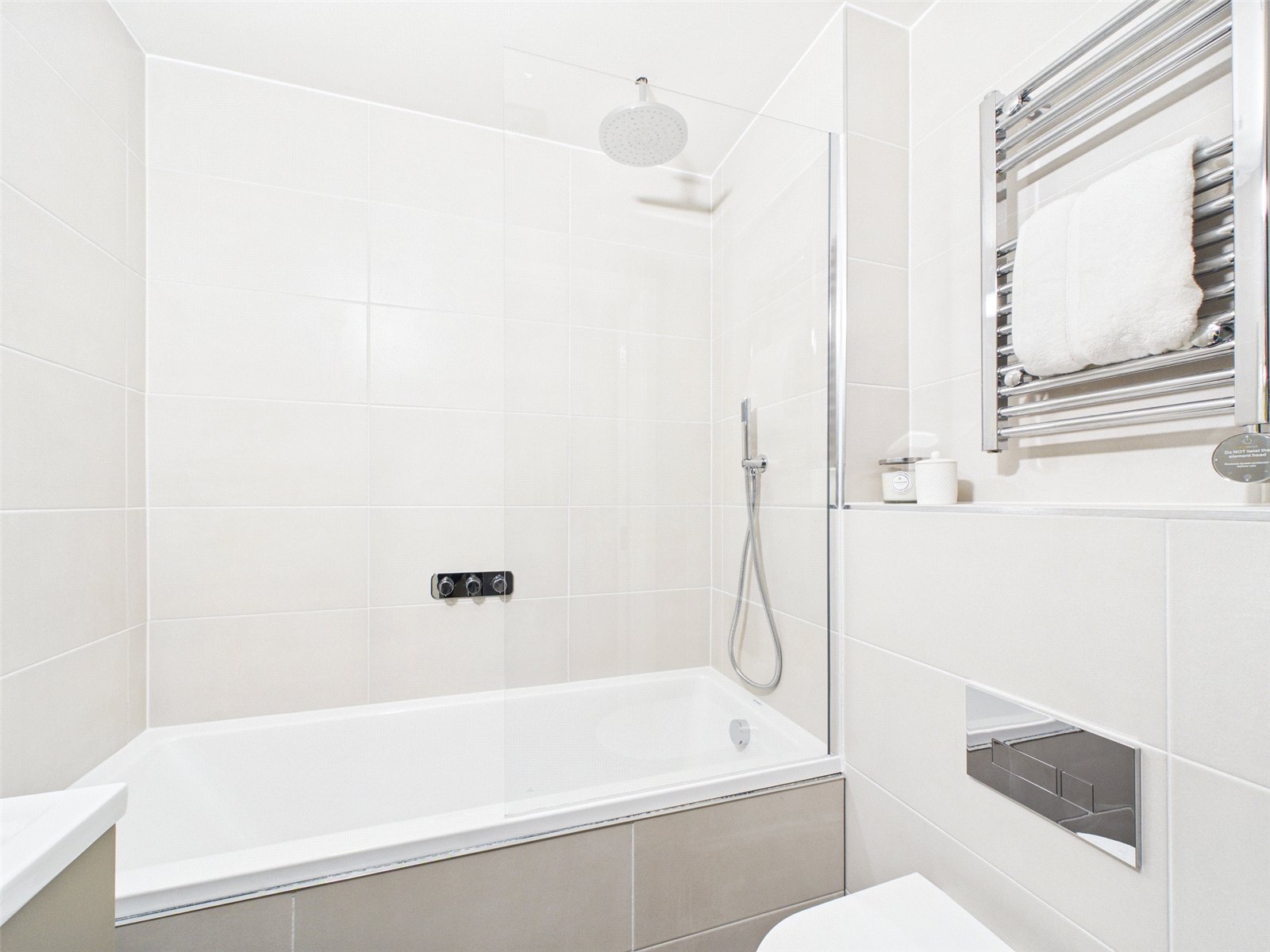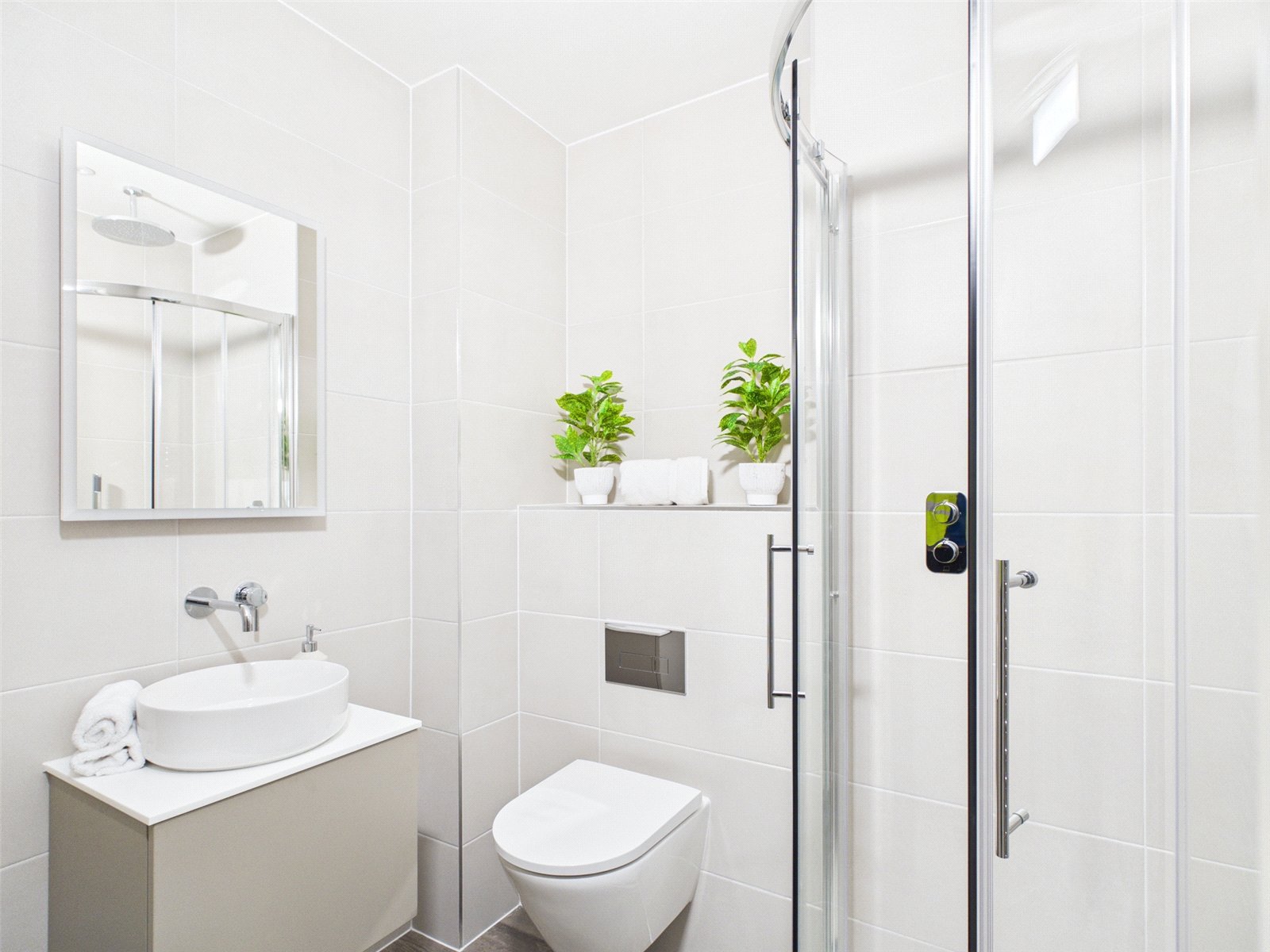 BATHROOMS: To be fitted with contemporary white sanitary ware, complimenting contemporary brassware, porcelain wall and floor tiling, under sink vanity units, polished chrome towel rails, and a wall or ceiling mounted shower head with separate handheld shower and wall-mounted controls.