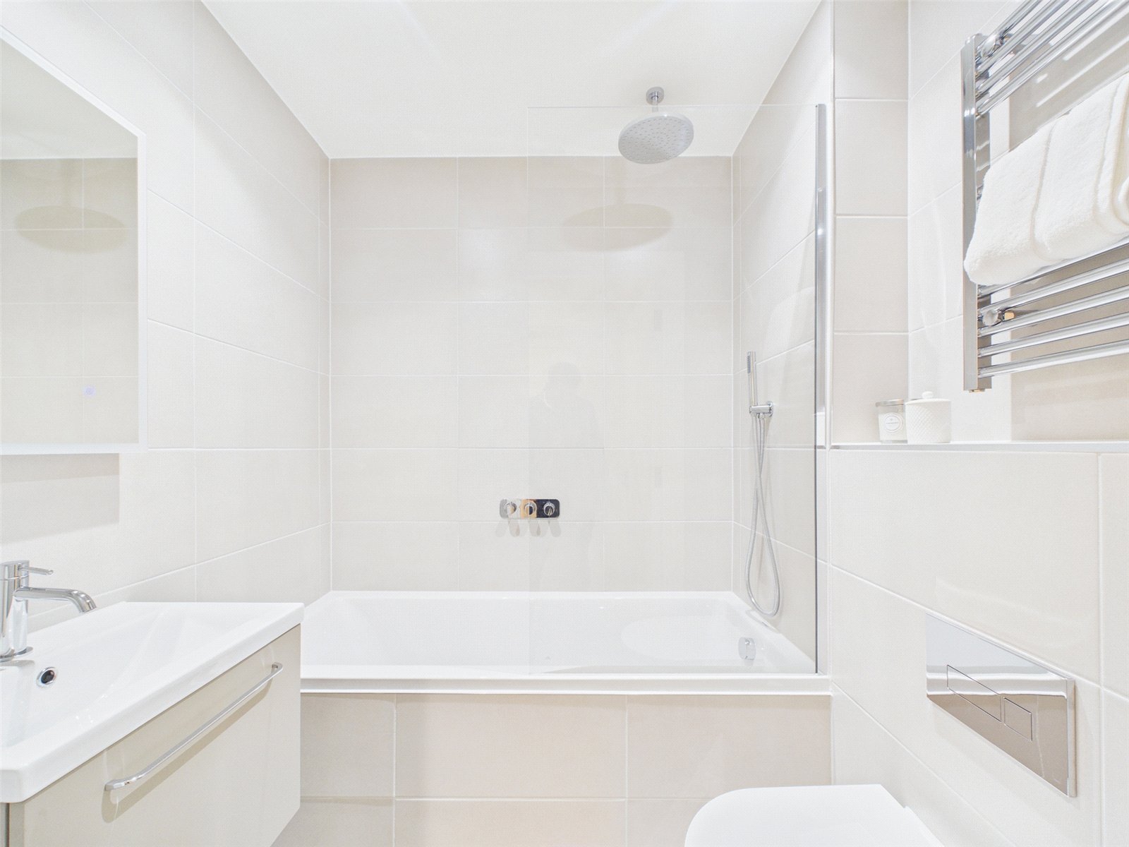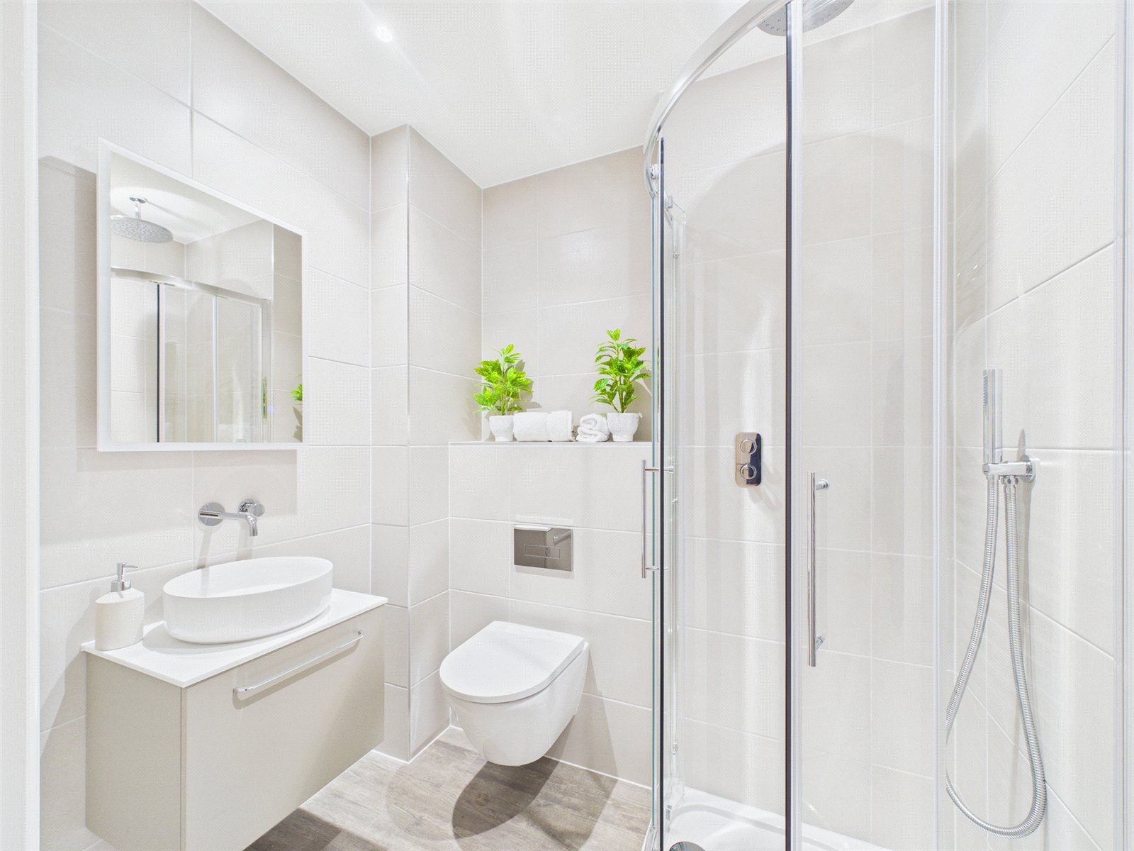 BATHROOMS: To be fitted with contemporary white sanitary ware, complimenting contemporary brassware, porcelain wall and floor tiling, under sink vanity units, polished chrome towel rails, and a wall or ceiling mounted shower head with separate handheld shower and wall-mounted controls.