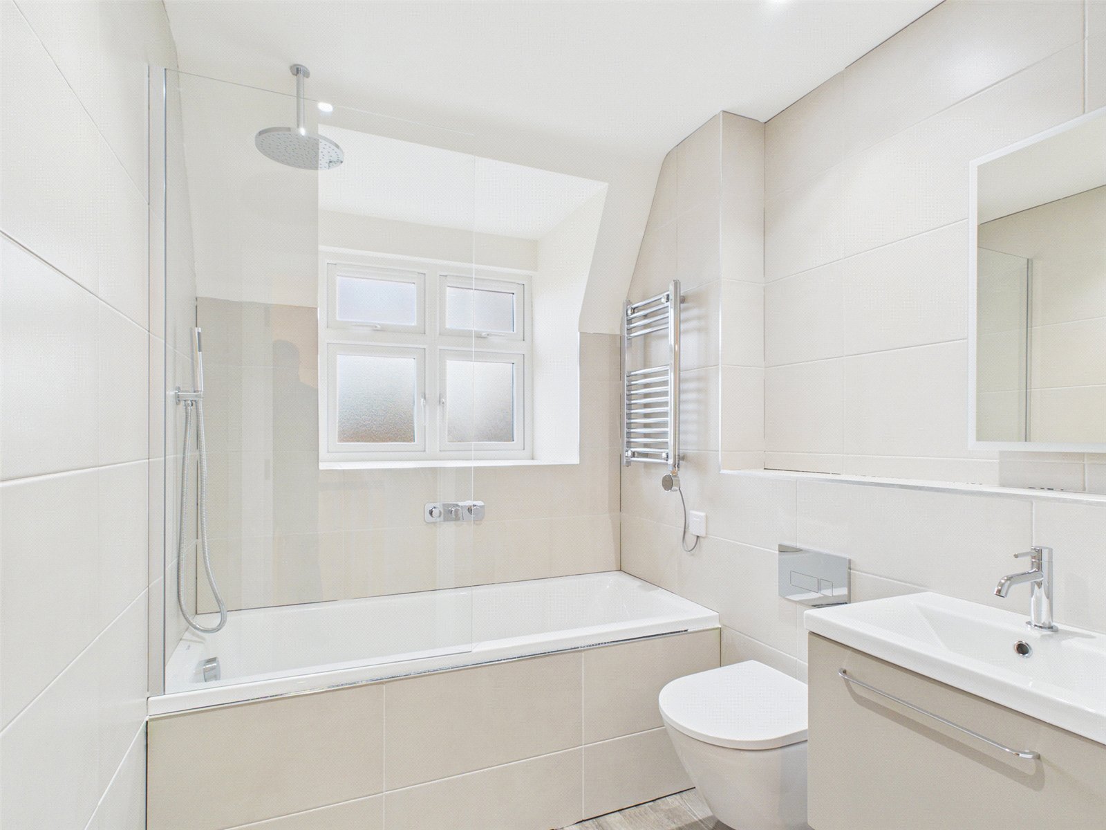 The bathroom is beautifully finished with a white suite, contemporary brassware and porcelain tiling. There is a full sized bath with a ceiling mounted and hand held shower over, a sink with vanity unit beneath, Wall mounted WC and a polished chrome towel rail.