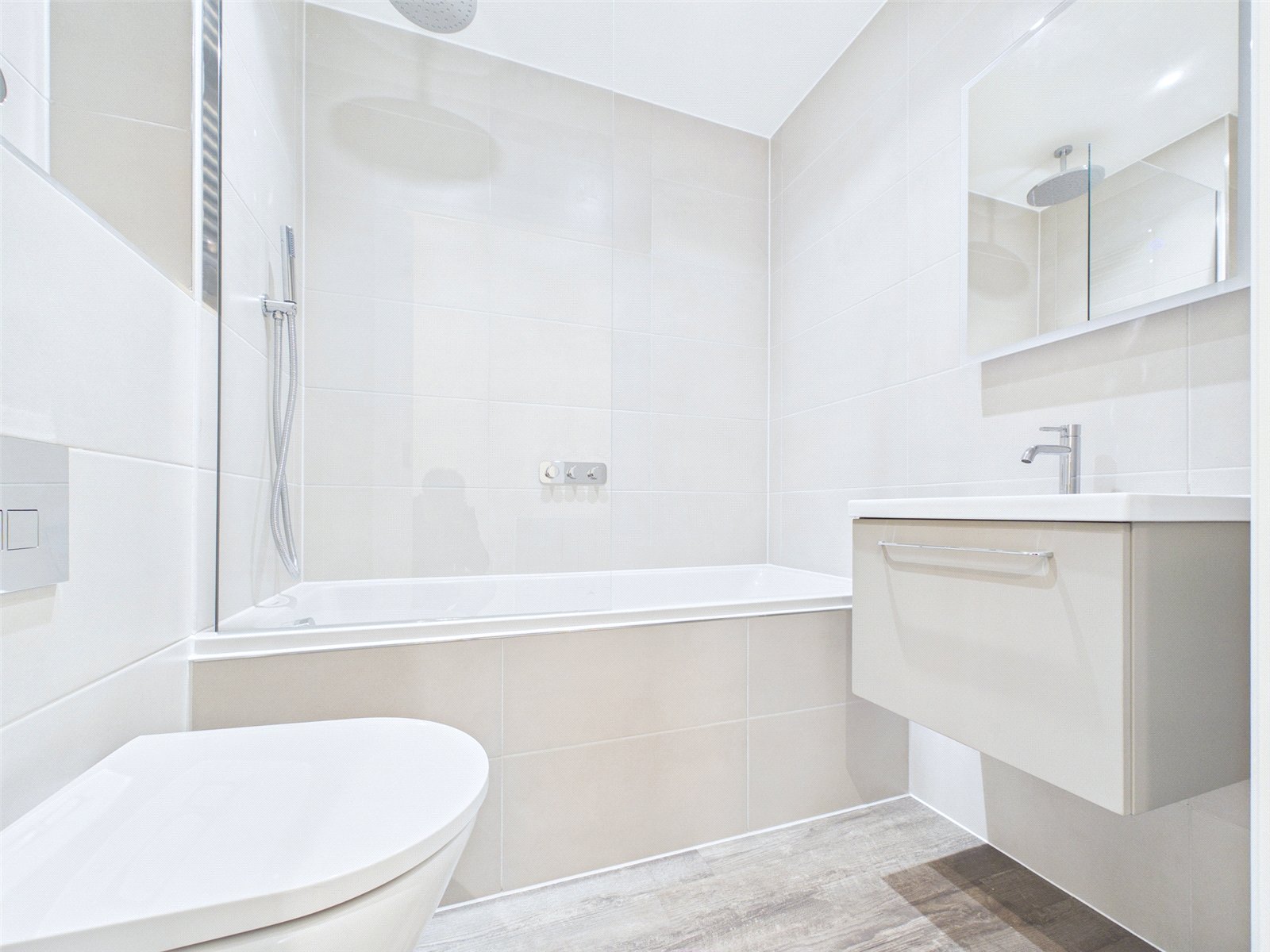 The bedroom makes for a comfortable double and is served by a luxuriously appointed bathroom, featuring contemporary white sanitary ware with complimenting contemporary brassware, porcelain wall and floor tiling, and a ceiling mounted shower head with separate handheld shower and wall-mounted controls.