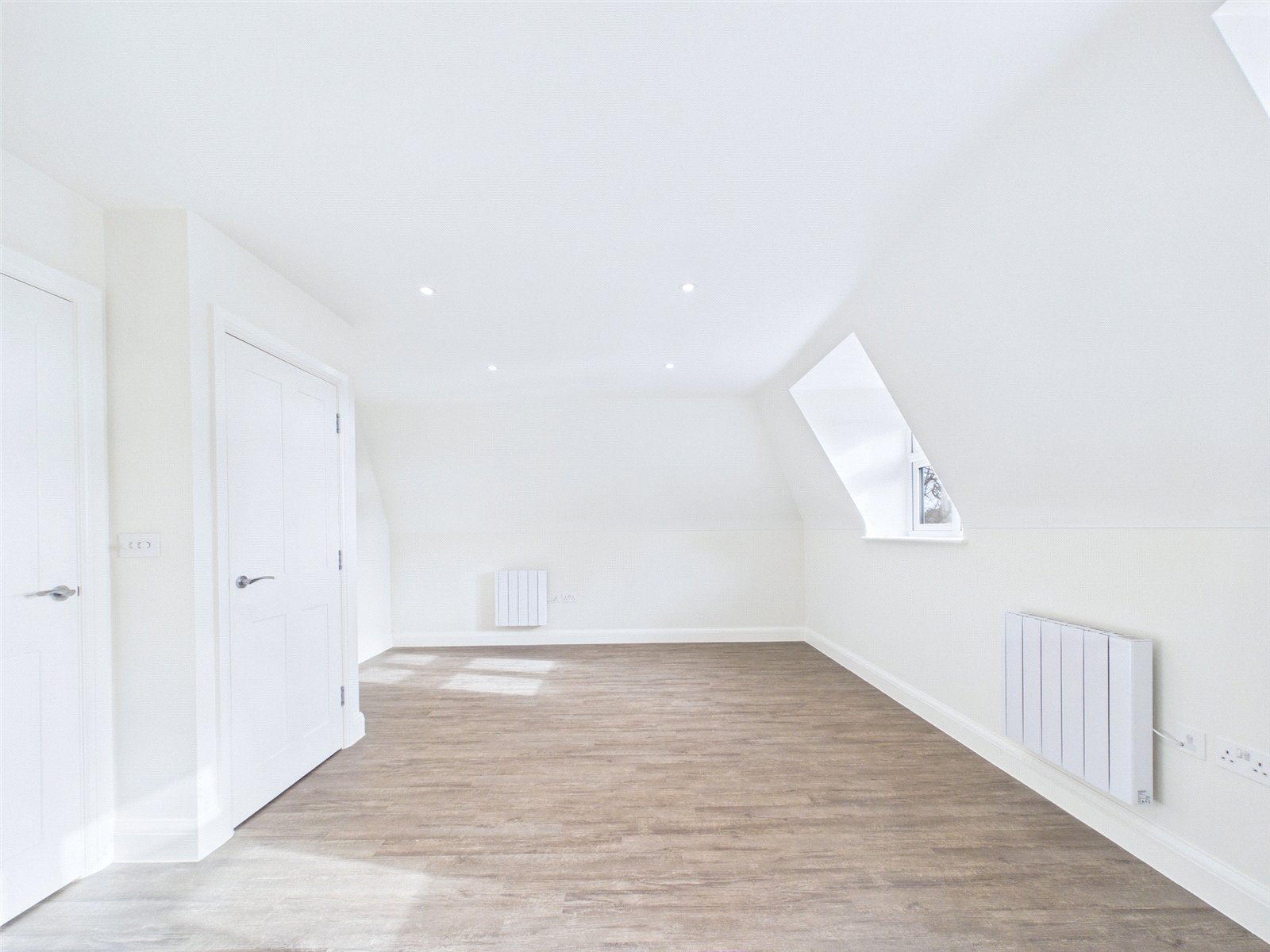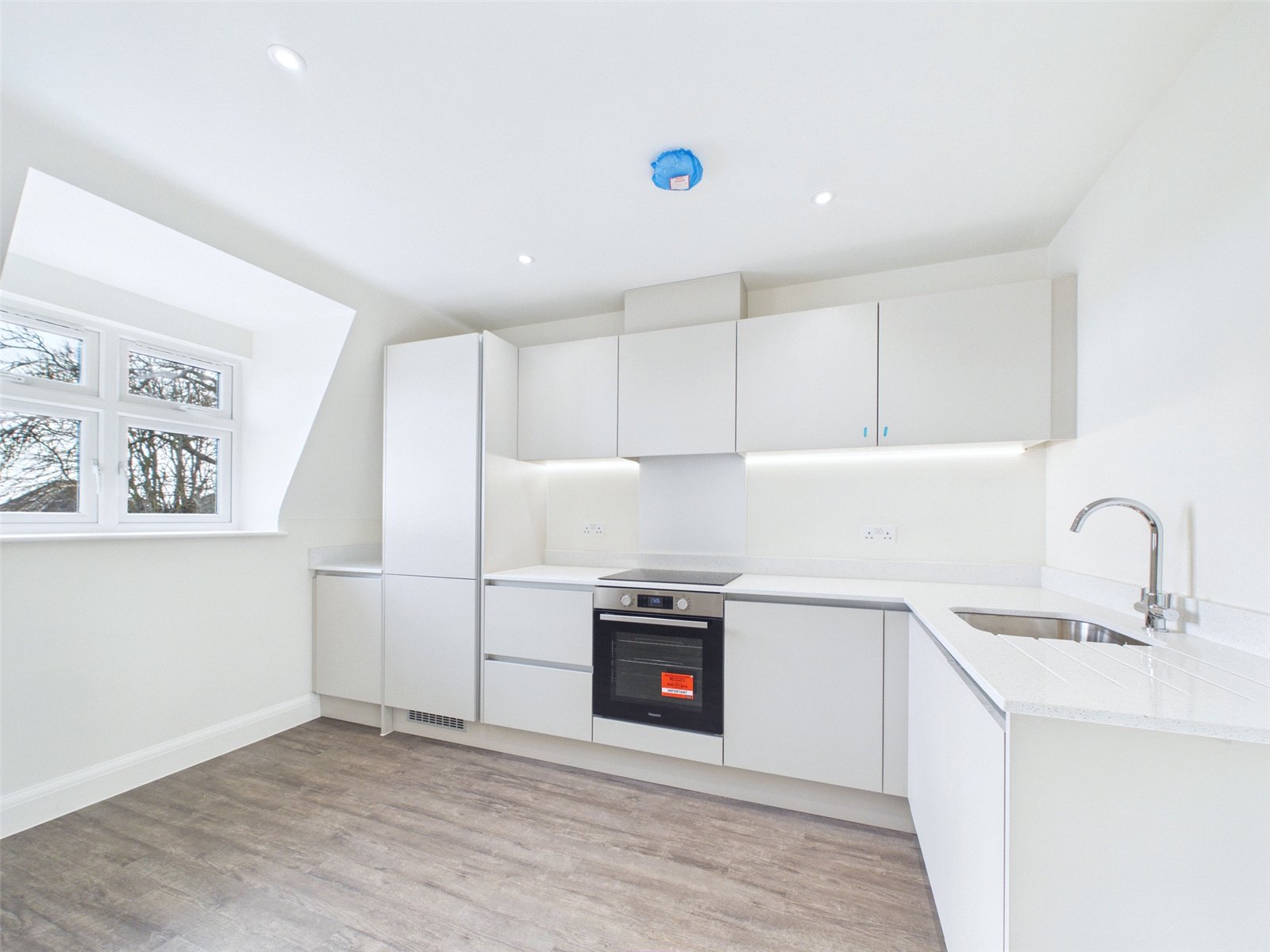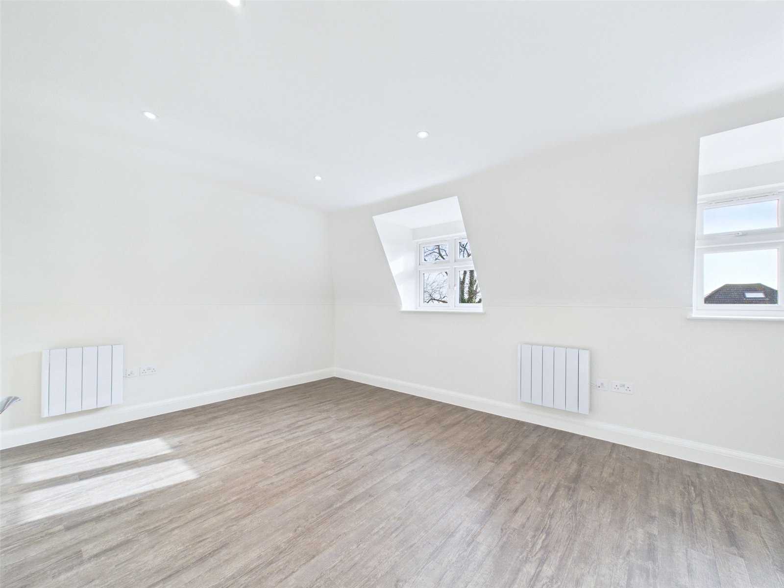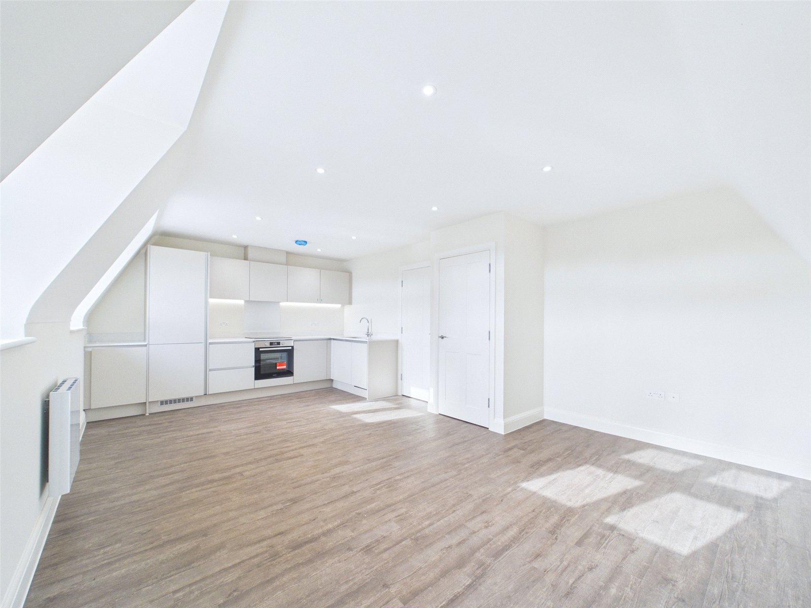 The open plan living space offers room for a good range of furniture and features a well-appointed kitchen, nicely finished with task-lighting beneath high level wall units, and integrated appliances to include an induction hob, electric oven, extractor hood, fridge freezer, dishwasher and washing machine.
