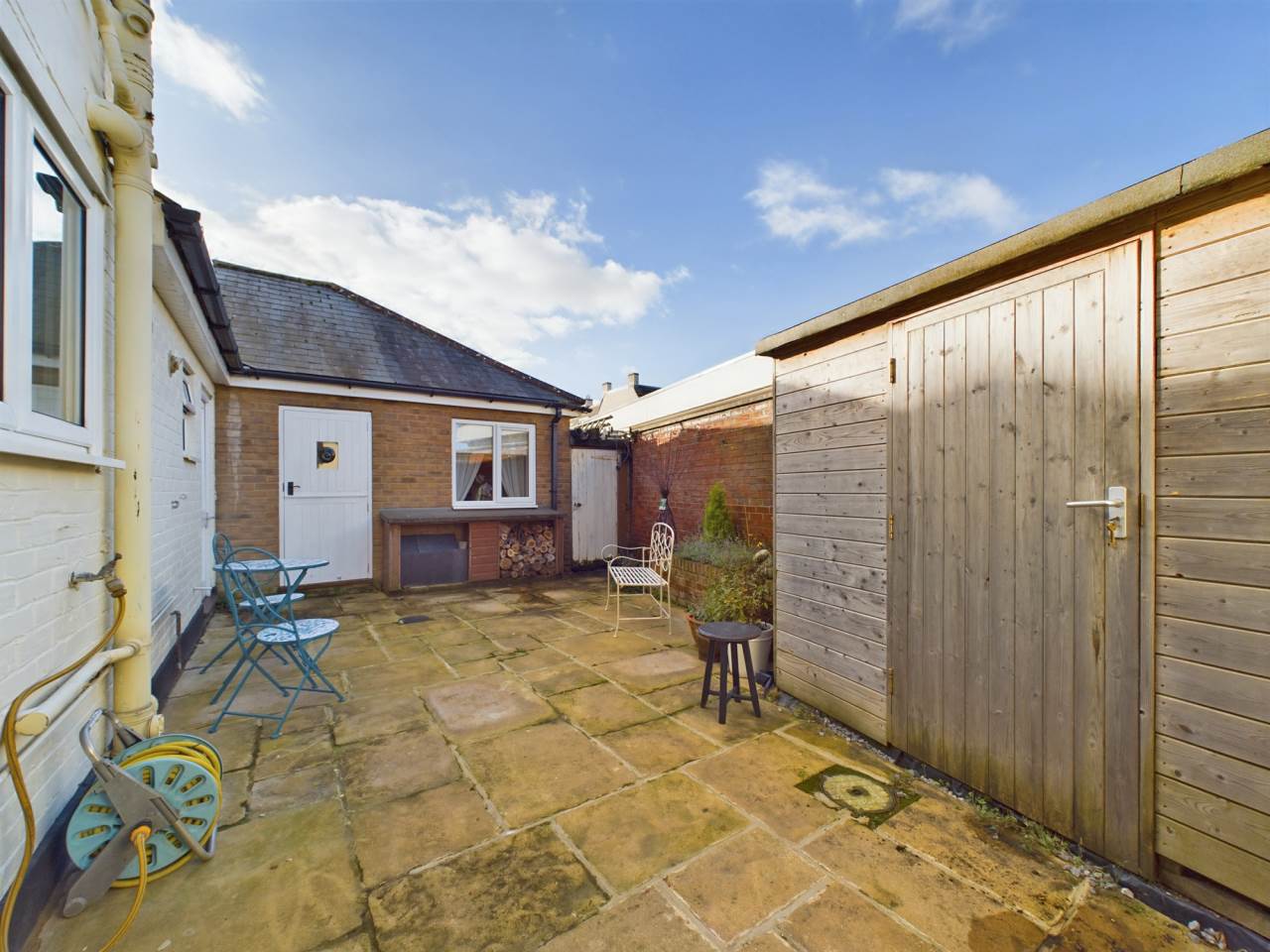 To the front and side is a private driveway with parking for several cars. The rear garden is turfed and features a charming walled courtyard area, ideal for alfresco dining. Three large sheds, each with power and lighting, offer ample storage or workspace potential.