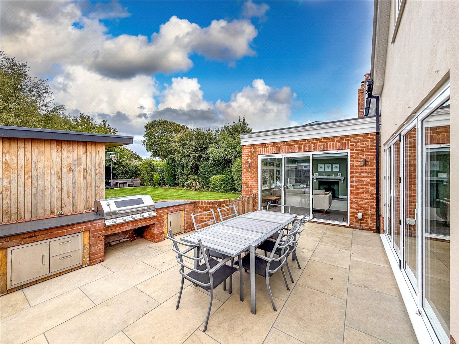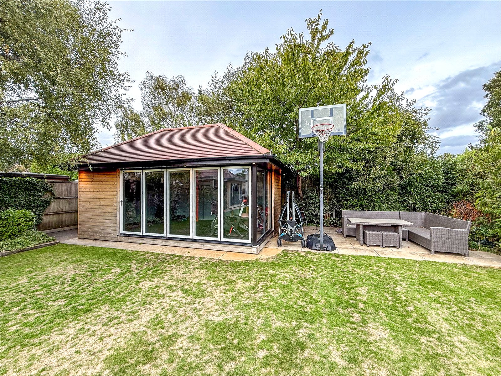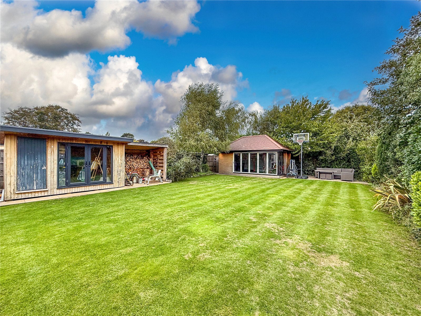 The rear garden is a key feature of this home. There is a patio area with an outdoor kitchen set up. The remainder of the garden is laid to lawn with some mature borders. There are TWO GARDEN CHALETS with power and internet.