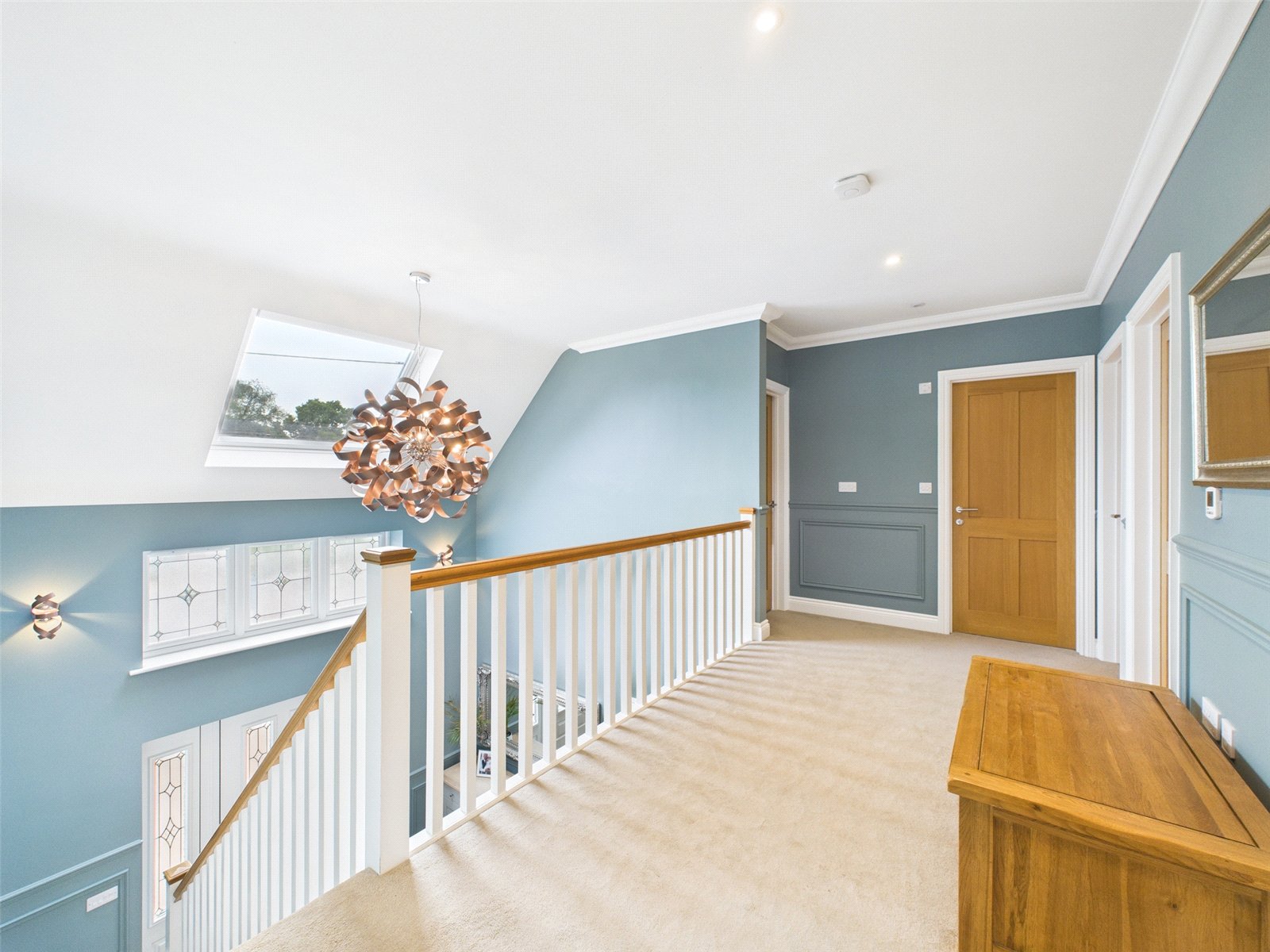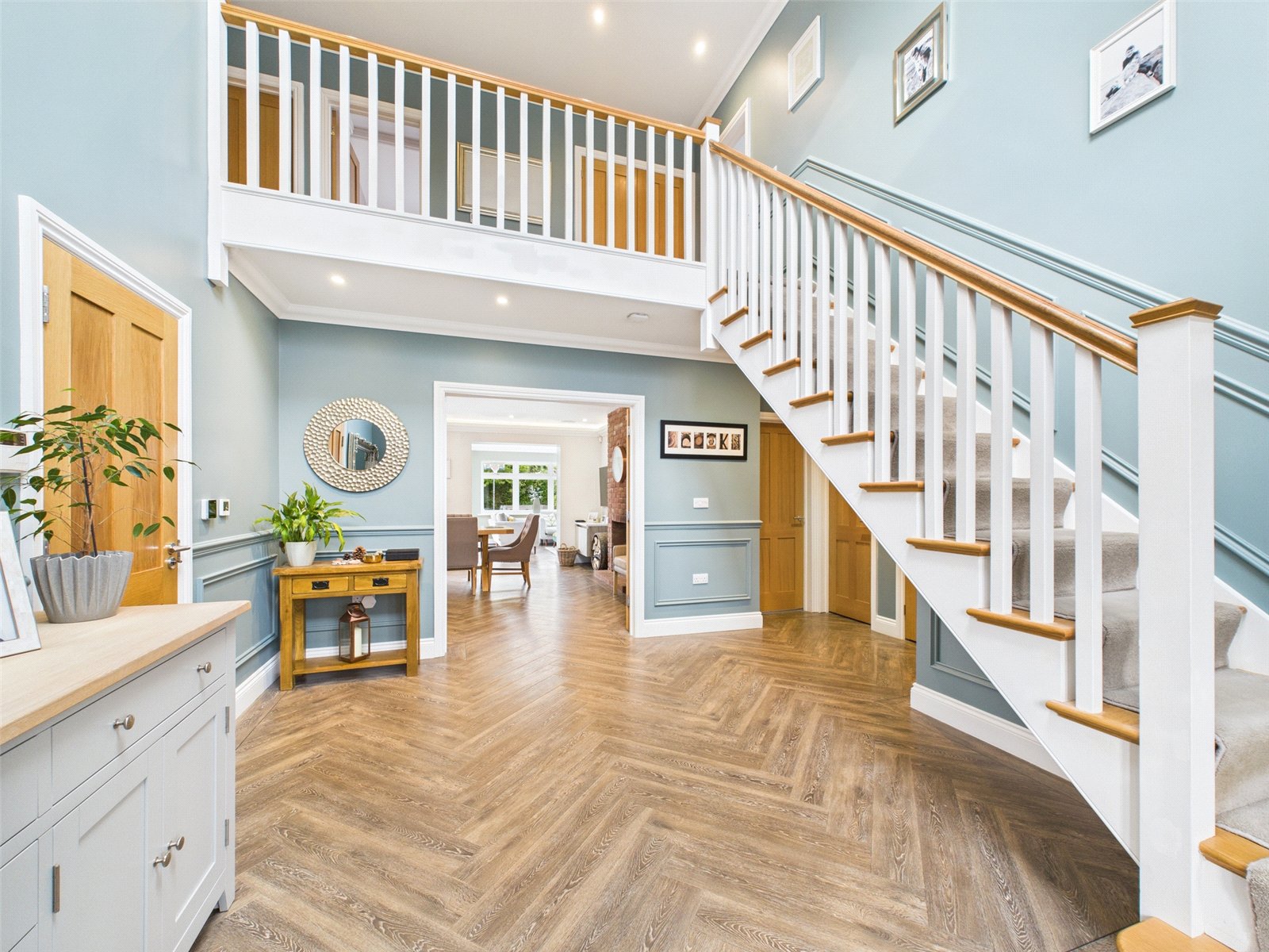 Stairs from the entrance hall lead to a galleried landing with airing cupboard. There are four double bedrooms on the first floor which all have built in storage. The main bedroom features a separate dressing area and ensuite. There is also a family bathroom.