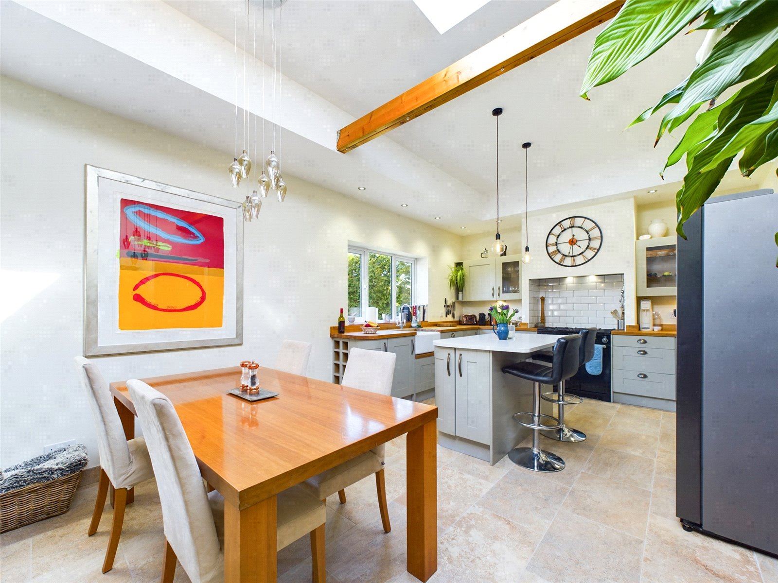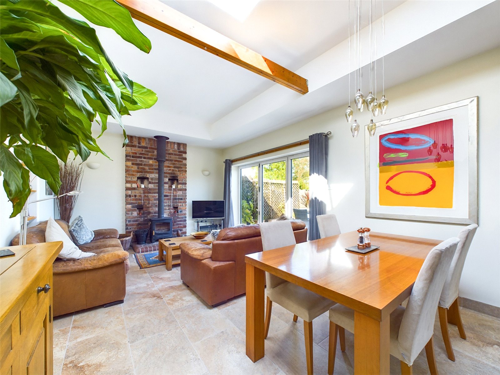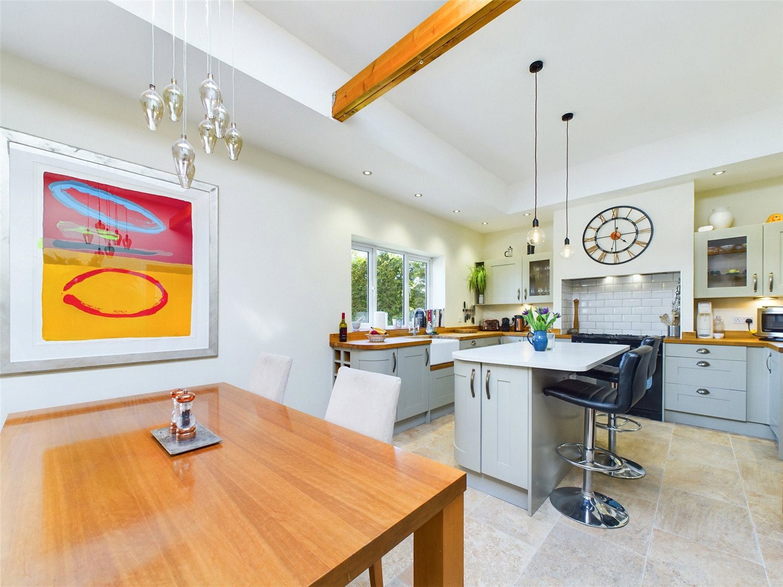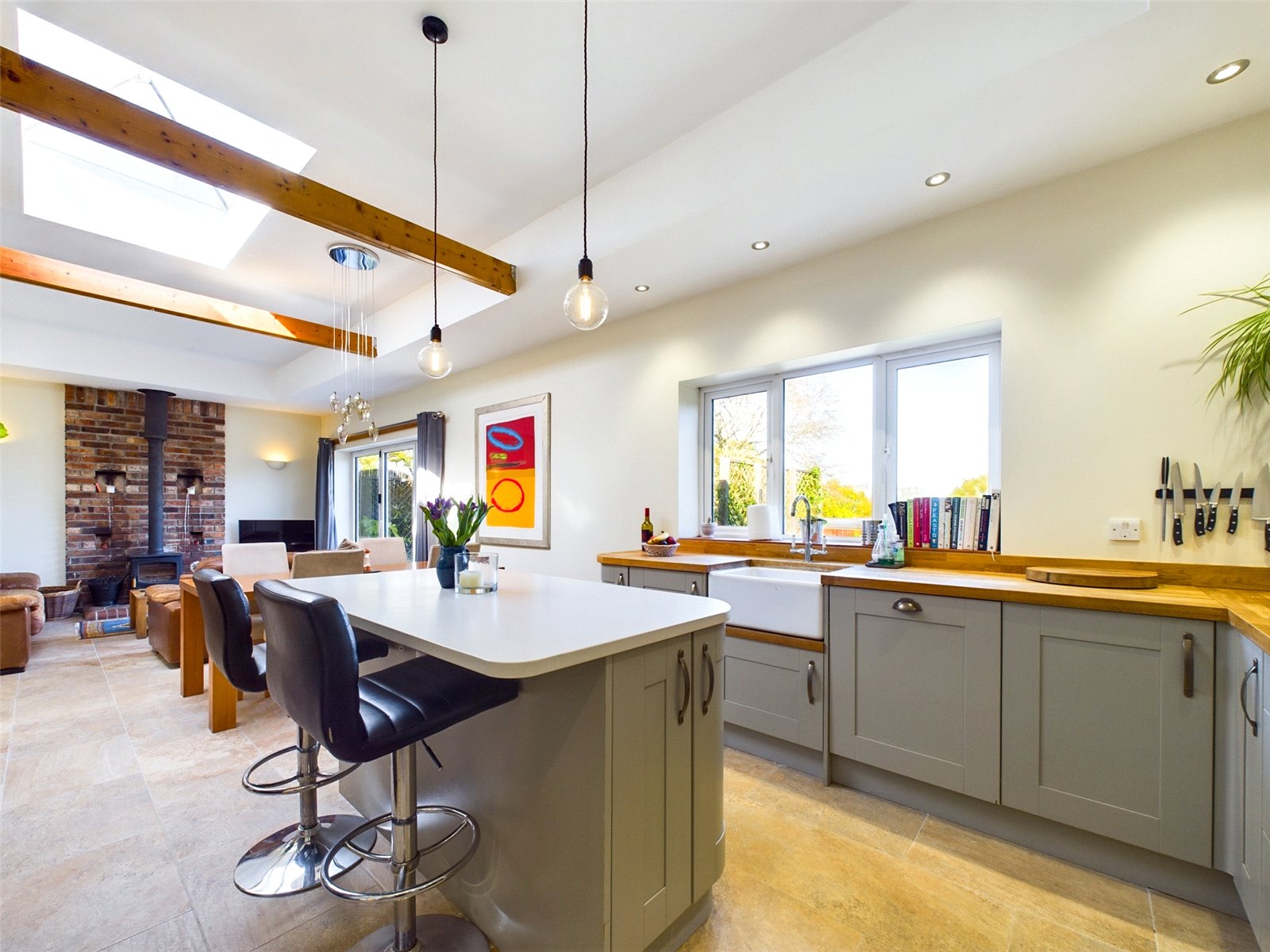 At the hub of the home the stunning open plan Living/Kitchen/Dining Room enjoys a delightful aspect over the rear Garden and adjacent fields beyond. It features a roof light, ceiling beam, inset downlighters and further feature pendant lighting. The sitting area enjoys and area of exposed brick wall with a feature wood burning stove and bi-fold doors to the Patio.