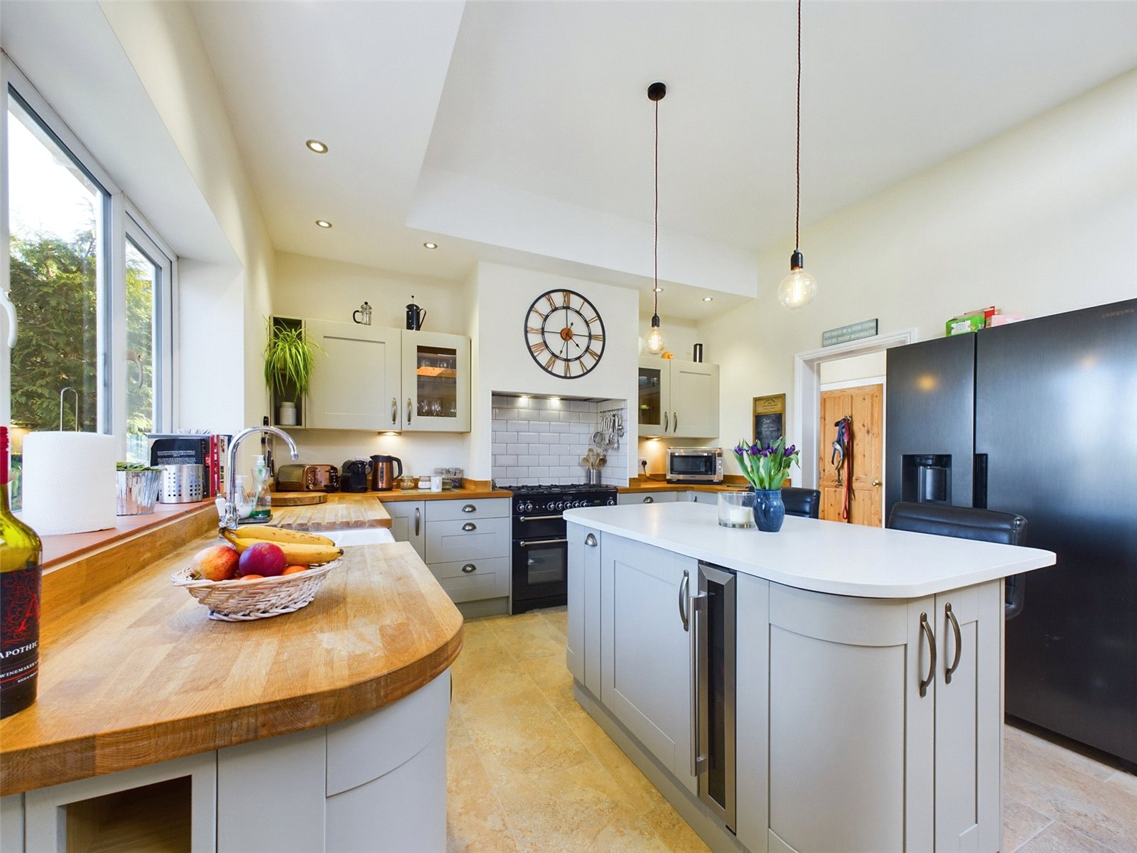 The tasteful Kitchen offers a comprehensive selection of cupboard and drawer units with a wooden work surface over and a centre island with a contrasting work surface. There is a recessed fitted Range style oven, a ceramic Butler style sink and a dishwasher. In addition there is a separate Utility Room and a useful Cloakroom.