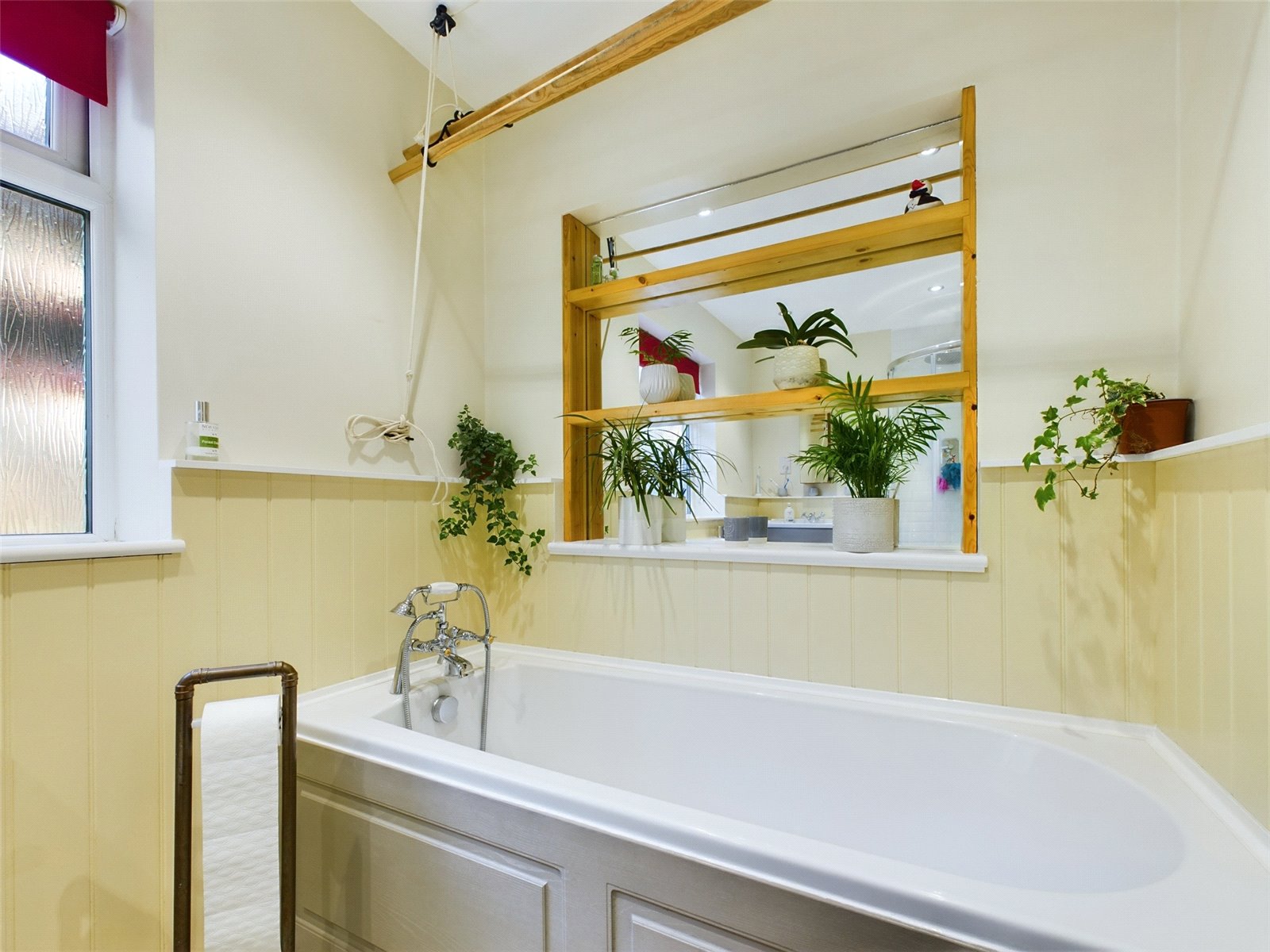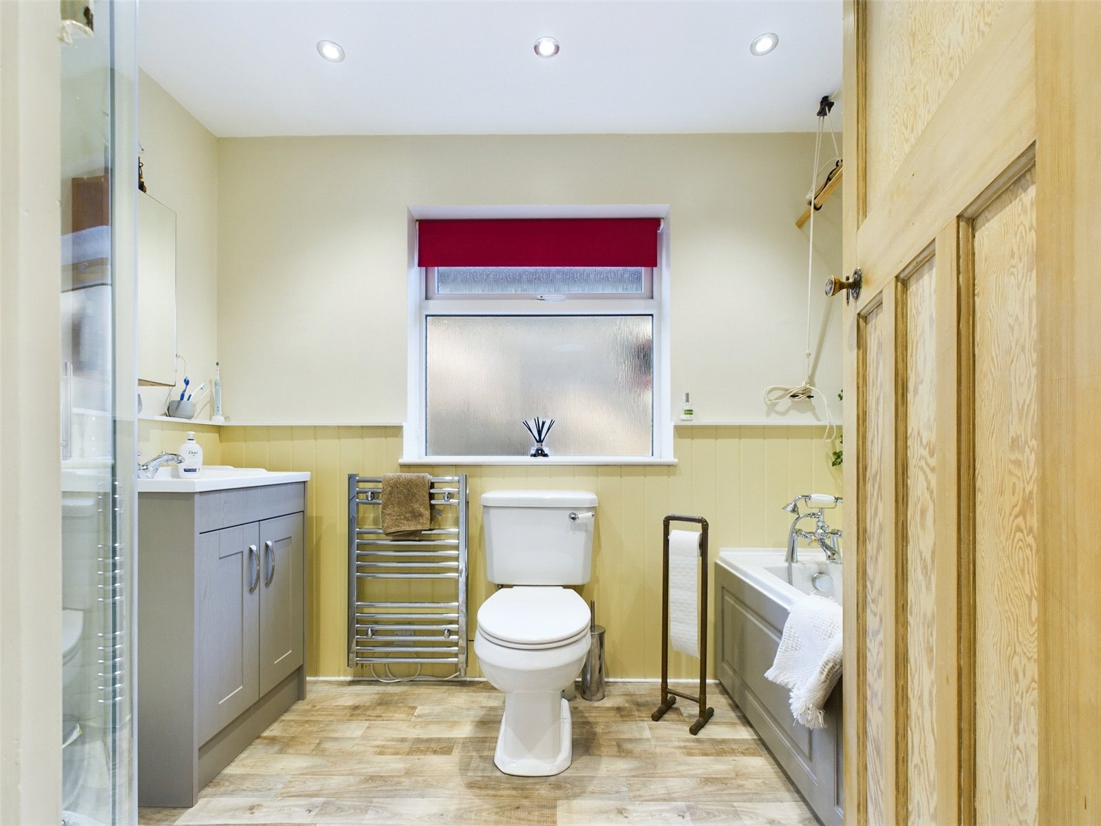 The Family Bathroom enjoys a matching white 4-piece suite incorporating both a panelled bath and a separate shower cubicle, further complemented by inset downlighters and an obscured window to the side.