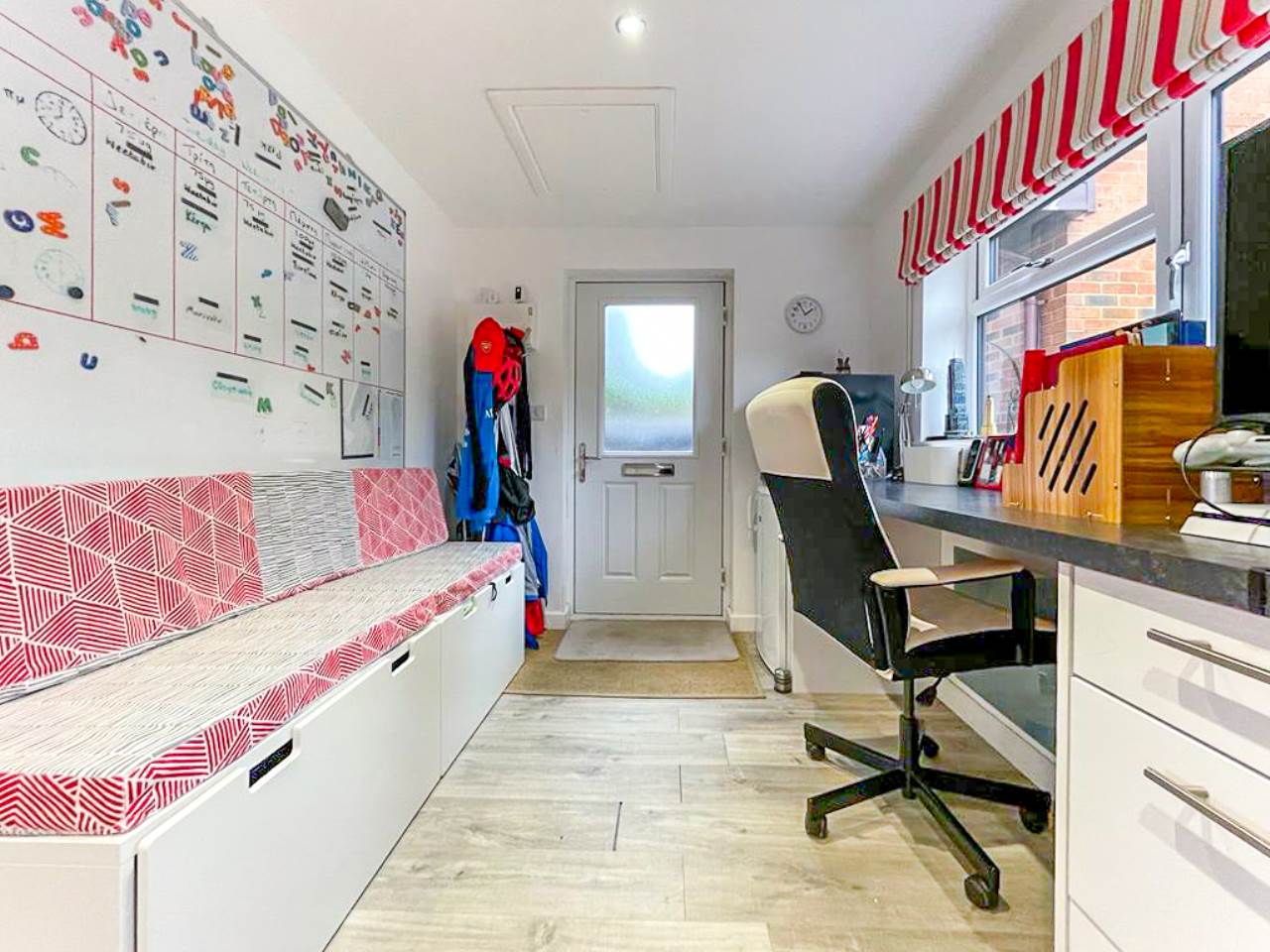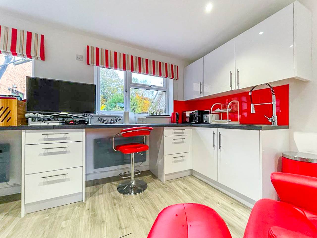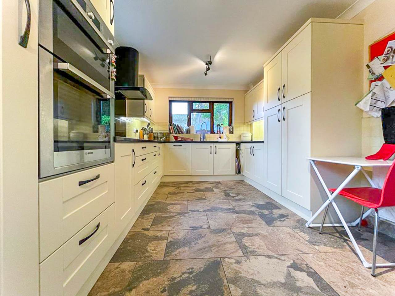 Modern fitted kitchen with oven, separate grill, hob with extractor, fridge and access to a separate utility room