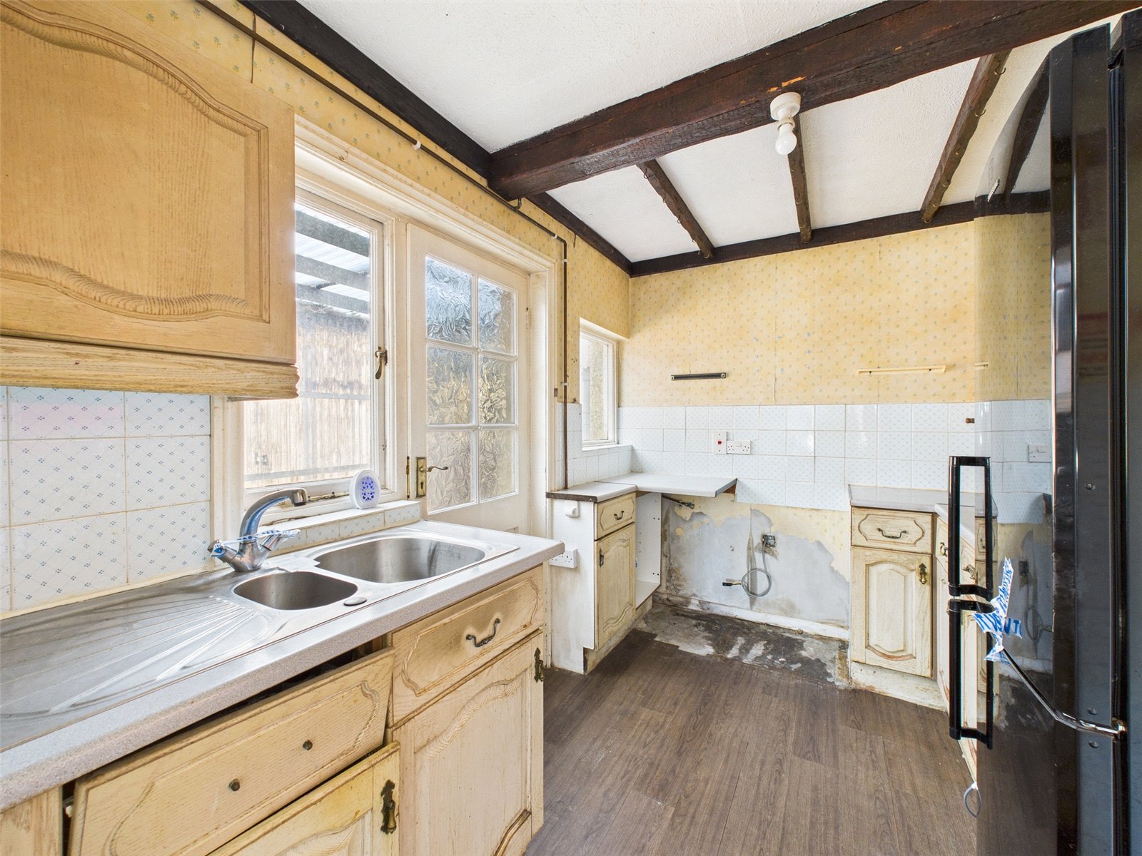 The kitchen is also located at the back of the home, currently fitted with basic units and providing access to the rear of the property. Beyond the kitchen, there is a useful storage room or potential utility area, which could be integrated into a larger kitchen extension or repurposed for practical use.