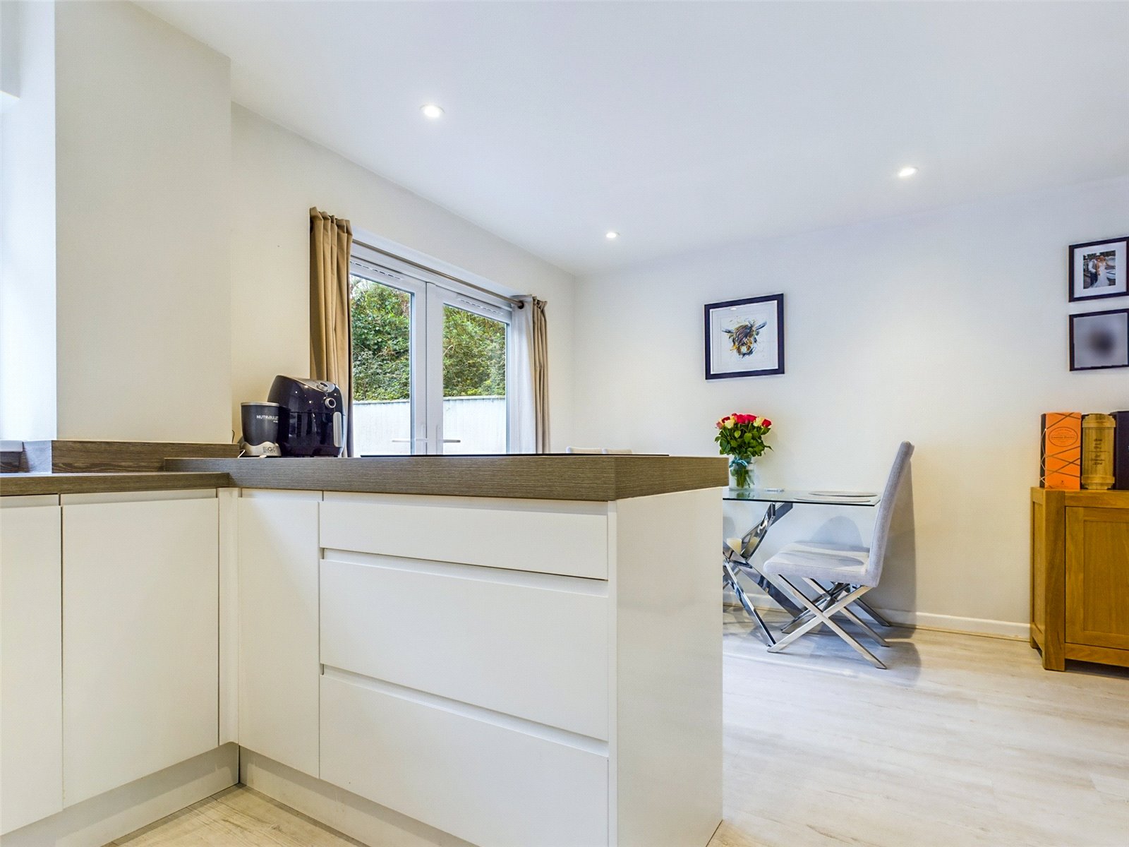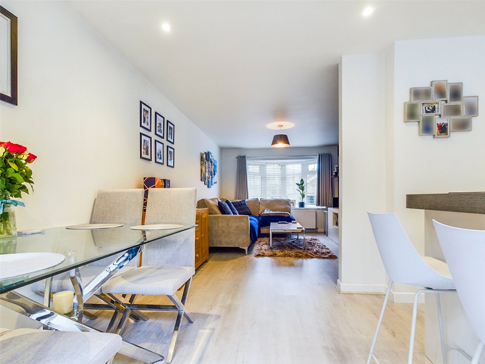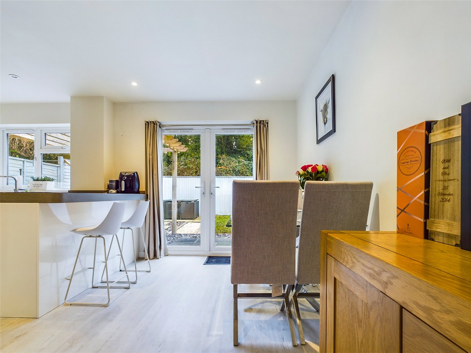 The open plan kitchen diner / living room is light airy due to its dual aspect. Modern white kitchen comprising eye and base level units with cupboards, drawers and a breakfast bar. Integrated appliances include fridge freezer, double oven, washing machine, and electric hob. There is space for a dining table and chairs, and patio doors leading out to the garden.