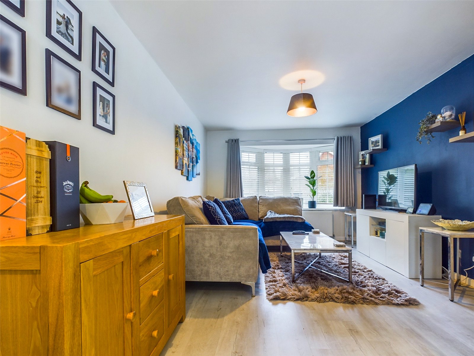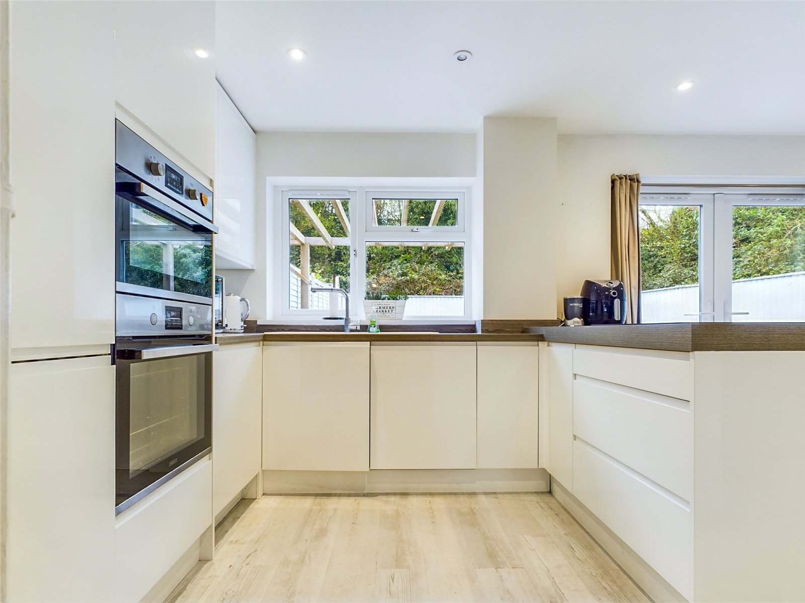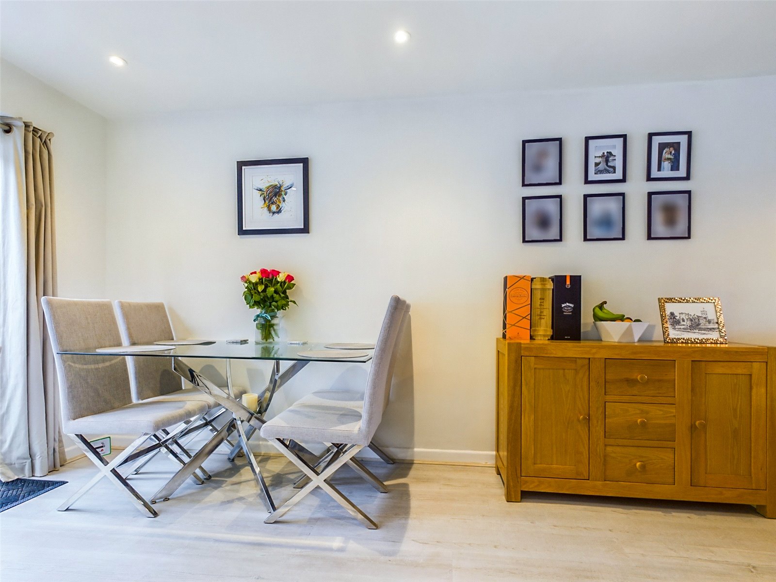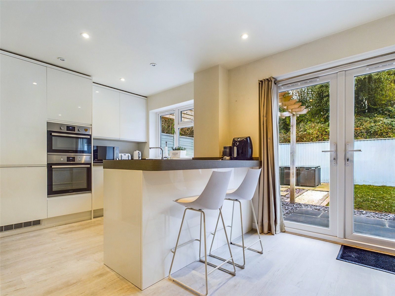 The open plan kitchen diner / living room is light airy due to its dual aspect. Modern white kitchen comprising eye and base level units with cupboards, drawers and a breakfast bar. Integrated appliances include fridge freezer, double oven, washing machine, and electric hob. There is space for a dining table and chairs, and patio doors leading out to the garden.