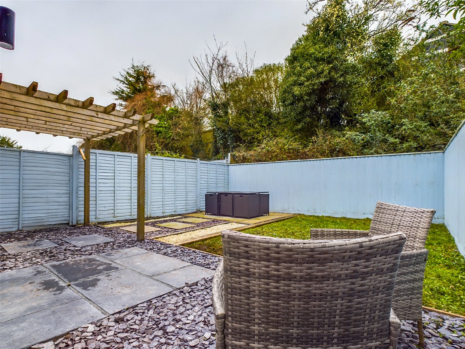 Low maintenance, private rear garden, bound by fence. partly laid to lawn with two patios and the remainder laid to slate chippings. Solid wood constructed Pergola and useful space down one side for storage.