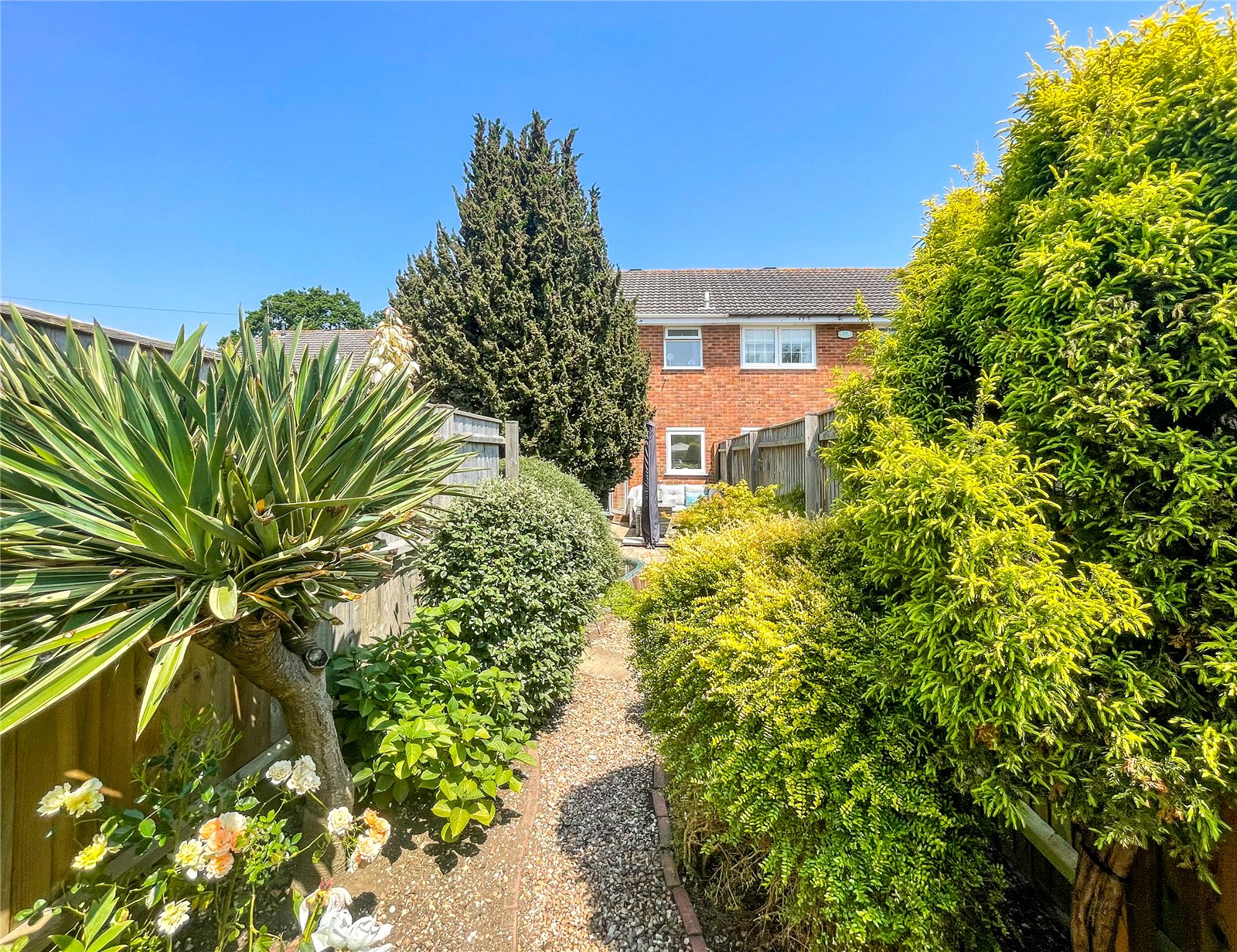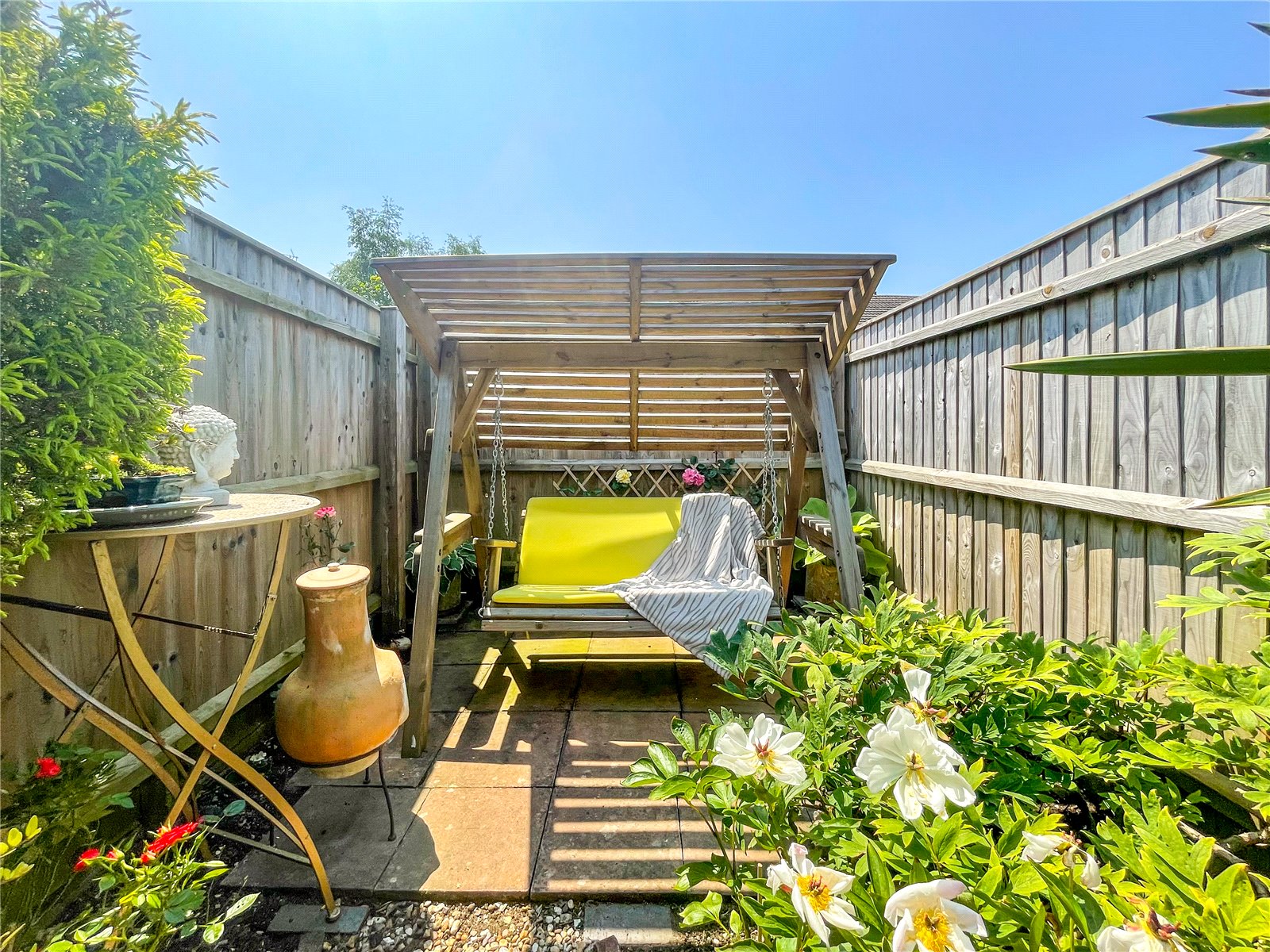 The beautiful rear Garden is delightfully stocked with a fine selection of shrubs and flowers and offers various attractive seating areas along with a pond.