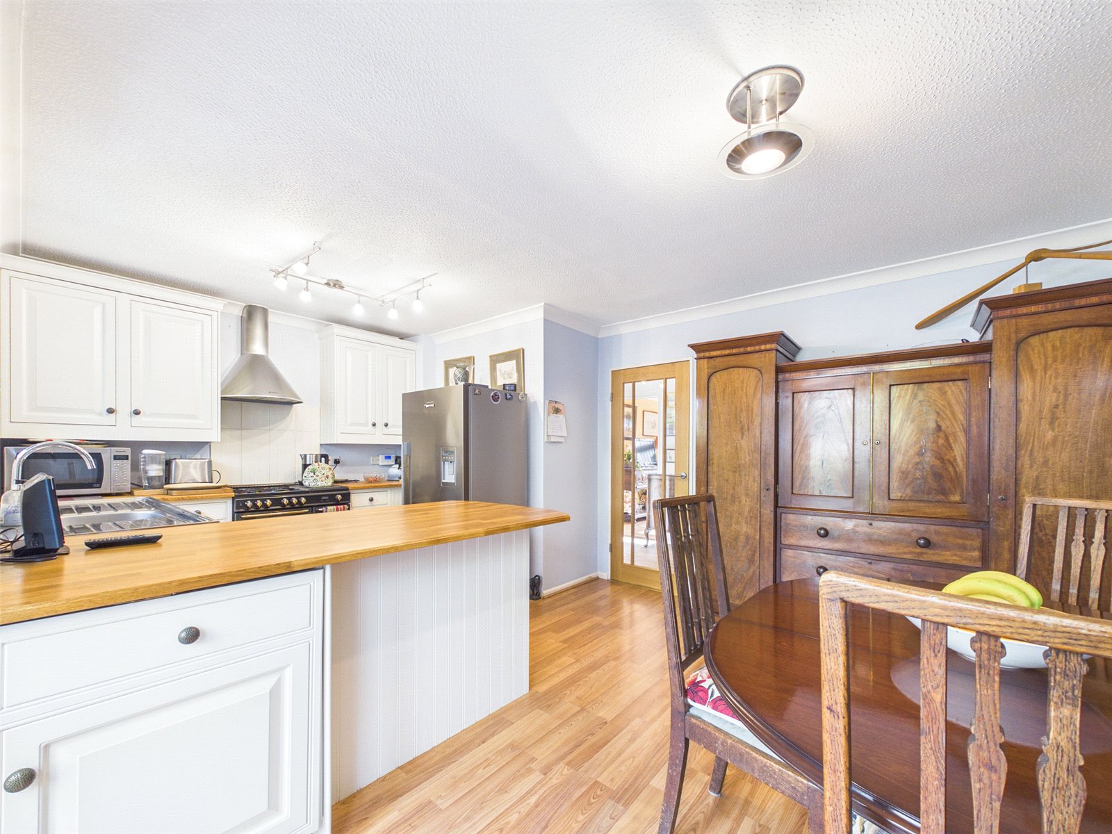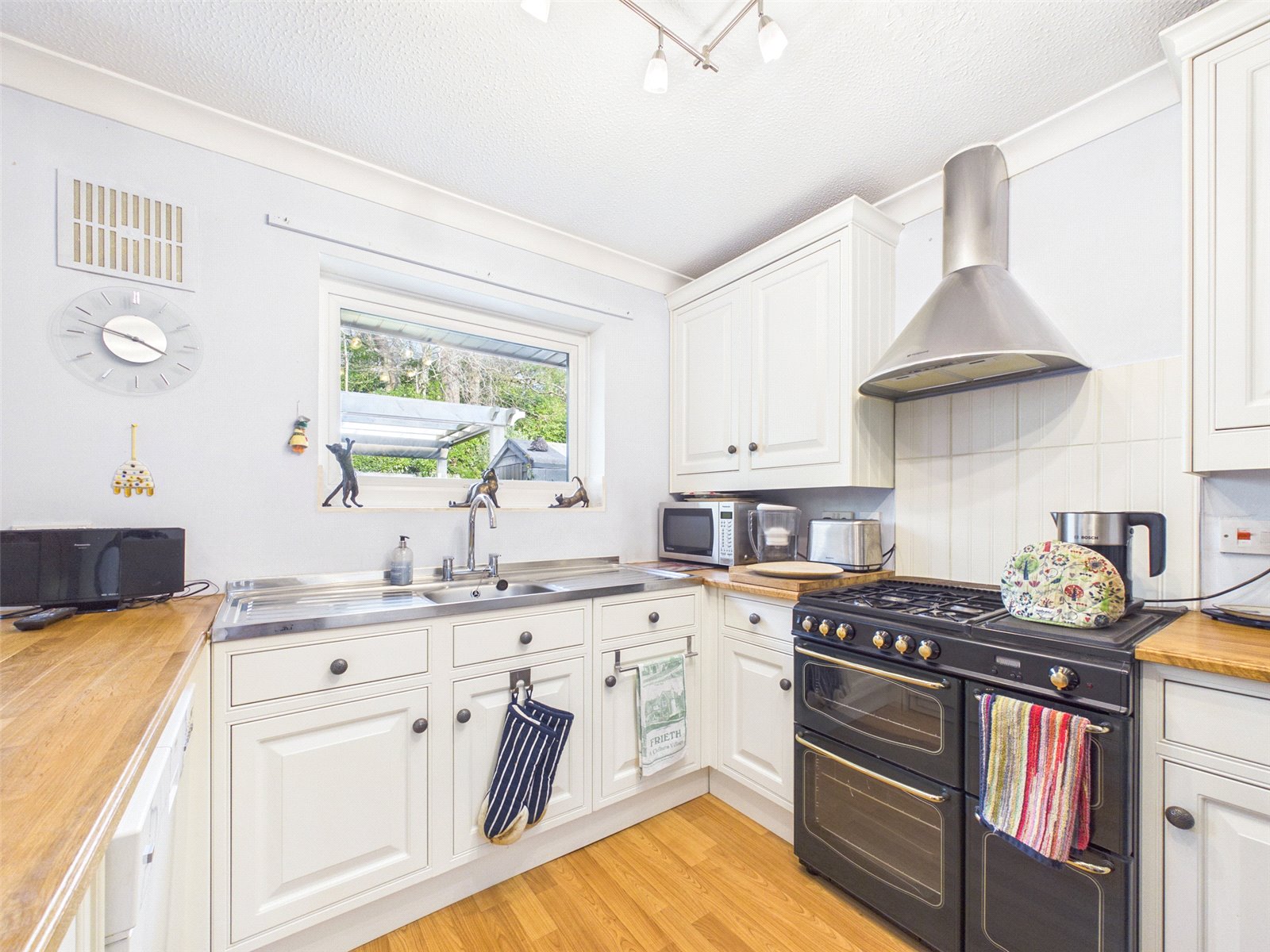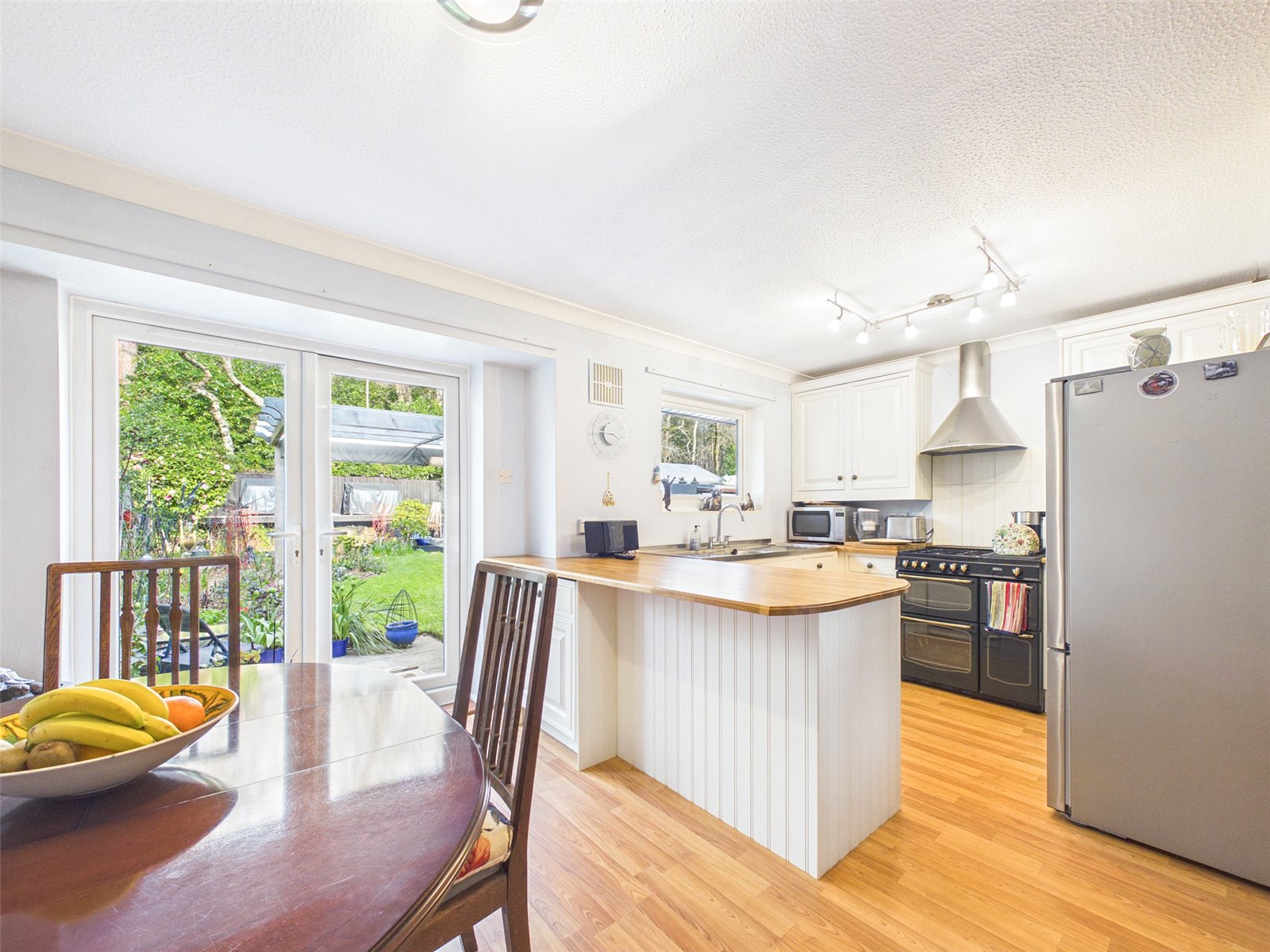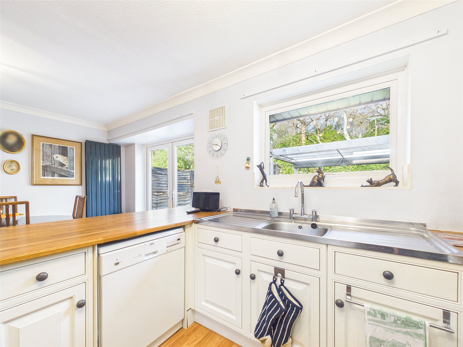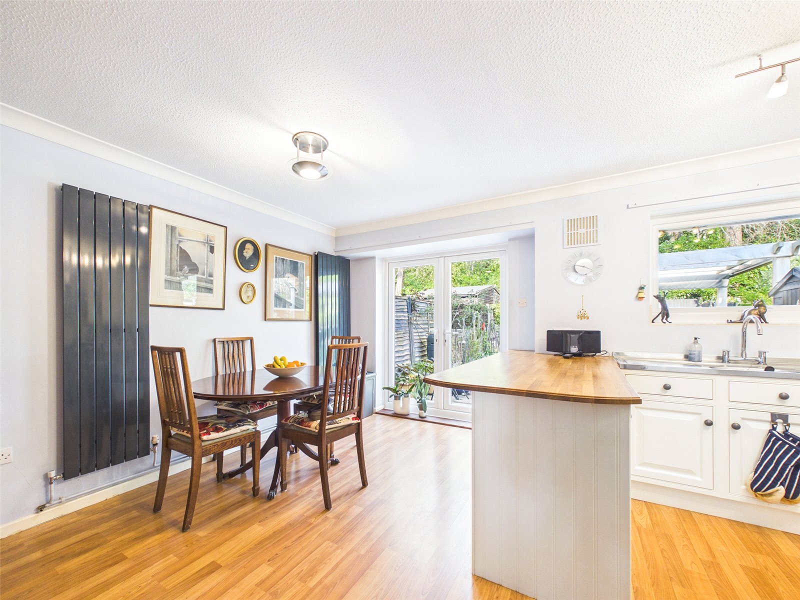 The Kitchen/Dining Room has a pleasant outlook to the rear and French doors providing external access. There is a large selection base and eye level units, complemented by a wooden work surface. Further benefits include vertical radiators and wooden flooring