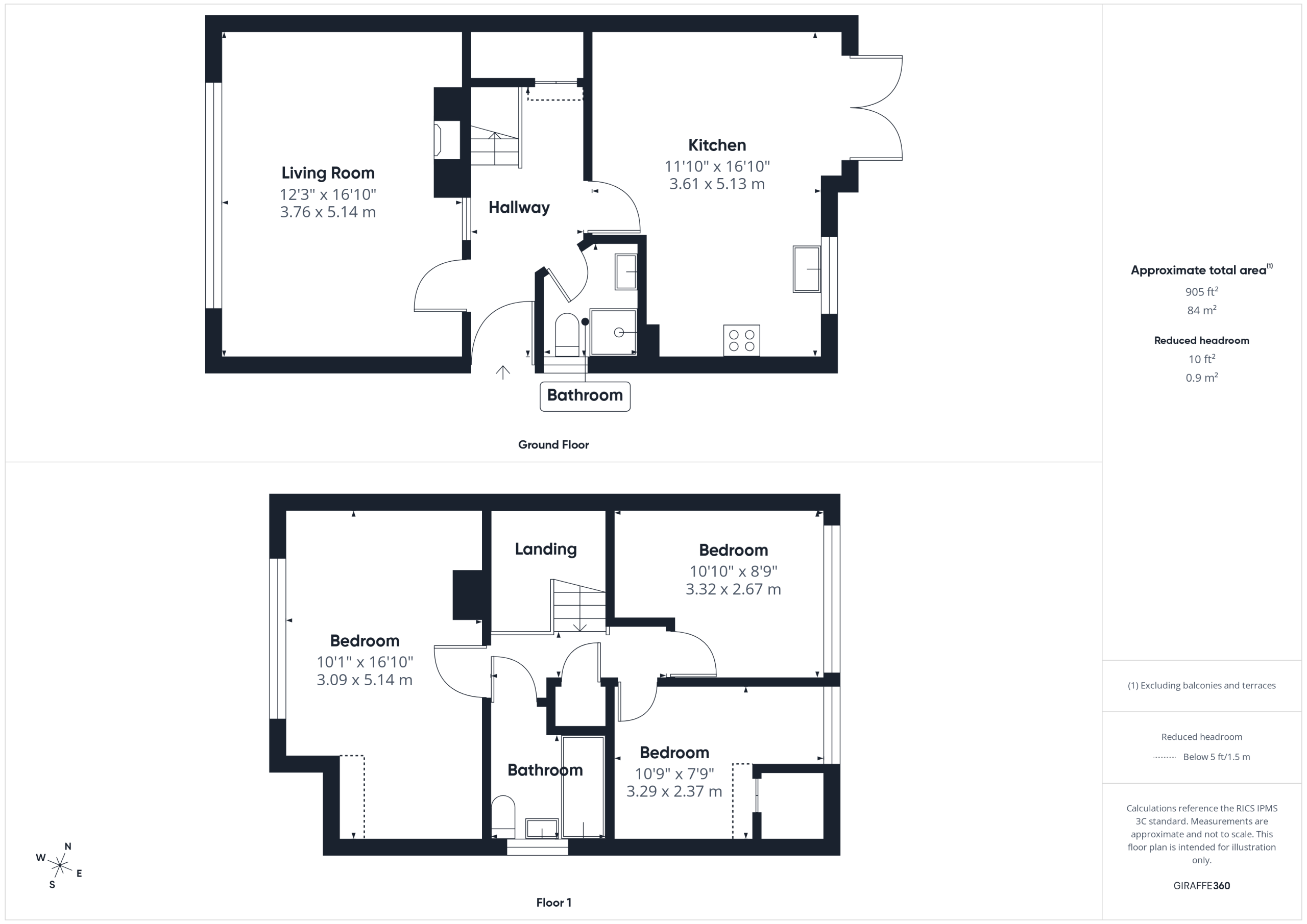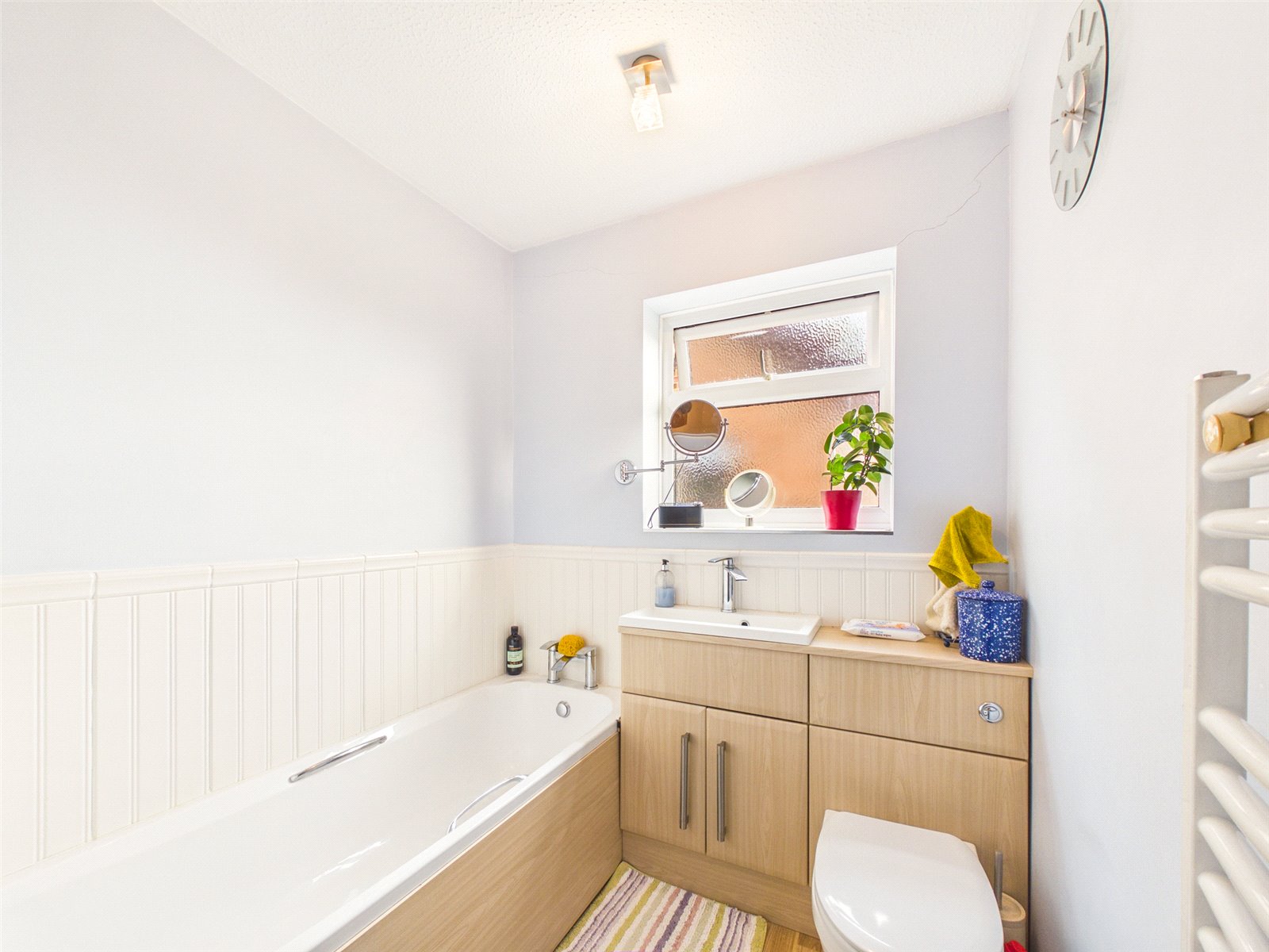 The family Bathroom has a frosted window to the rear and is complemented by part tiled walls and a heated towel rail.