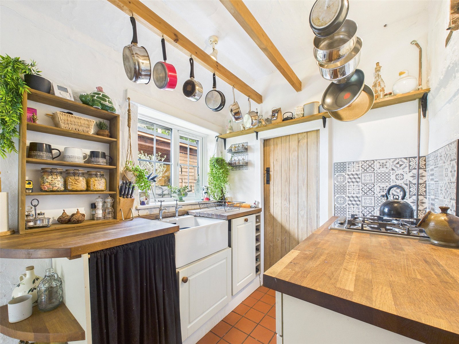 The Kitchen which enjoys a pleasant outlook over the rear Garden features wooden worksurfaces incorporating a 'Butler' style sink and ceiling racks for pots and pans. A lobby leads to the rear door where the is also a Larder cupboard.