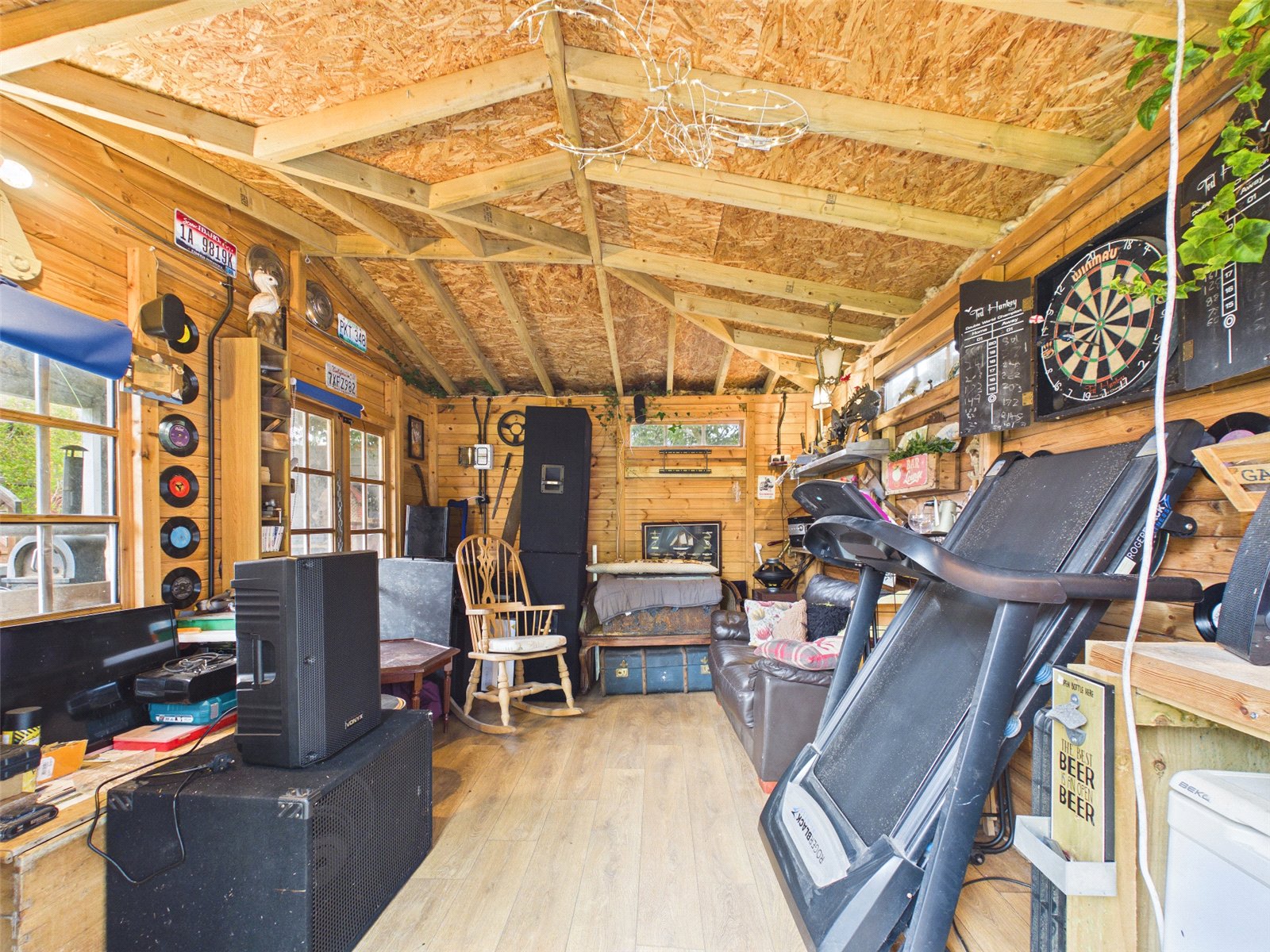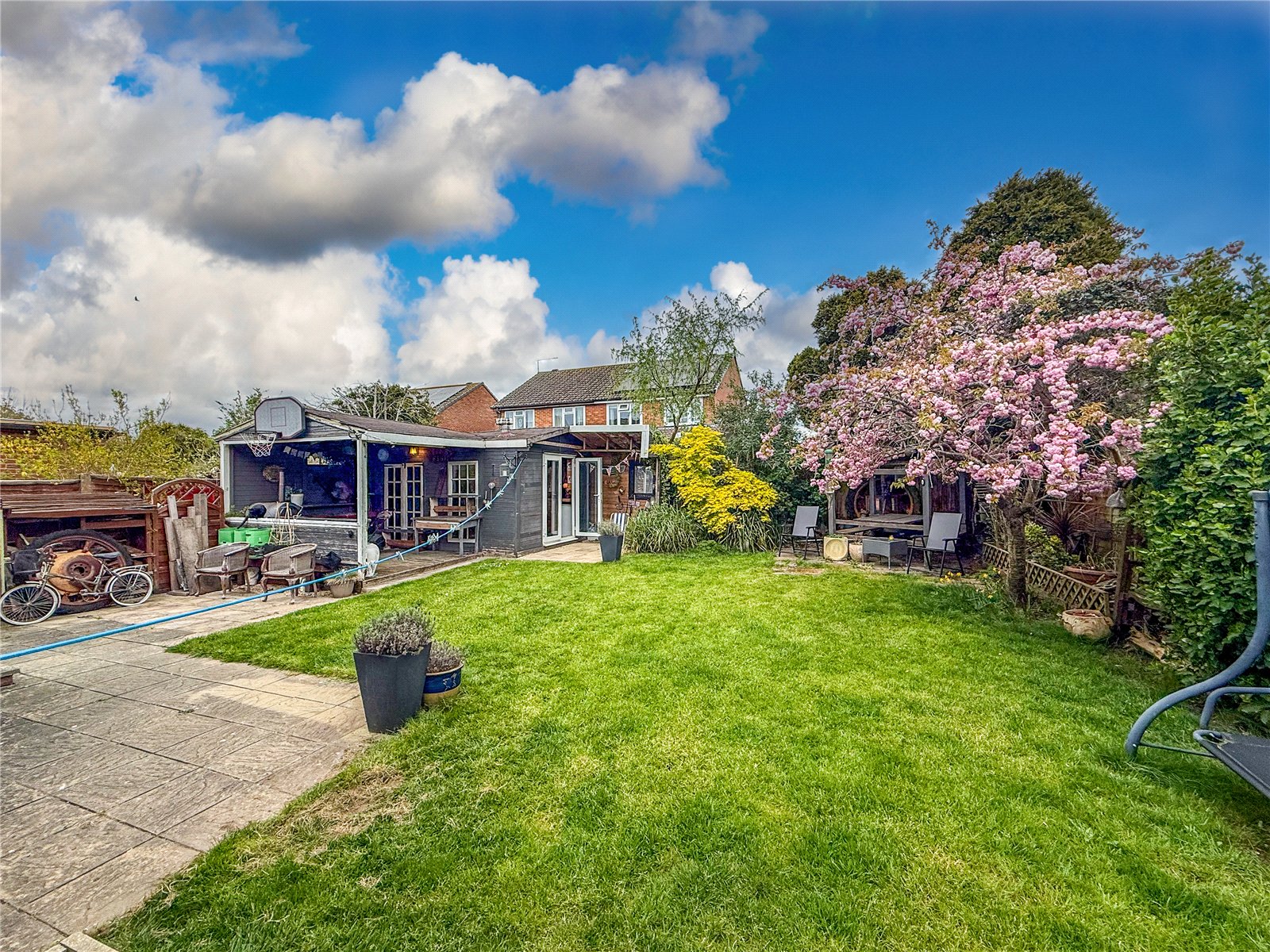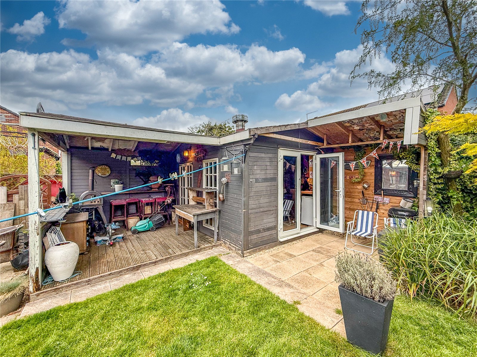 The rear garden features sections of lawn, patio and decking. There is a GARDEN CHALET at the end of the garden.