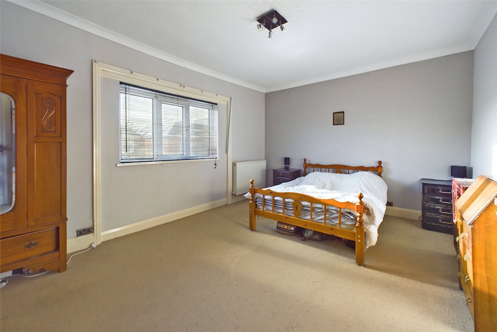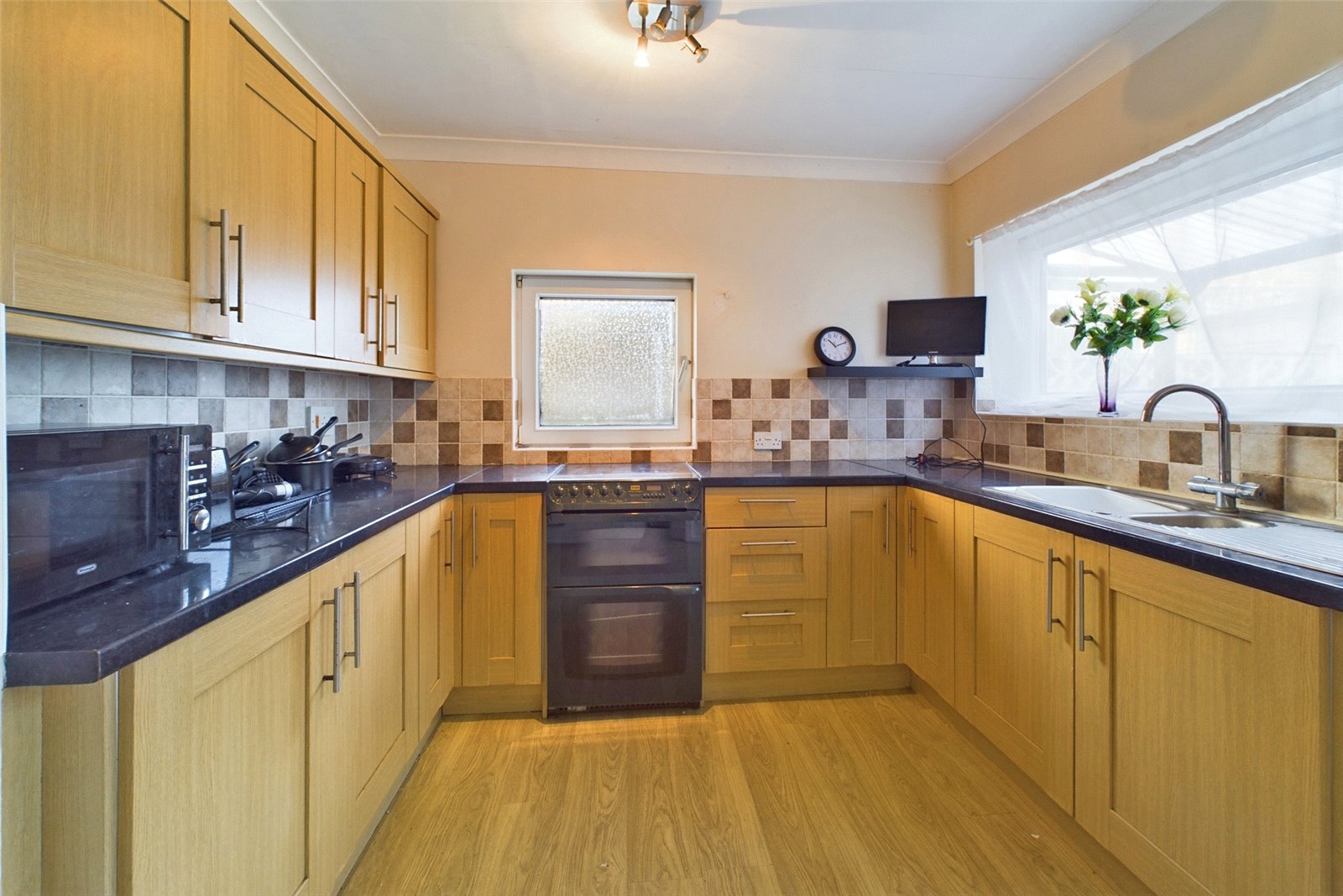 The kitchen has side and rear aspect windows and a door leading out to the rear garden. It has wood effect flooring to match the dining room and is fitted with a range or eye and base level cupboards, also offering space for a freestanding cooker and fridge/freezer.