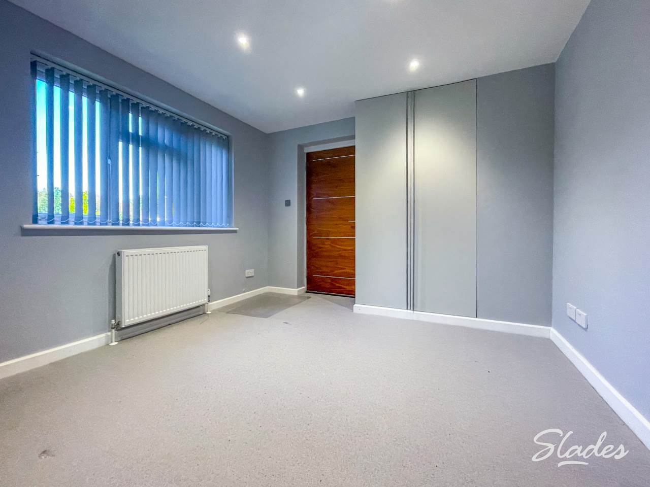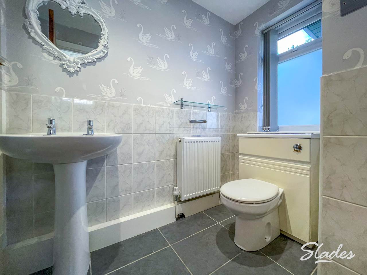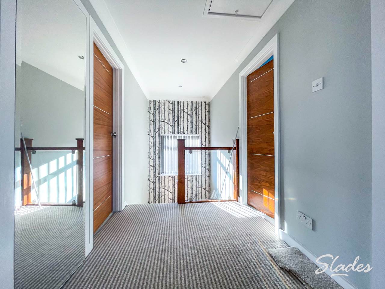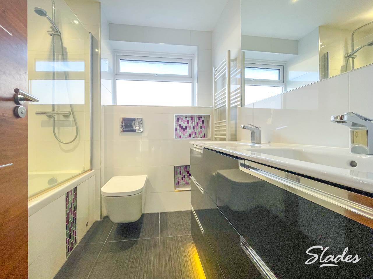 Upstairs, the home features a double master bedroom with mirrored wardrobes, a second double bedroom also with mirrored wardrobes, and two further good-sized single bedrooms. A high-spec white bathroom suite with a shower over the bath completes the upstairs accommodation.