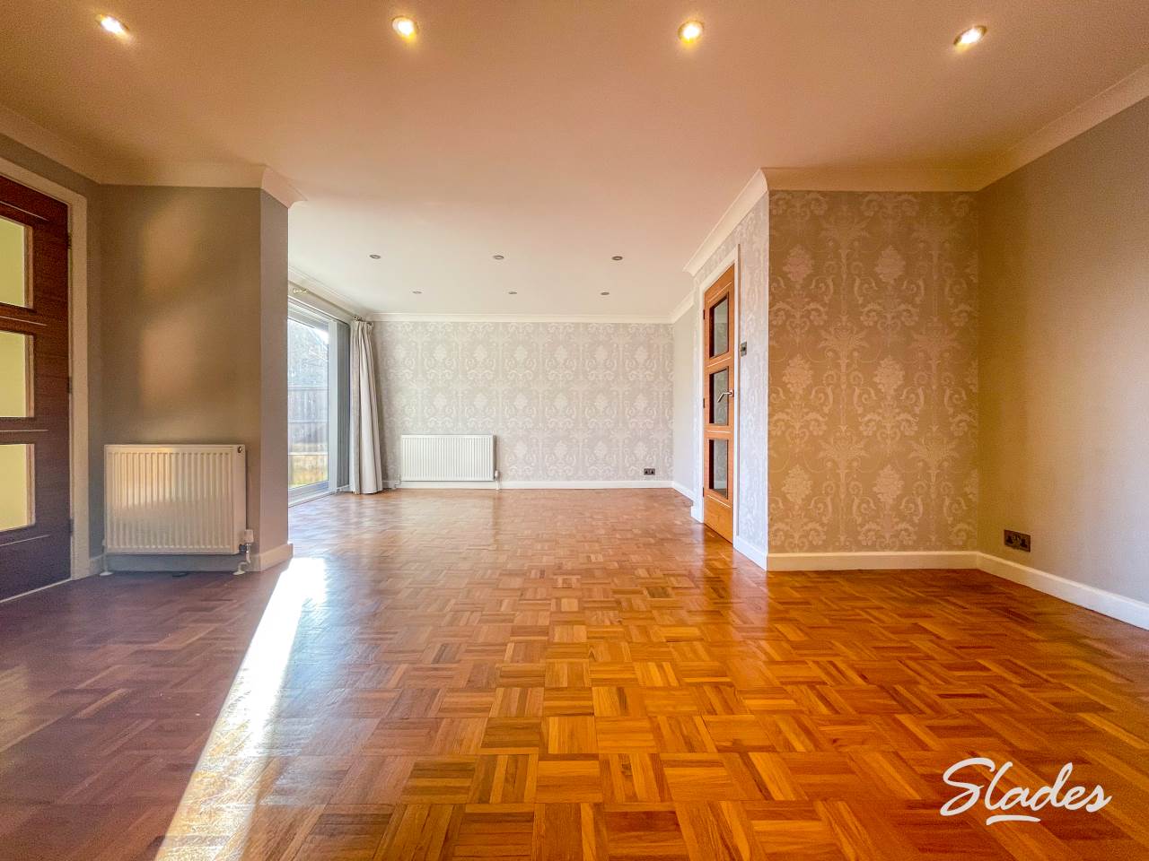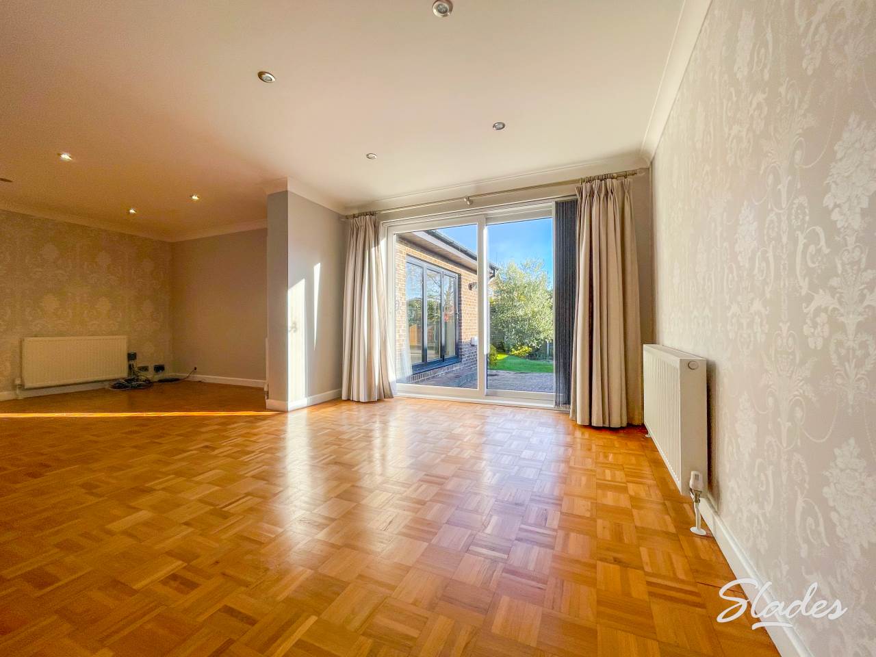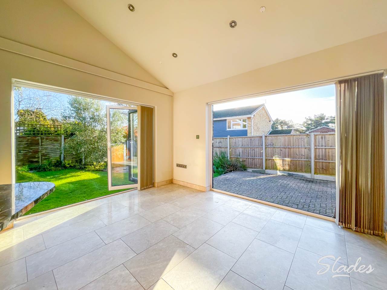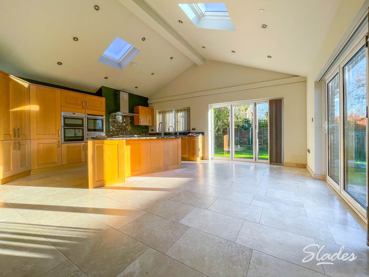 The property offers spacious family living accommodation, including a large open-plan lounge and dining area with sliding patio doors opening onto the garden, and an impressive modern fitted kitchen and family room with vaulted ceilings, integrated appliances, and a central island. Two sets of bi-folding doors from the kitchen provide direct access to the garden, creating a light and open feel. There is also a further reception room which can serve as a fifth bedroom, along with a downstairs WC and modern stair lighting.