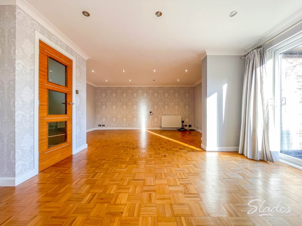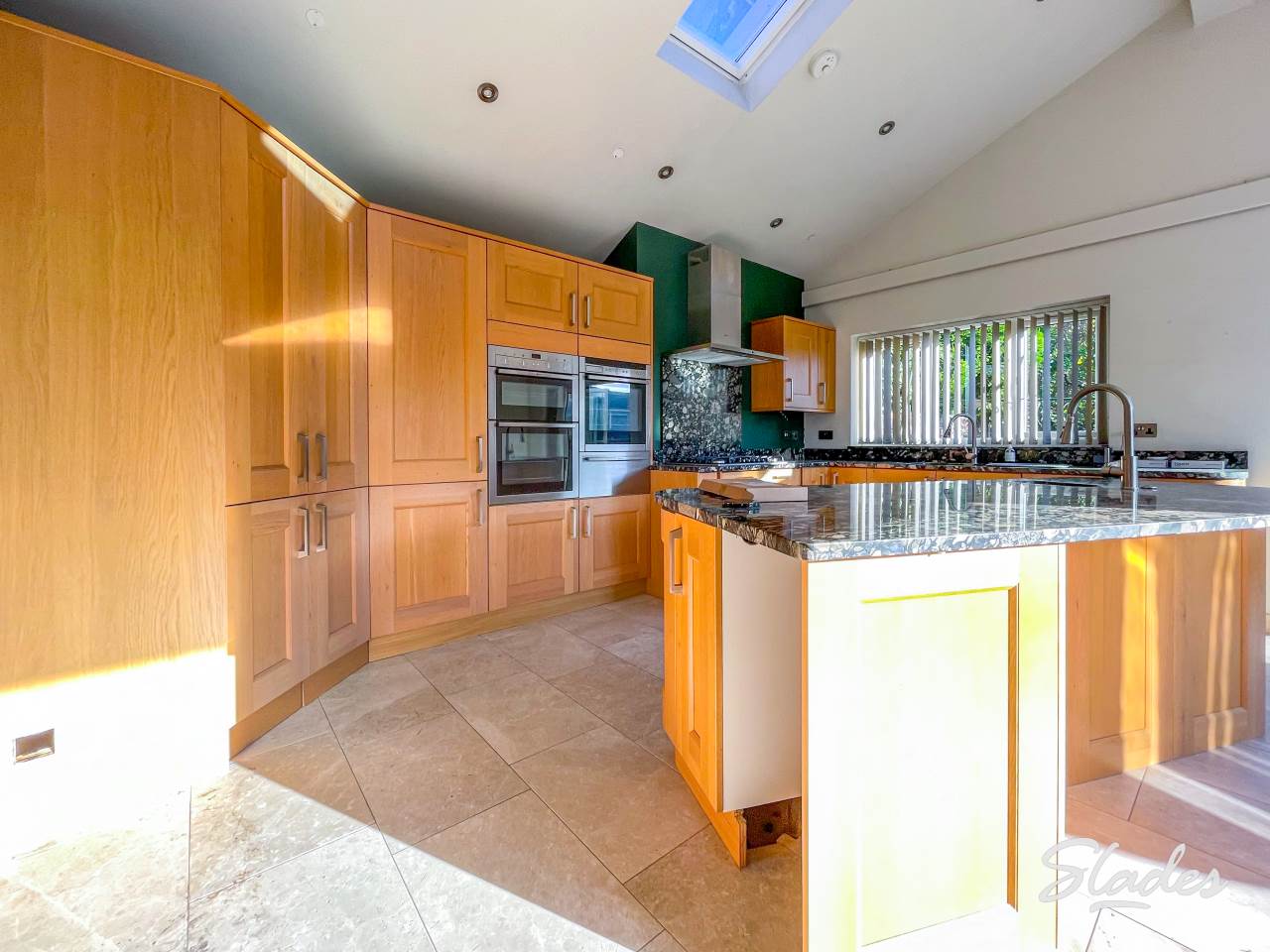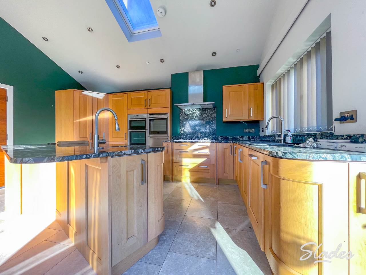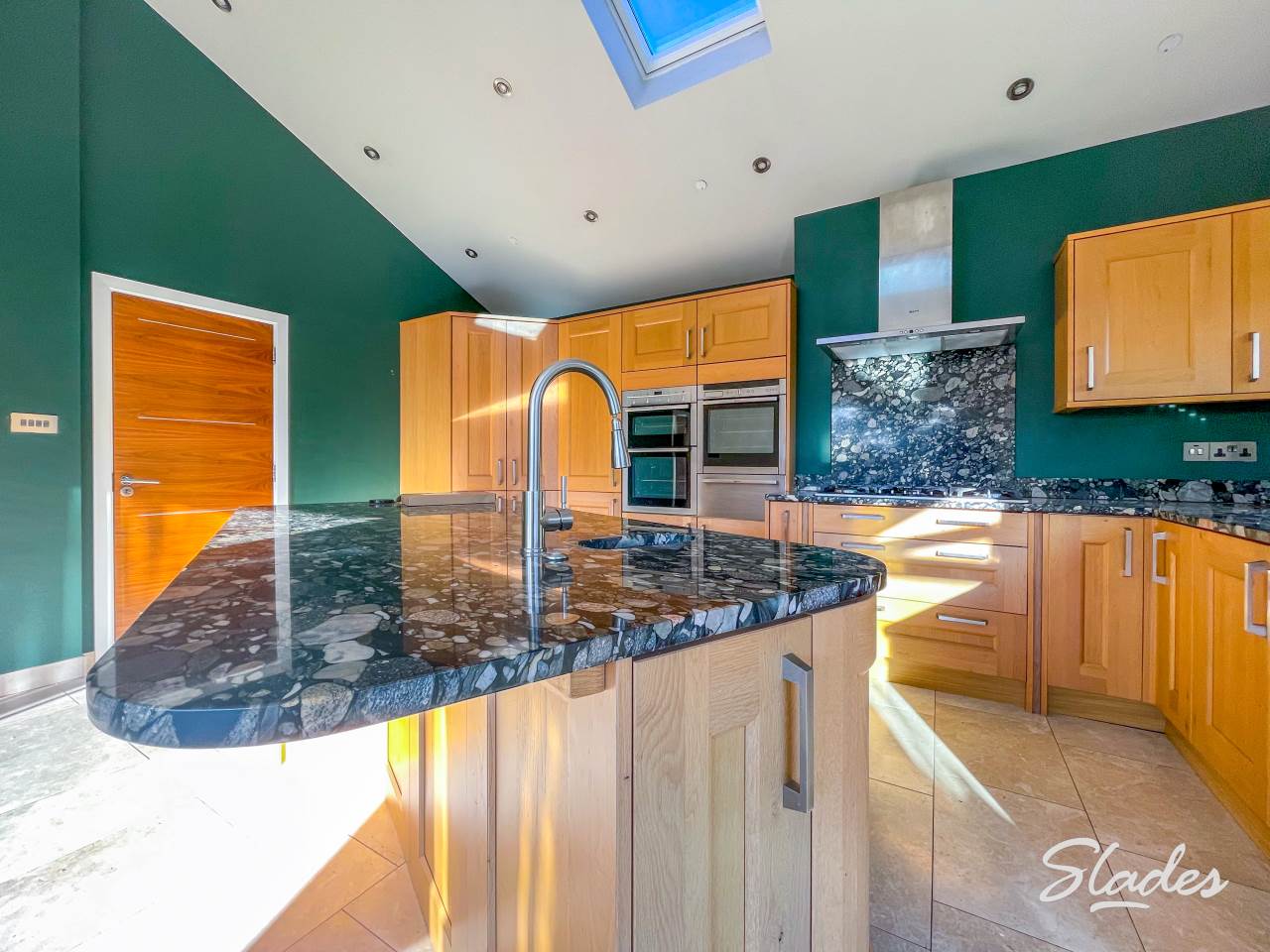 The property offers spacious family living accommodation, including a large open-plan lounge and dining area with sliding patio doors opening onto the garden, and an impressive modern fitted kitchen and family room with vaulted ceilings, integrated appliances, and a central island. Two sets of bi-folding doors from the kitchen provide direct access to the garden, creating a light and open feel. There is also a further reception room which can serve as a fifth bedroom, along with a downstairs WC and modern stair lighting.