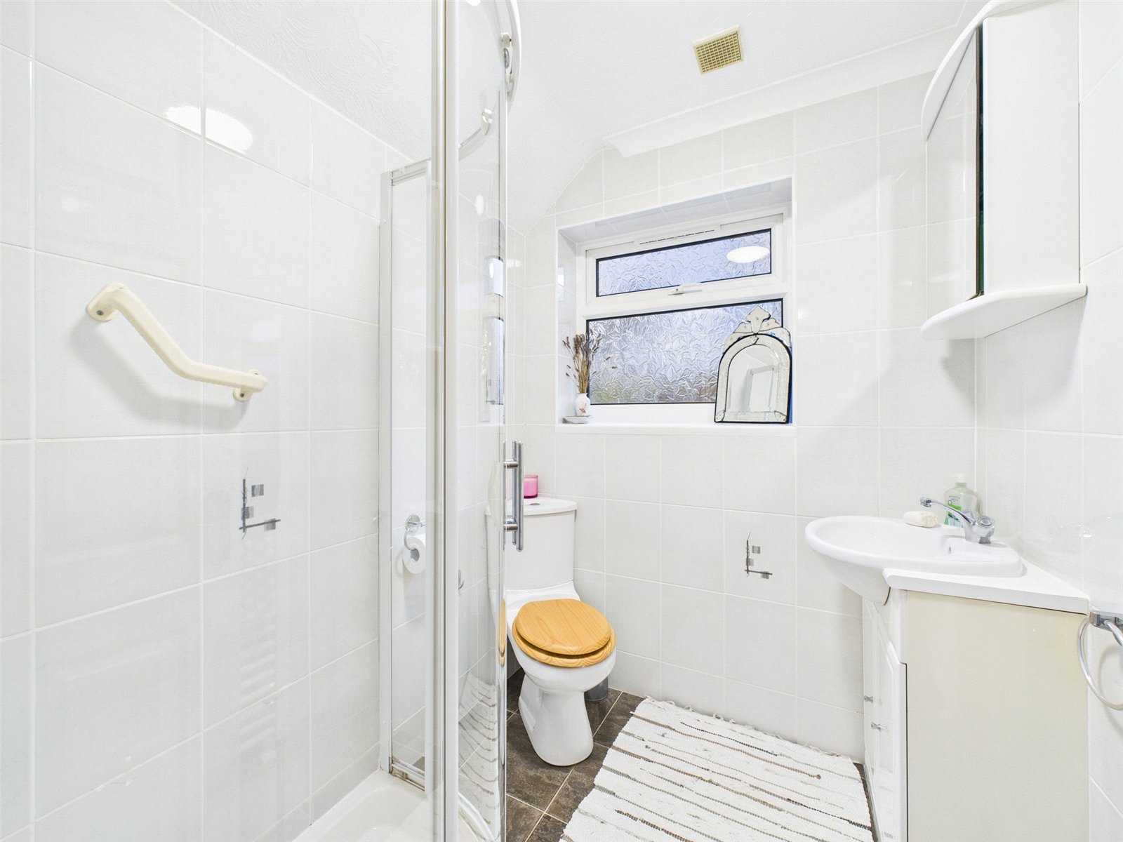 The bathroom is well-positioned off the hallway and features a modern suite, providing everything needed for comfortable living.