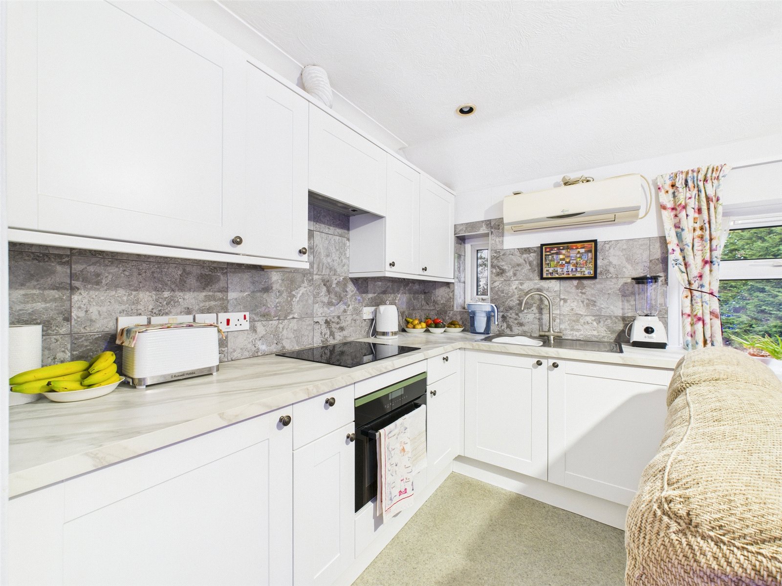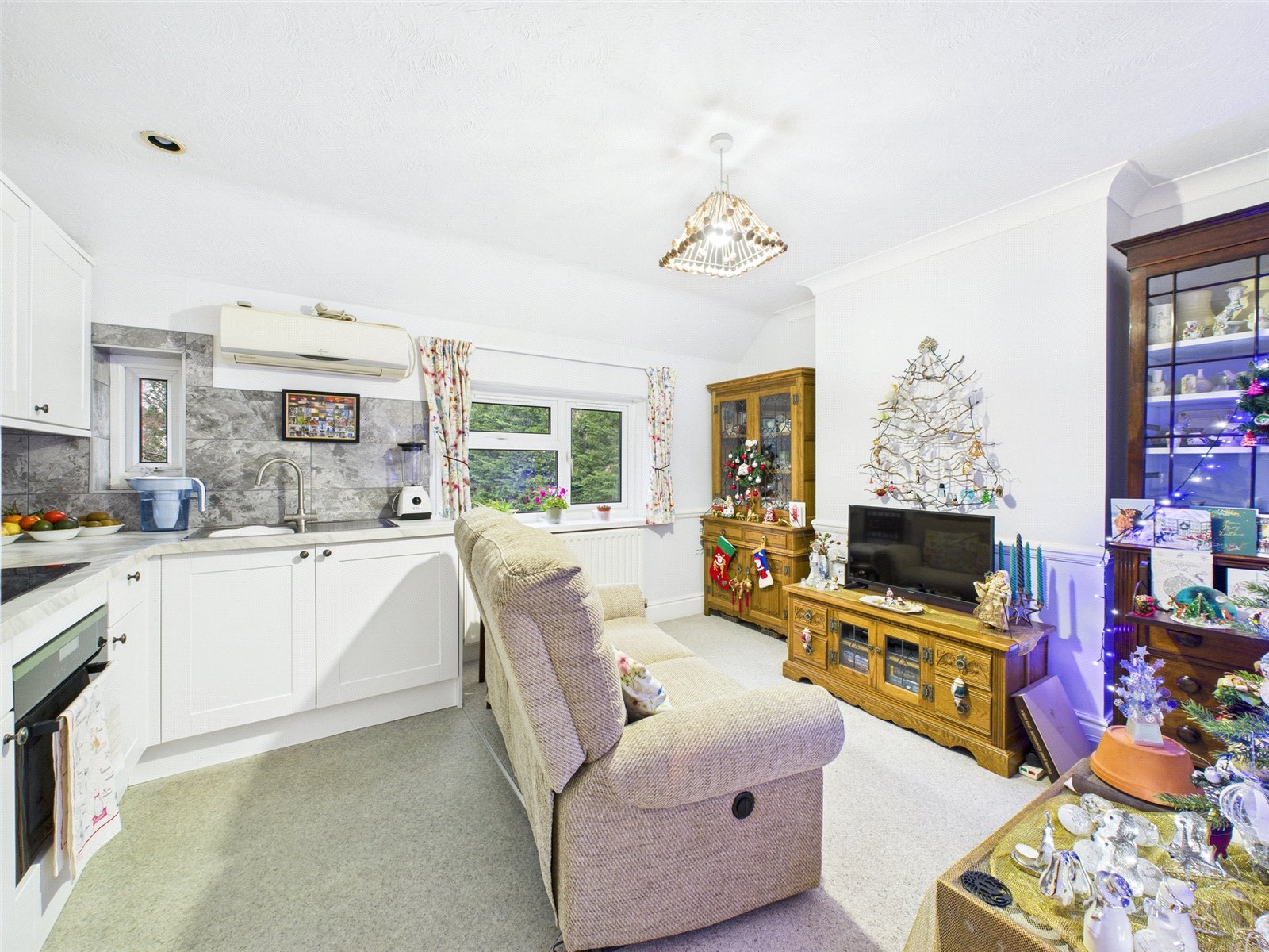At the top of the stairs, the layout opens into a bright and well-proportioned kitchen/living area. This is a sociable and functional space, ideal for both relaxing and entertaining, with ample room for a comfortable seating area and dining table. The kitchen is neatly arranged and offers good worktop space and storage, making it practical for day-to-day living.