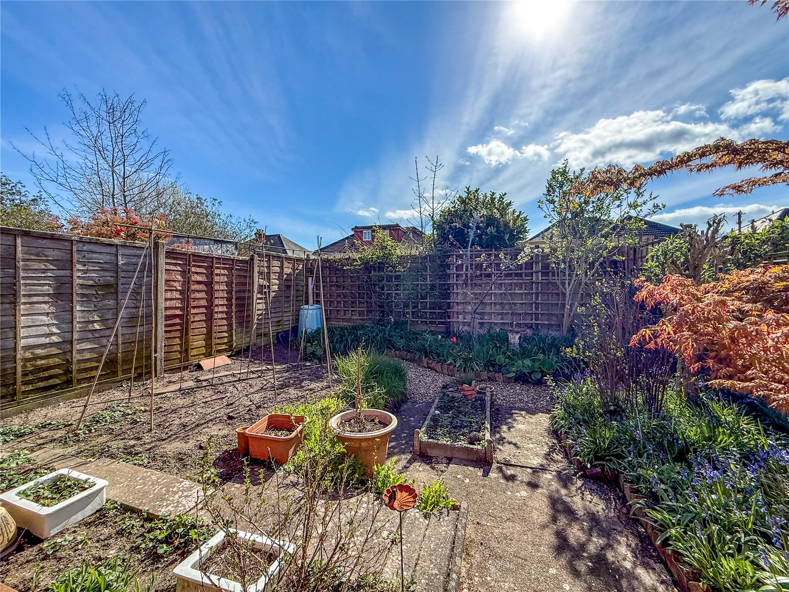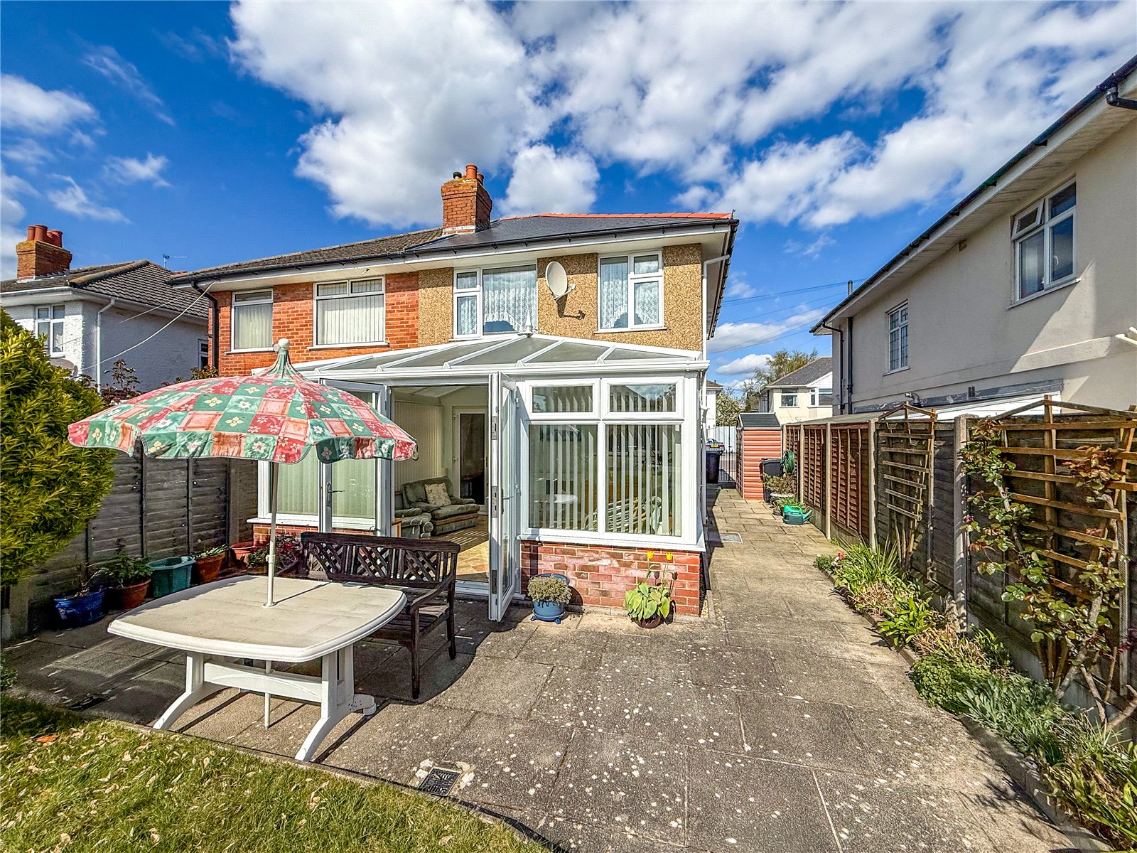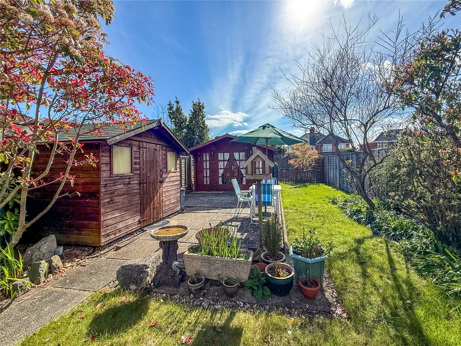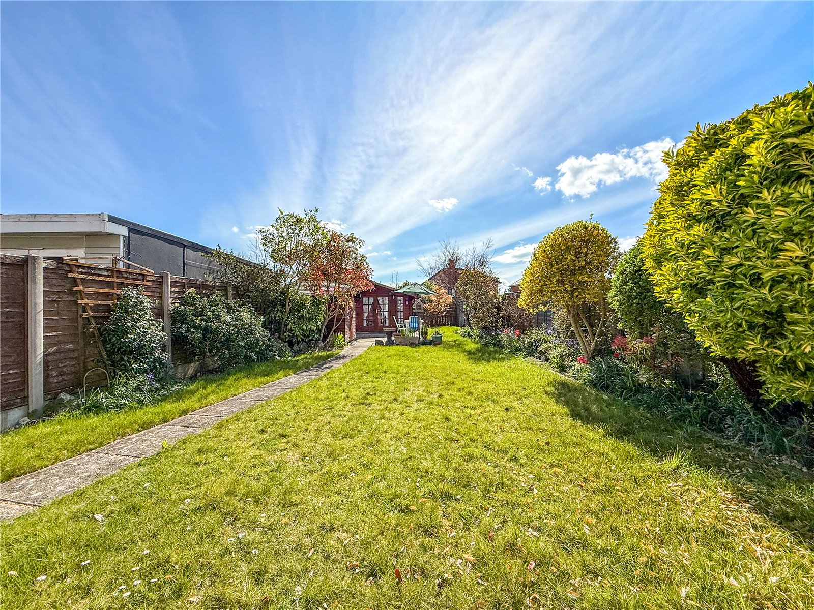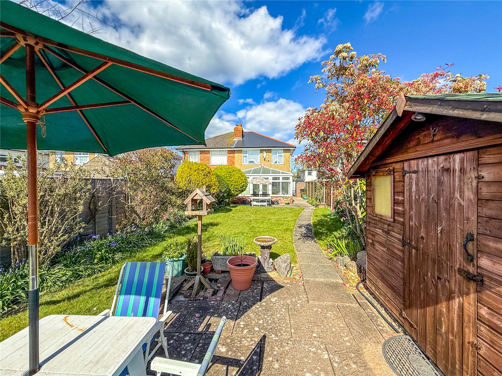 To the front of the property, a driveway provides OFF-ROAD PARKING. There is gated access to the left side of the house and the back door. The long rear garden is a 'key feature' of this home and enjoys a SOUTH-WESTERLY ASPECT, which catches the sun. The garden is divided between patios and lawn, bordered by mature flowerbeds and established shrubs. There is also a 5m x 4m GARDEN CHALET and a storage shed. At the very end of the garden, through a picket gate, is a productive vegetable patch.