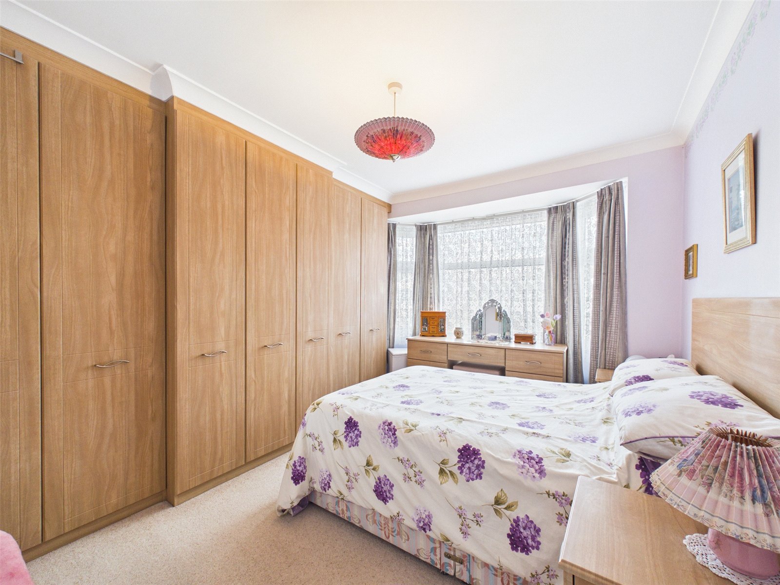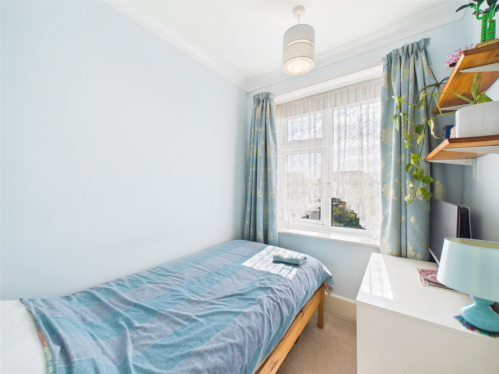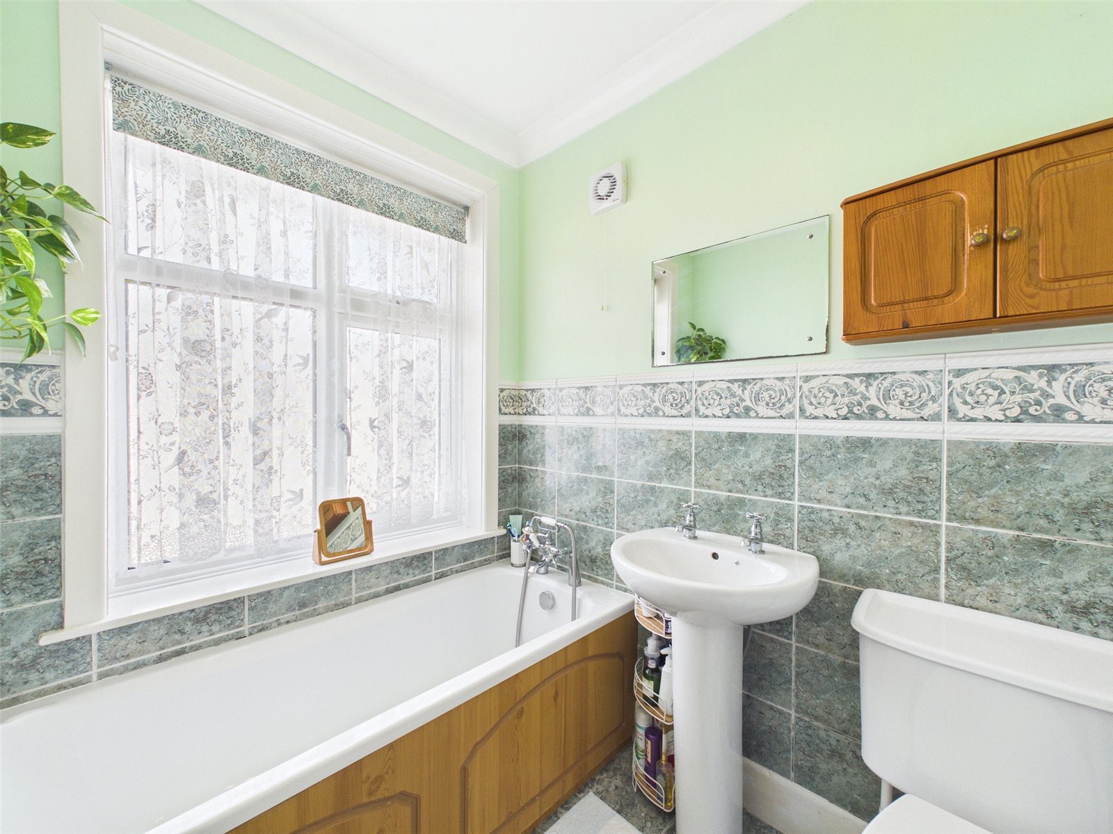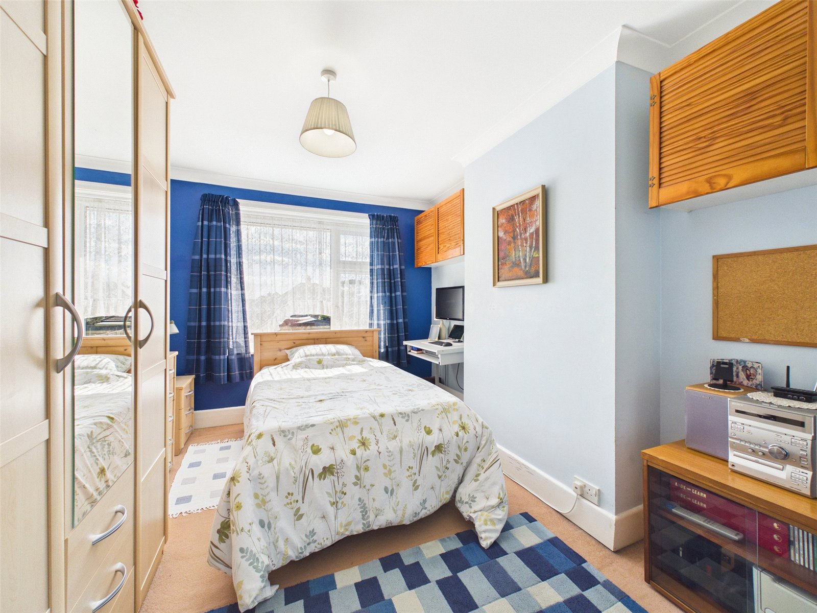 There are three upstairs bedrooms. Bedroom one, a double, is set to the front and features a range of built-in wardrobes. Bedroom two, also a double, looks out over the long rear garden, while bedroom three is set as a guest single room. There is also access to the part-boarded and shelved loft area for storage. The bathroom features a toilet, wash basin, and bath with a shower attachment.