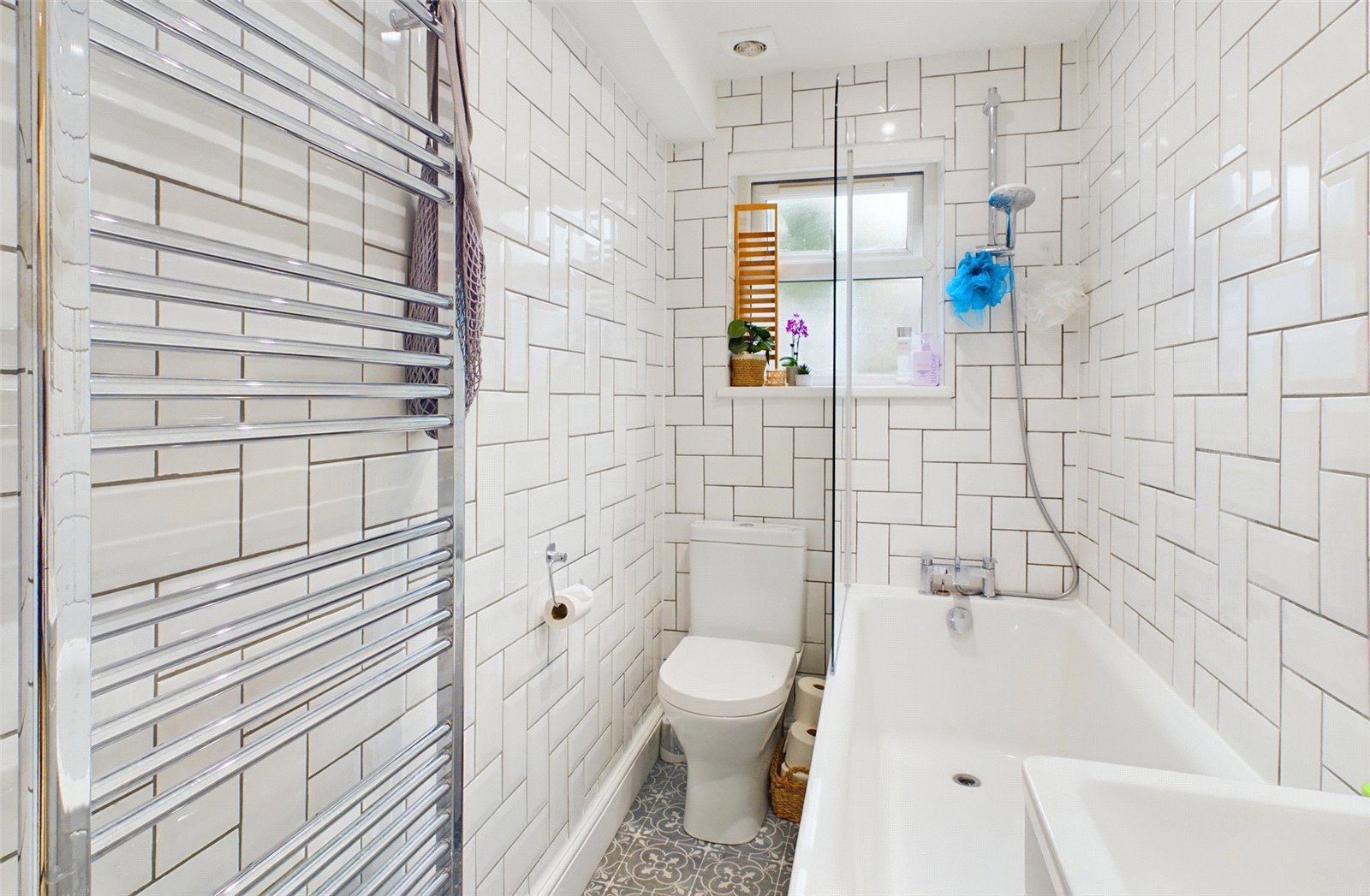 The bedroom is a good double and offers a pleasant aspect over the rear garden whilst the fully tiled bathroom has been fitted with a modern suite to include a panel enclosed bath with a wall mounted shower attachment above, low level flush WC and vanity wash hand basin with pull out drawers below. There is a wall mounted stainless steel heated towel rail and a UPVC obscured window to the side aspect.