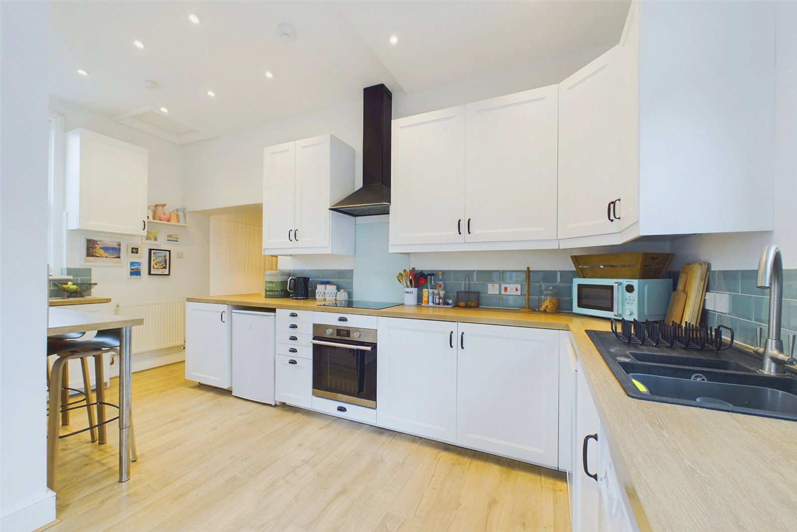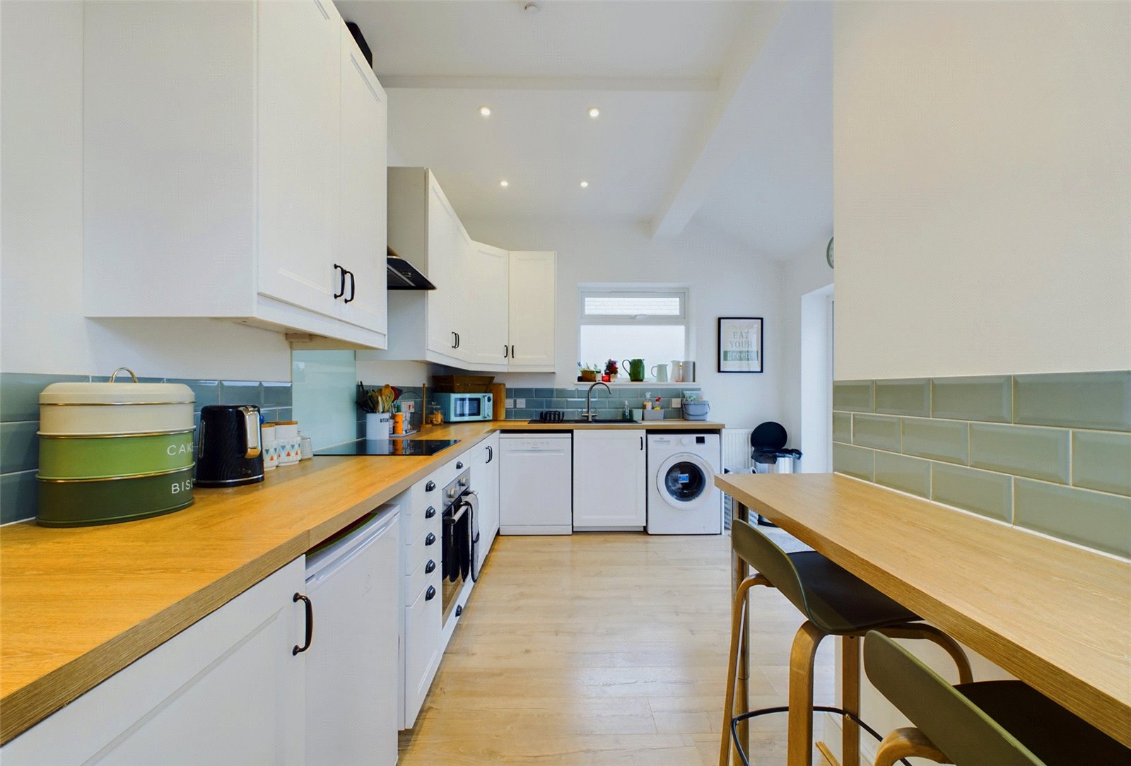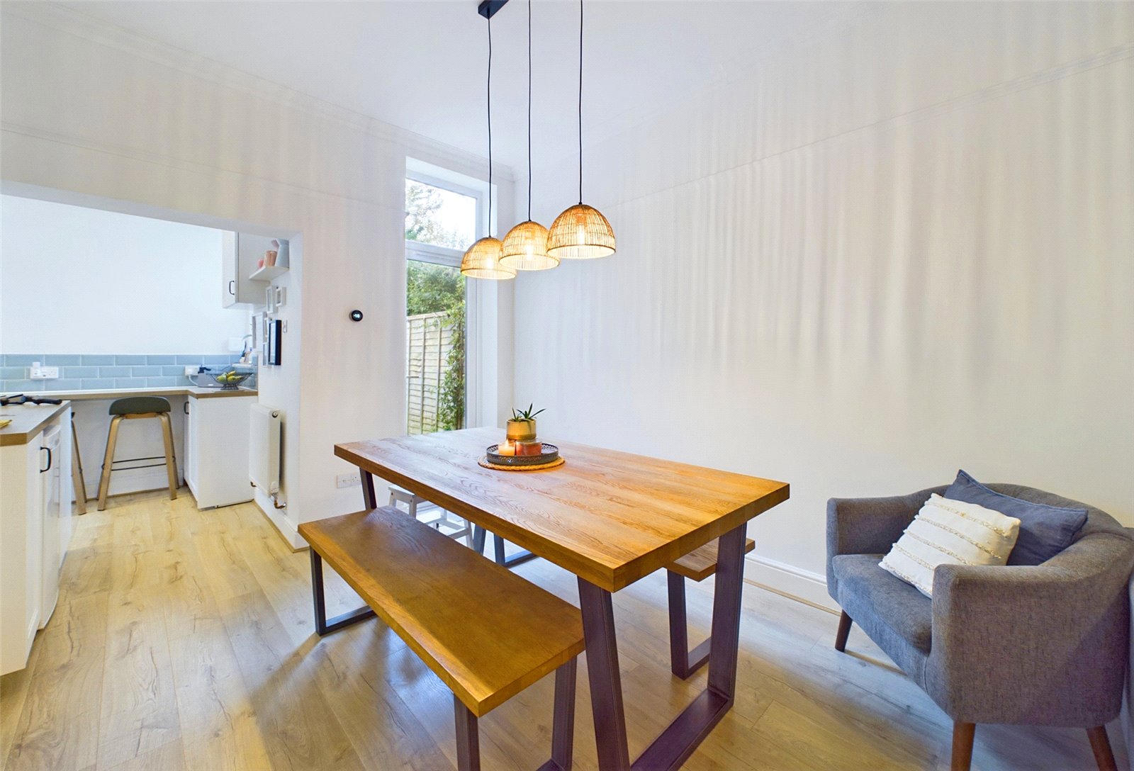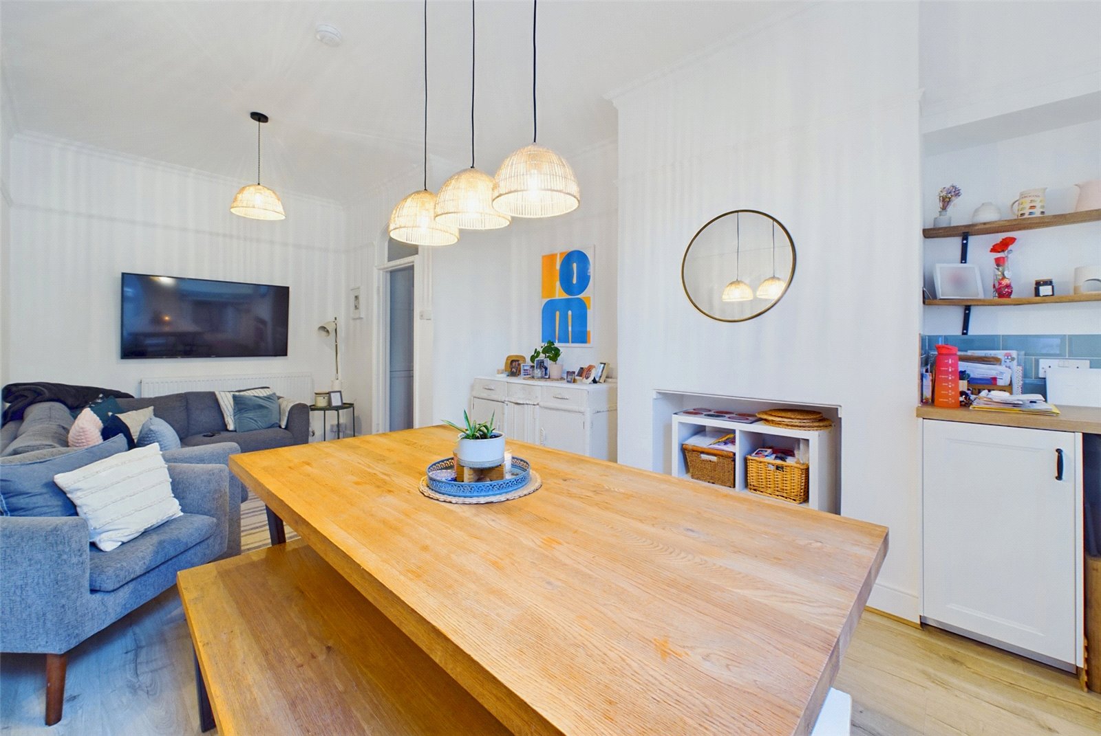The dining room/Living room is a great space to dine and relax, with space for sofas and a dining table. A fully glazed UPVC door leads to the private rear garden and the dining area opens up into the modern kitchen/breakfast room which has been tastefully fitted with a range of eye level and base units with a built in oven and hob, space for white goods and a breakfast bar area. A set of UPVC French doors lead out into the private rear garden and doors offer access into the bathroom and further bedroom.
