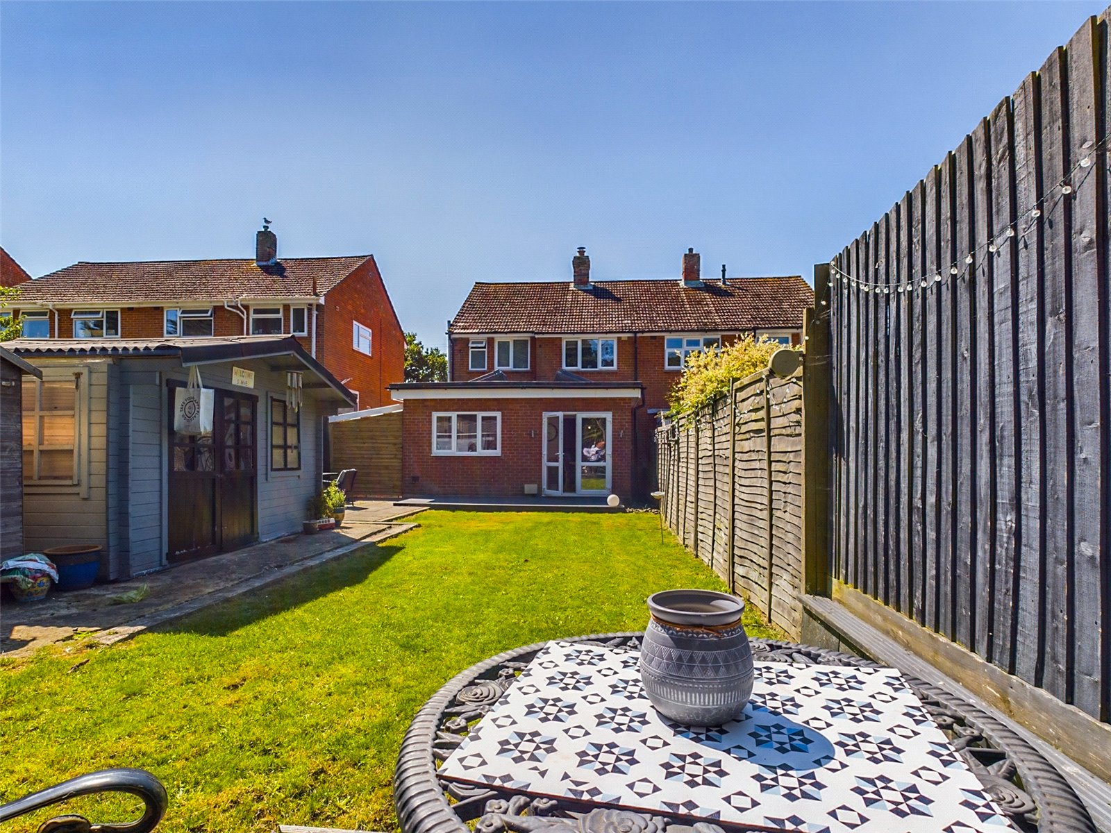 - Sunny rear garden with summer house