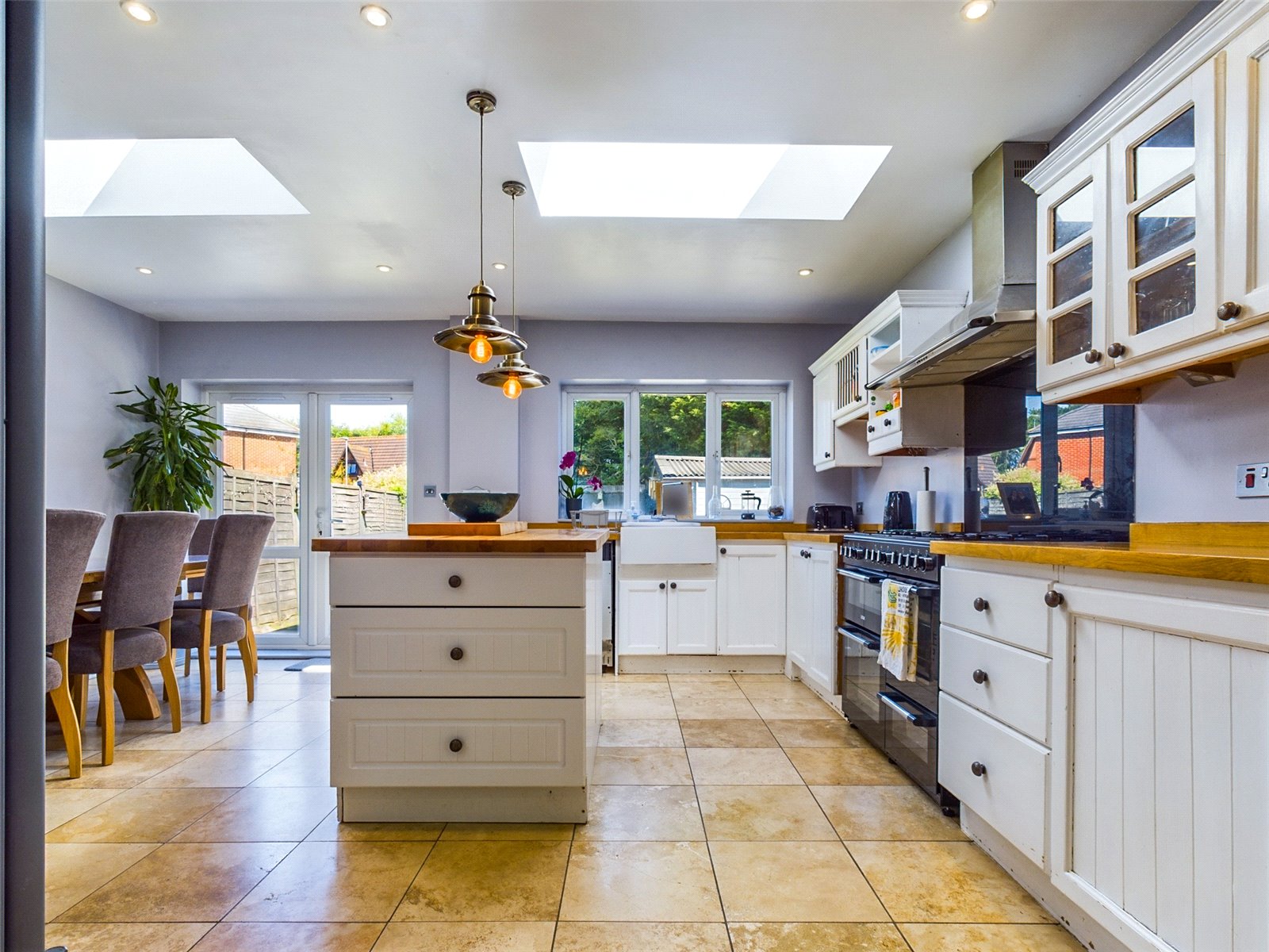 A country style kitchen comprises a selection of eye and base level units, solid wood tops, butler sink and mixer tap, space for a large cooker, dishwasher, fridge freezer and washing machine. This is a bright room with two large skylights, and it wraps round into the snug. Door opens into the rear garden. A further door on the side leads to a large lean providing outside storage space. There is outside power and space for further white goods. There is also and outside sink.