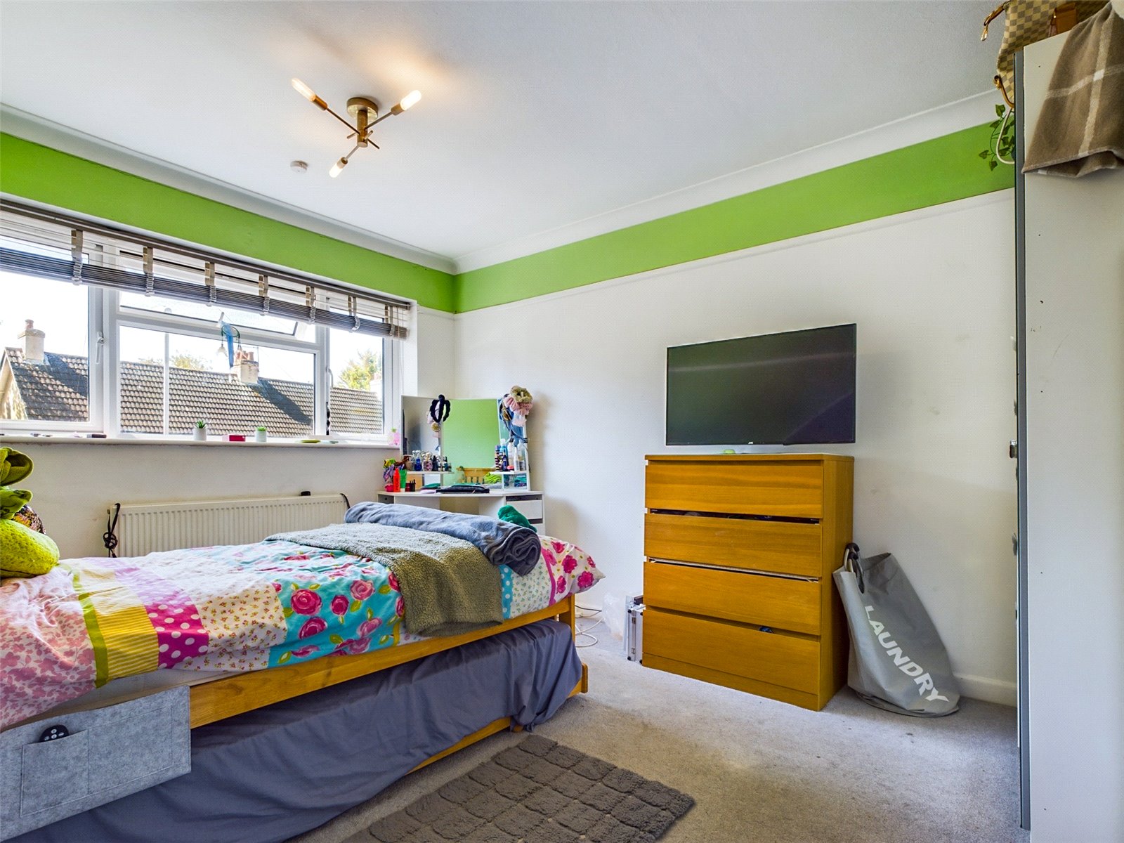 It has a large front aspect window, and a wood burner.