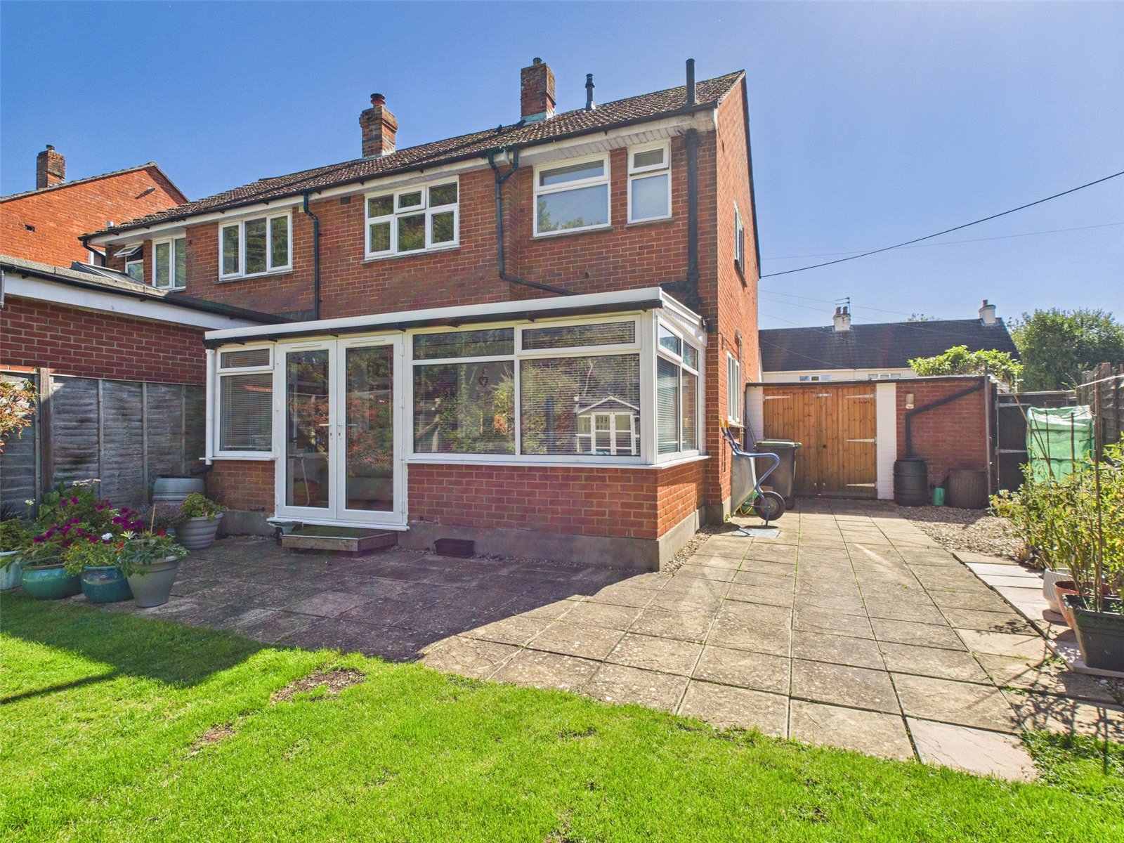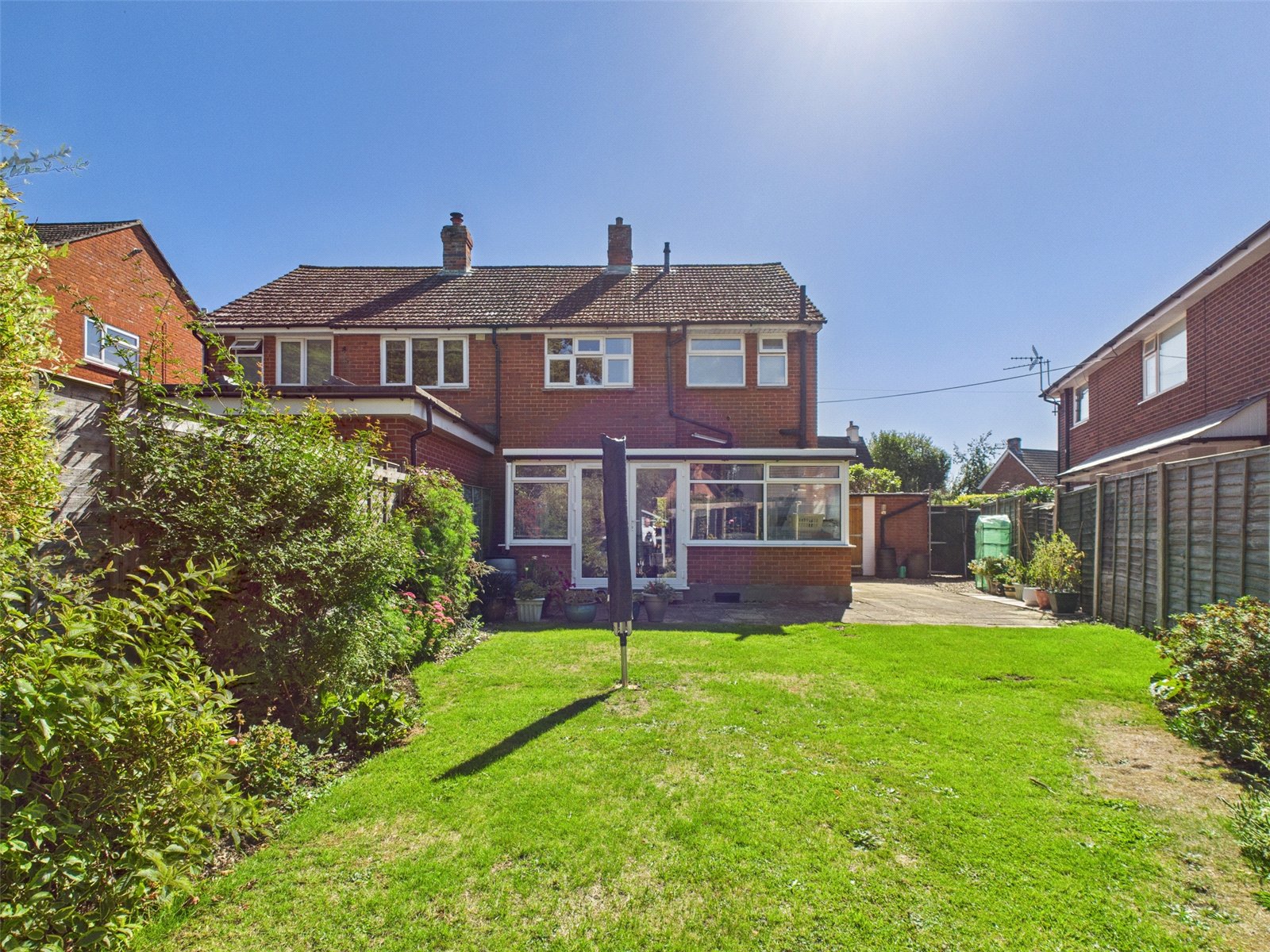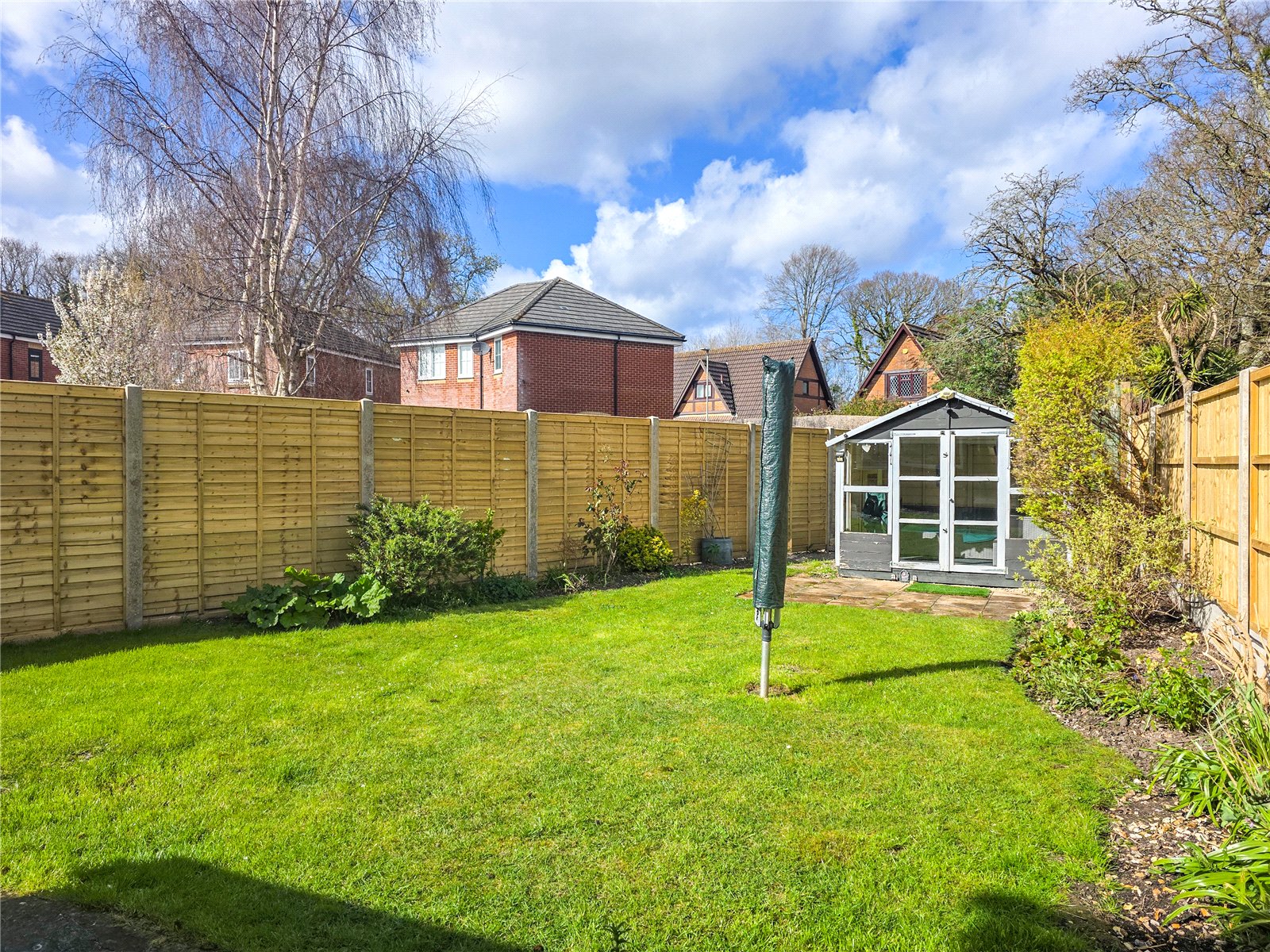 The rear garden is laid to lawn with a few shrubs, has a summer house, and is bound by new fence panels on both sides.