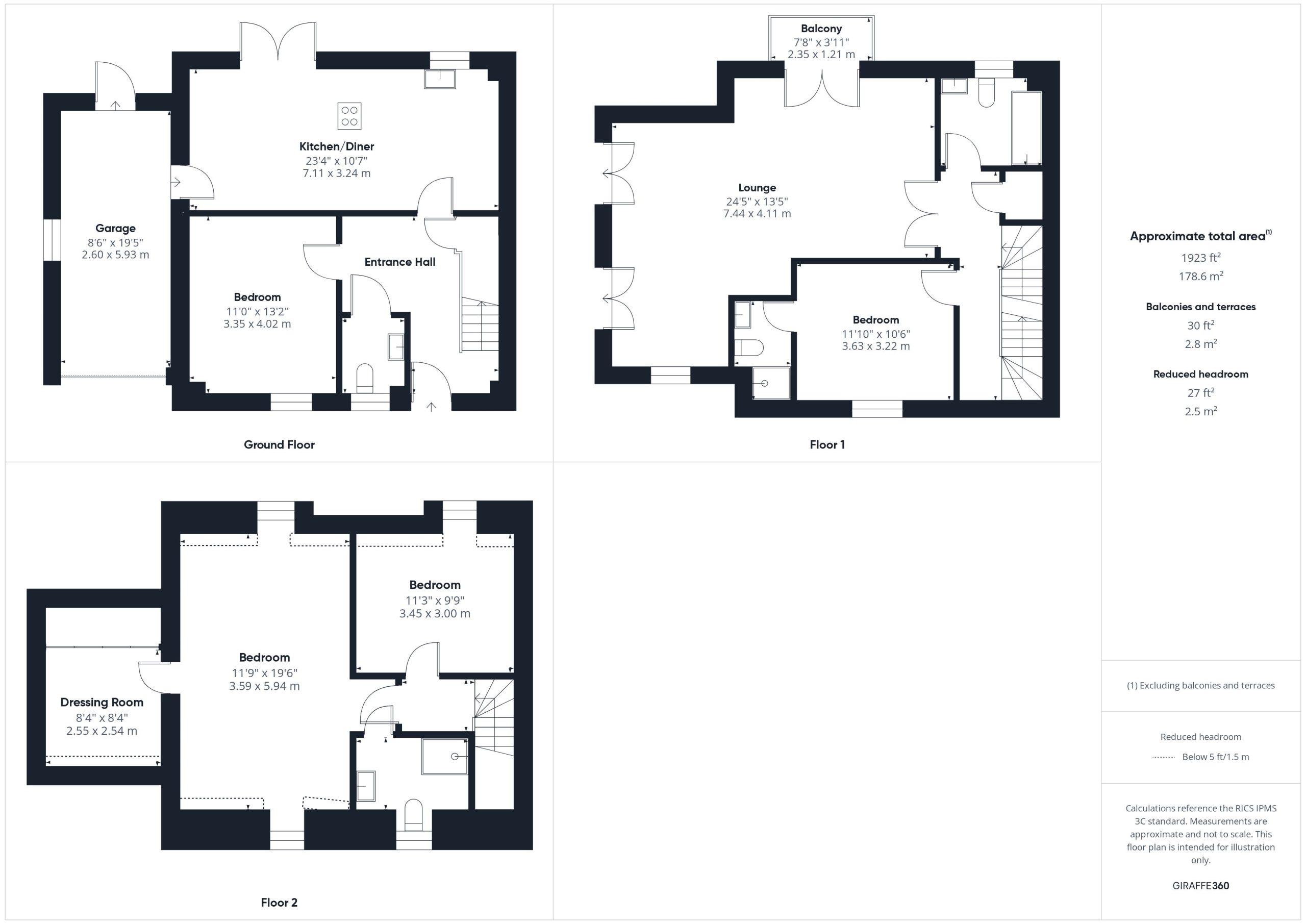 Stairs from the first floor landing lead to the second floor landing. There are two more bedrooms on the top floor. The main bedroom has an ensuite with wc, basin and shower unit as well as a dressing room with built in wardrobes.