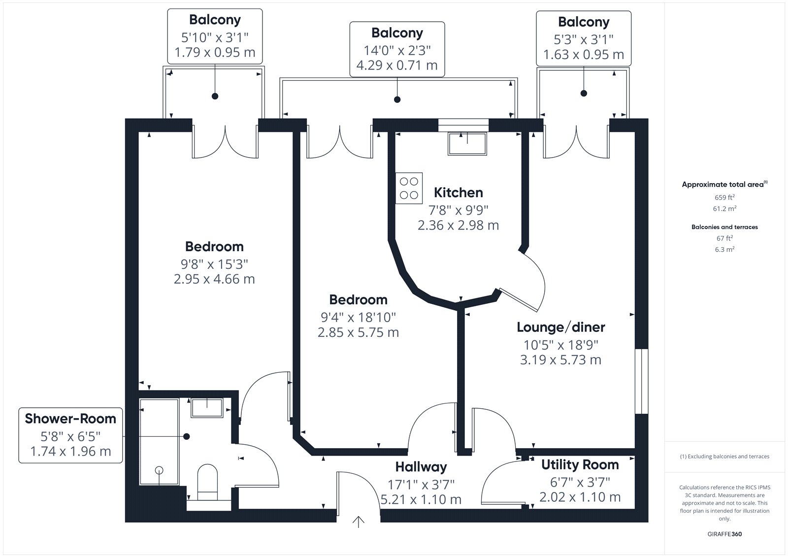 The three private balconies provide a combined 67 sq. ft (6.3 sq. m) of outdoor space.
