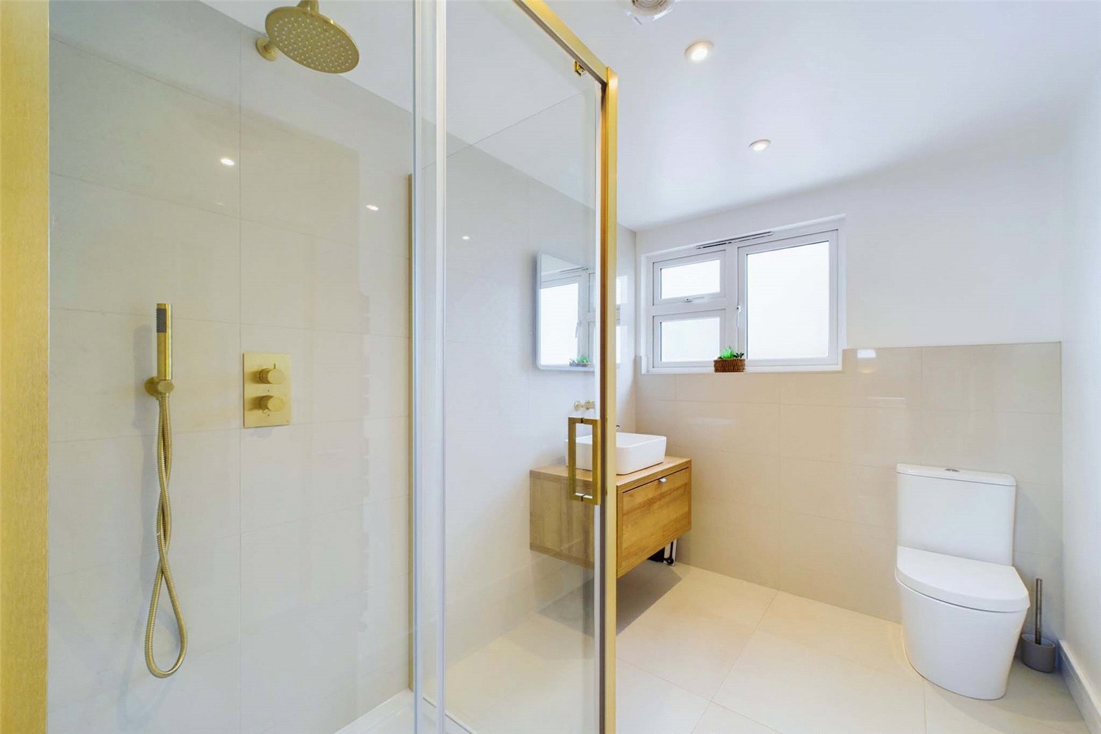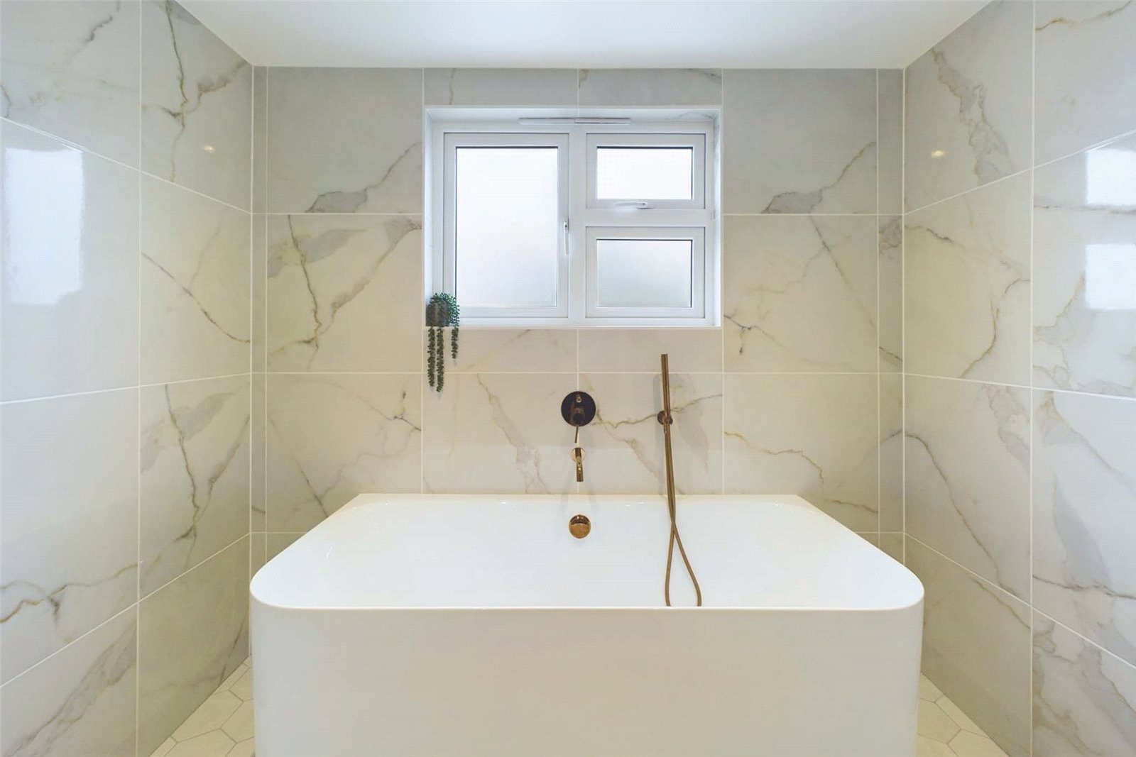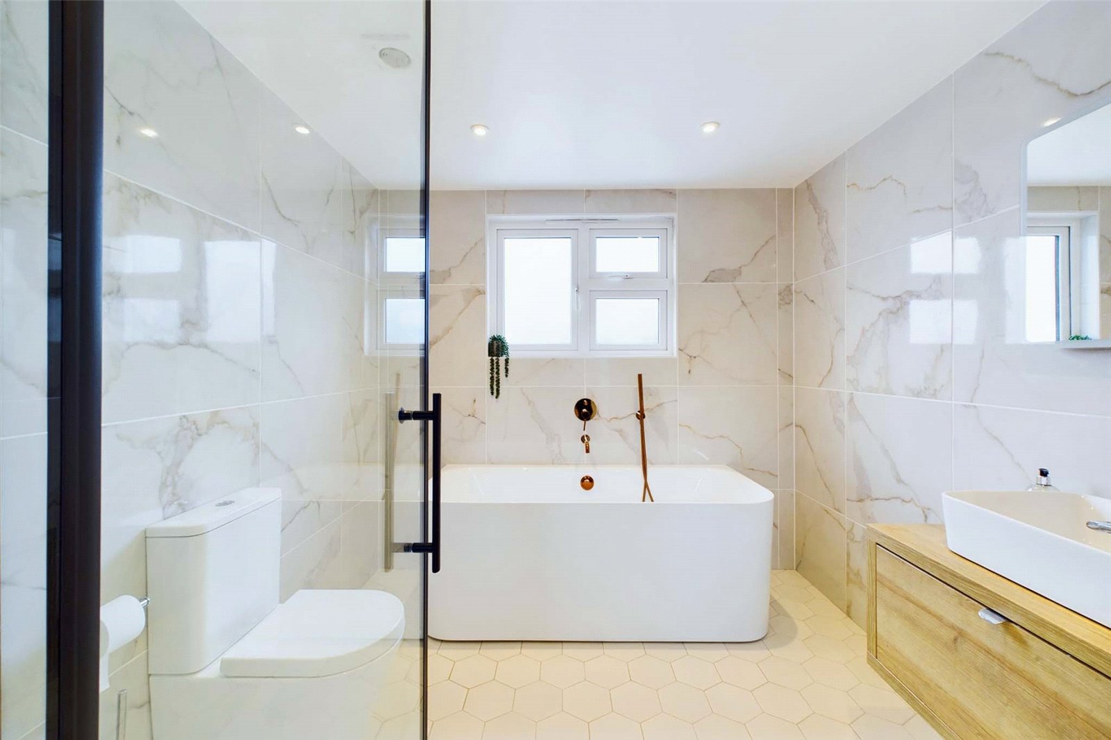 Featuring a roll top bath with wall-mounted mixer, bath spout and shower tap in rose gold, the family bathroom makes a real statement. It also benefits from a separate walk in corner shower, a floating vanity unit with countertop sink and wall mounted mixer, a low level wc and a heated towel rail.