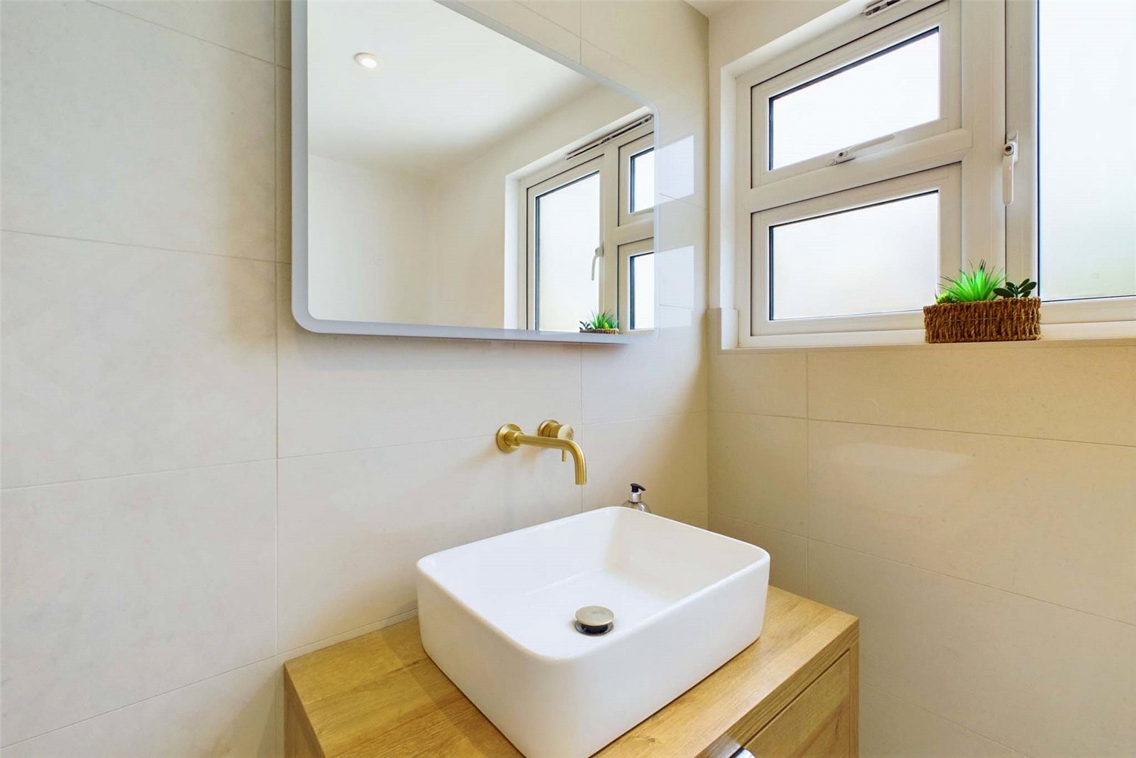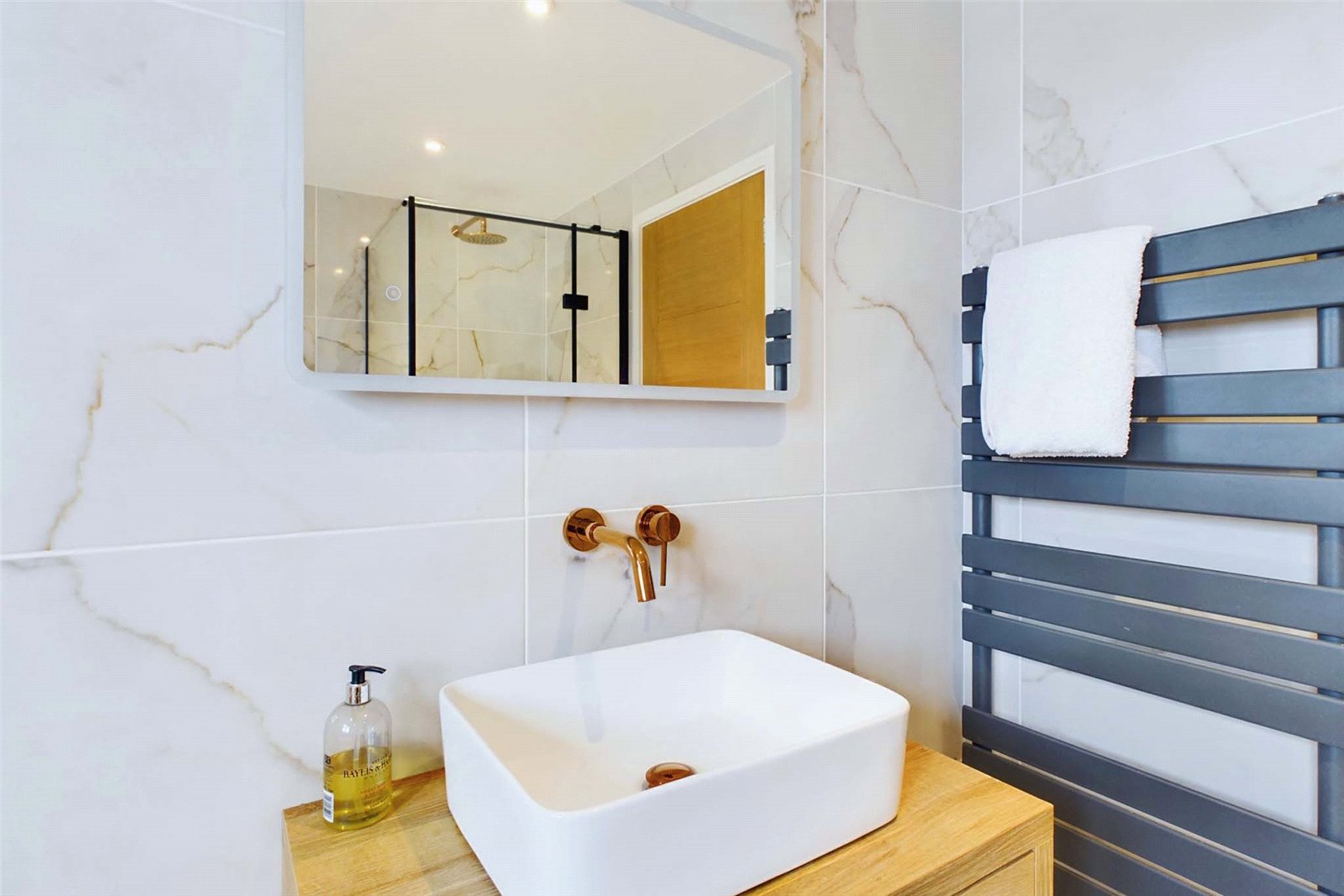 The ground floor bedroom makes for a comfortable double room and gives the home great flexibility. This has its own en-suite shower room which is tastefully finished in a monochrome style and fitted with a low level wc, hand wash basin and walk in shower.