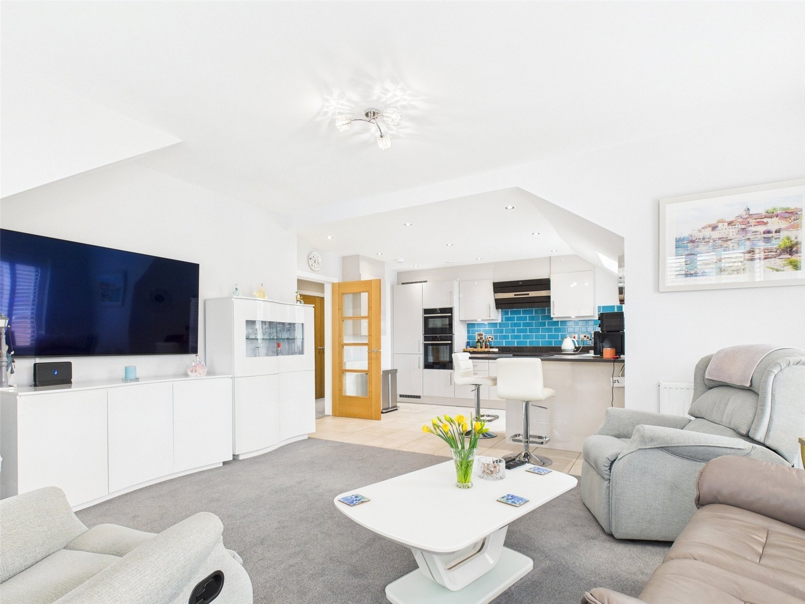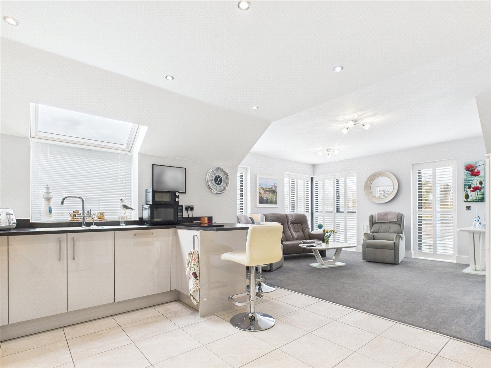 Open plan living enjoying a dual aspect, making it a lovely bright living space, this includes near floor to ceiling windows on two walls, and a door opening on to the private balcony where you can enjoy sun at some point throughout the whole day, including the evening sunset.