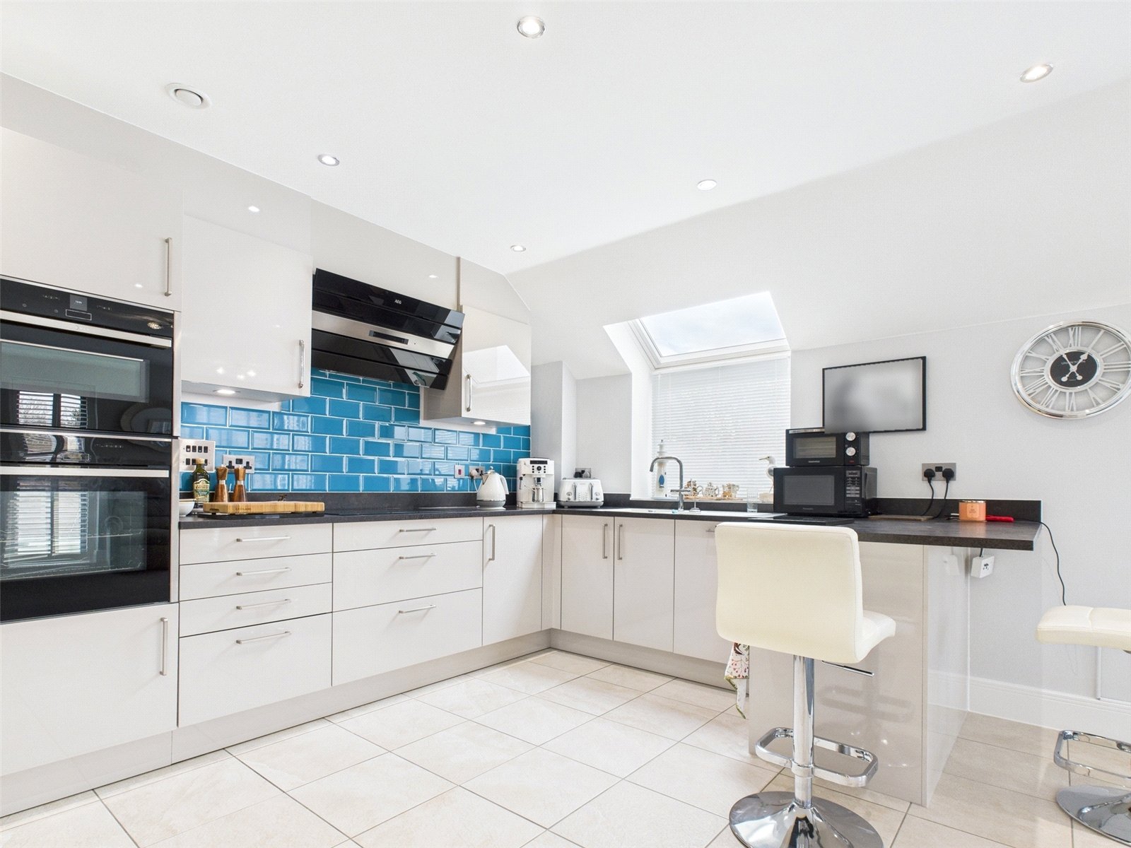 The stylish high spec kitchen comprises a range of eye and base level units with cupboards and drawers, and a breakfast bar. Integrated appliances including eye level AEG double oven and matching induction hob, fridge, freezer and full size dishwasher. The separate utility room has large storage cupboard, space for appliances such as the washing machine. Wall mounted gas boiler, additional cupboards and a sink and drainer unit.