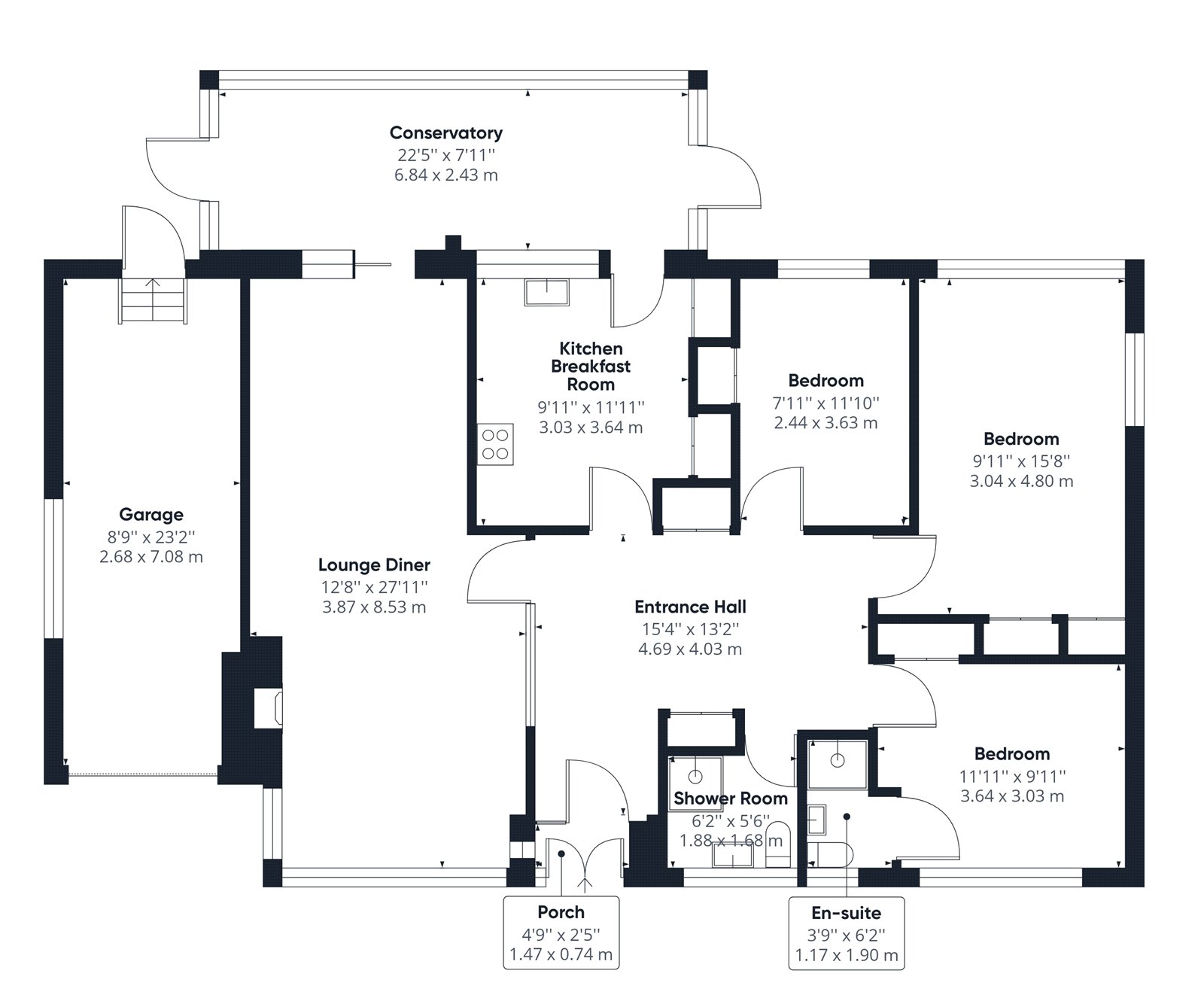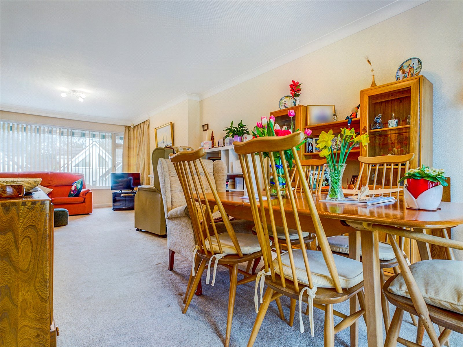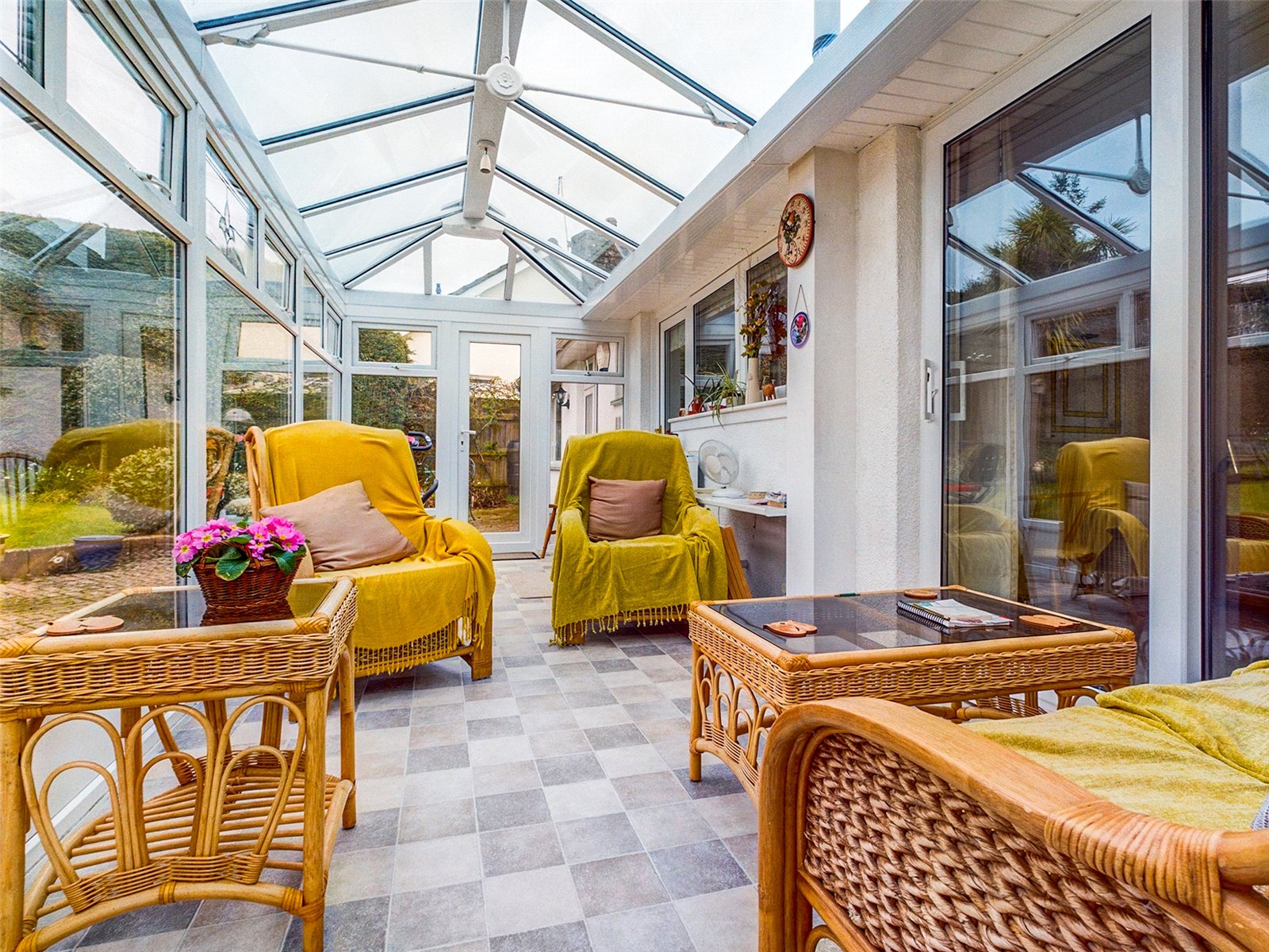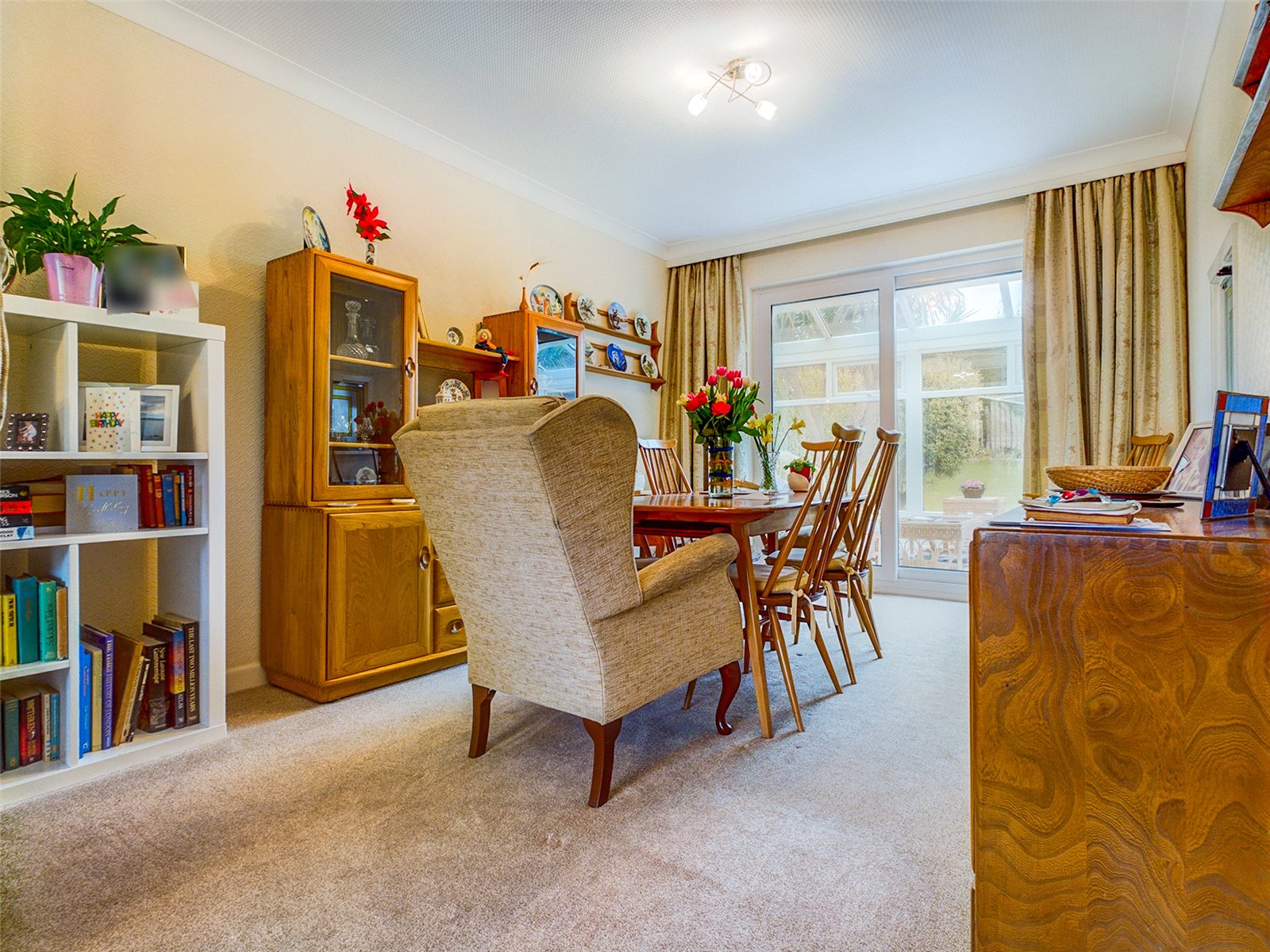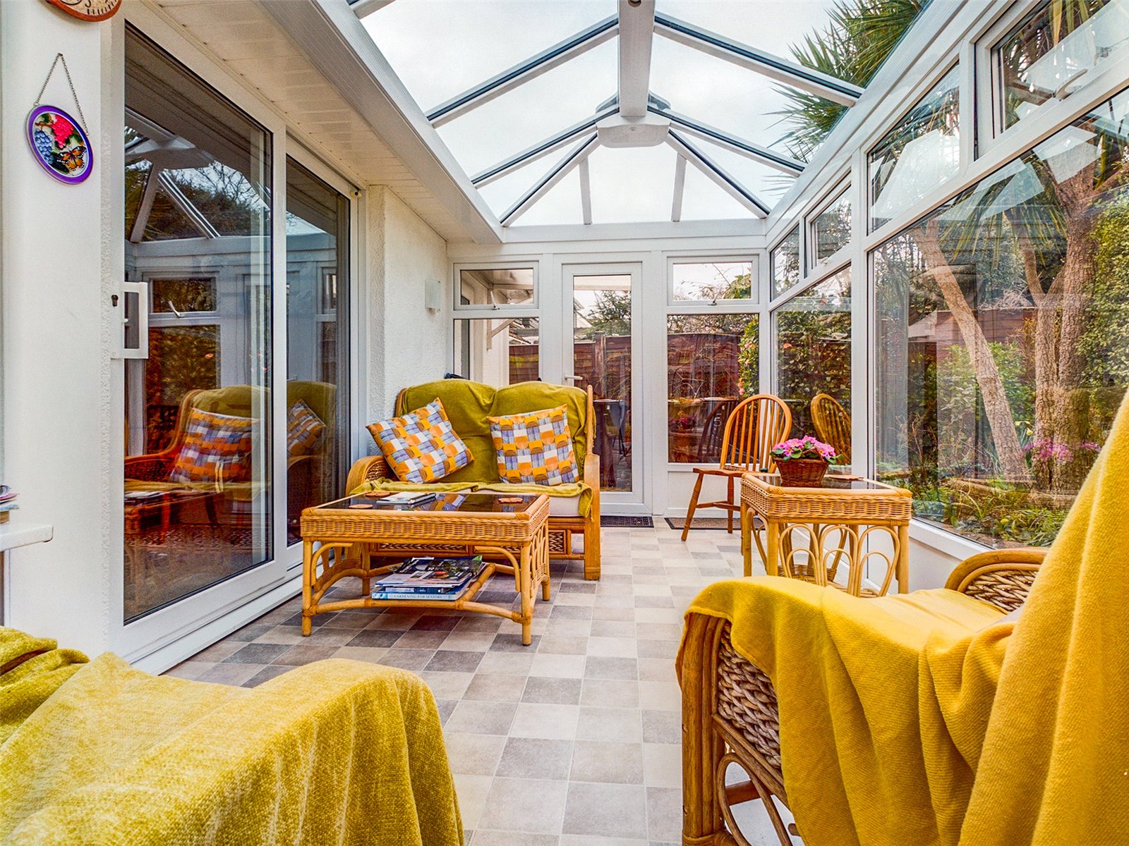 Dual aspect lounge diner with doors into the large conservatory which has a glass pitched roof, and doors on either end into the garden.