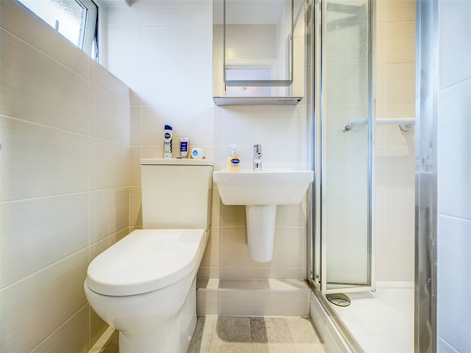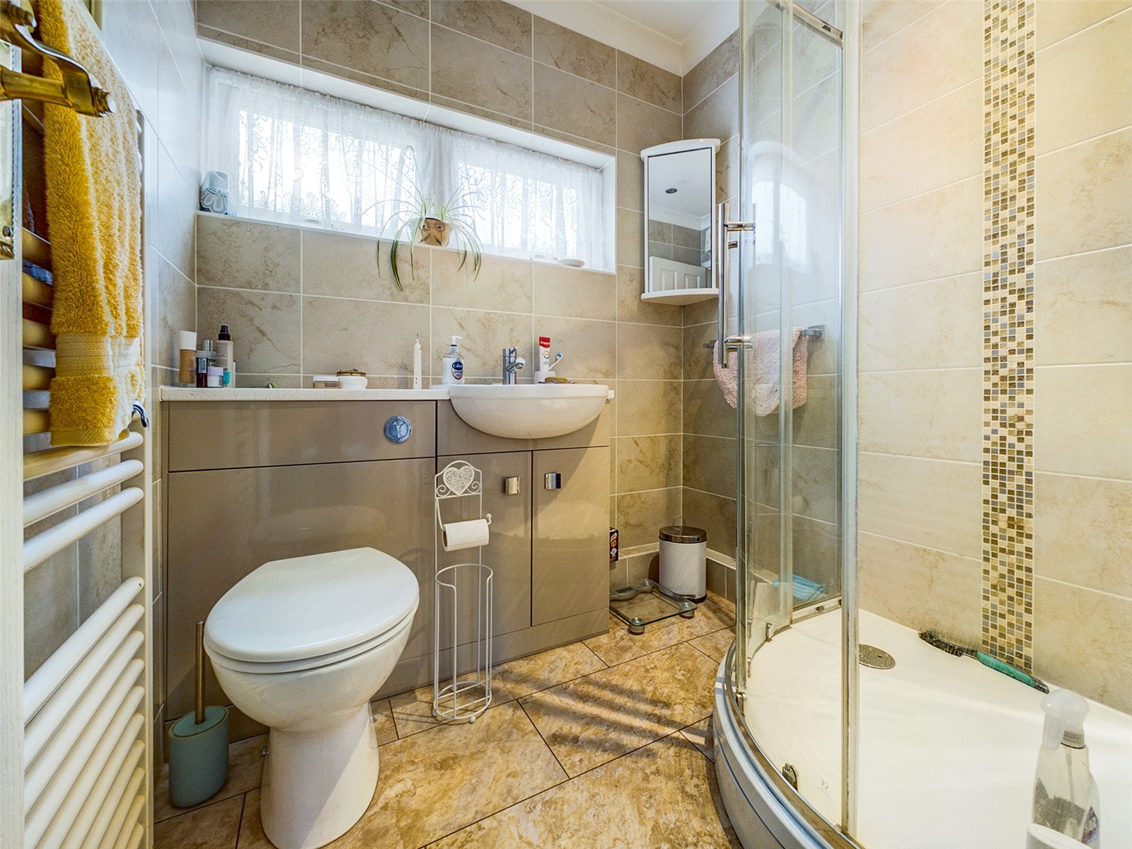 The main shower room has a modern suite comprising shower cubicle, WC and wash hand basin. Heated towel rail and obscured glazed window.