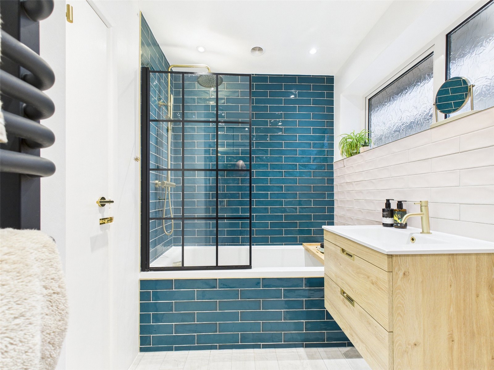 The very nice modern bathroom suite comprises a bath with rainfall shower head over and a stylish black framed shower door, a wash hand basin set in to vanity drawer, and a WC. Part tiled with a large heated towel rail and an obscured glazed window.