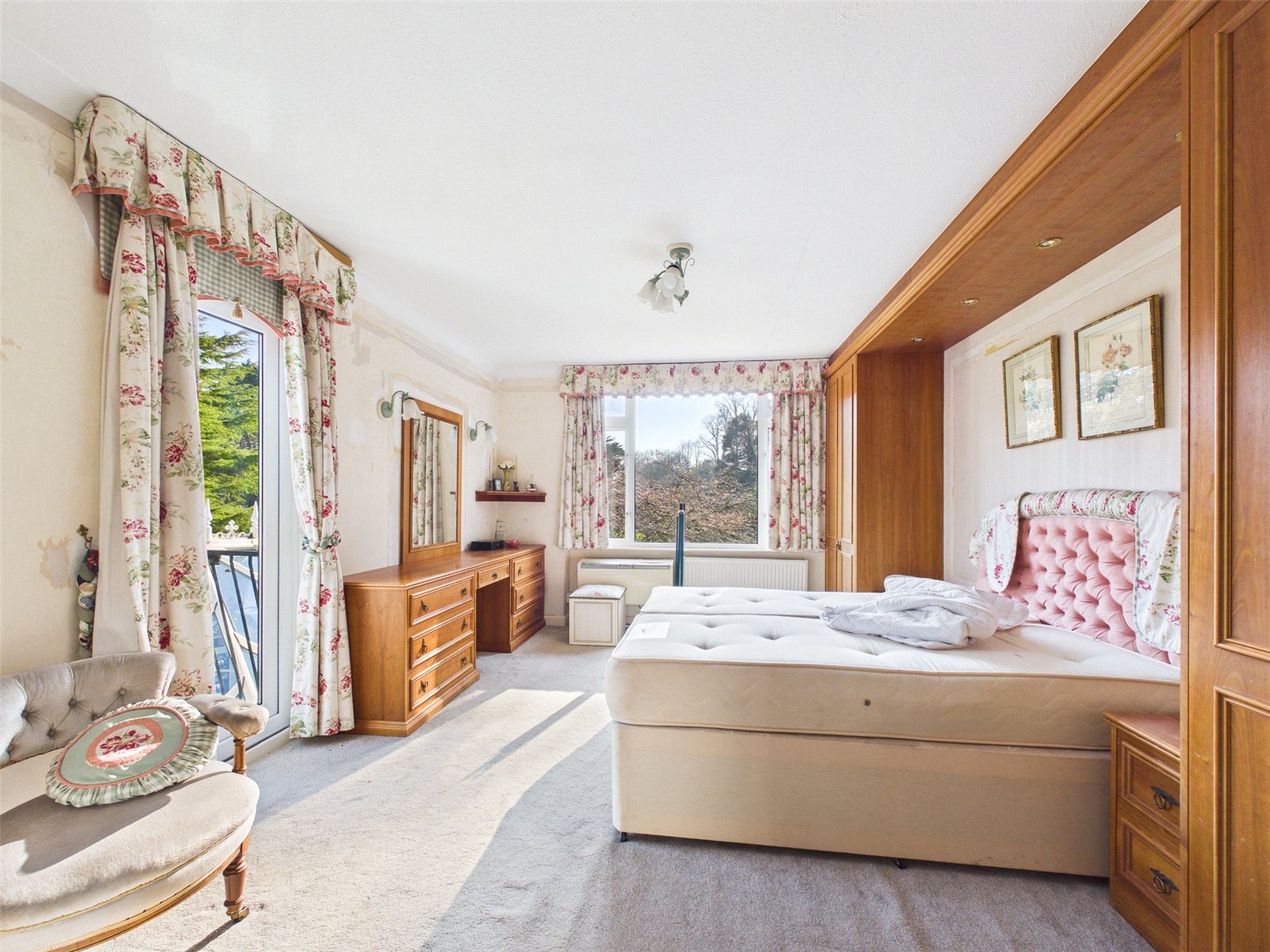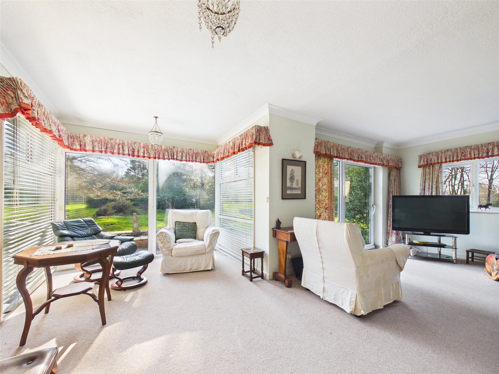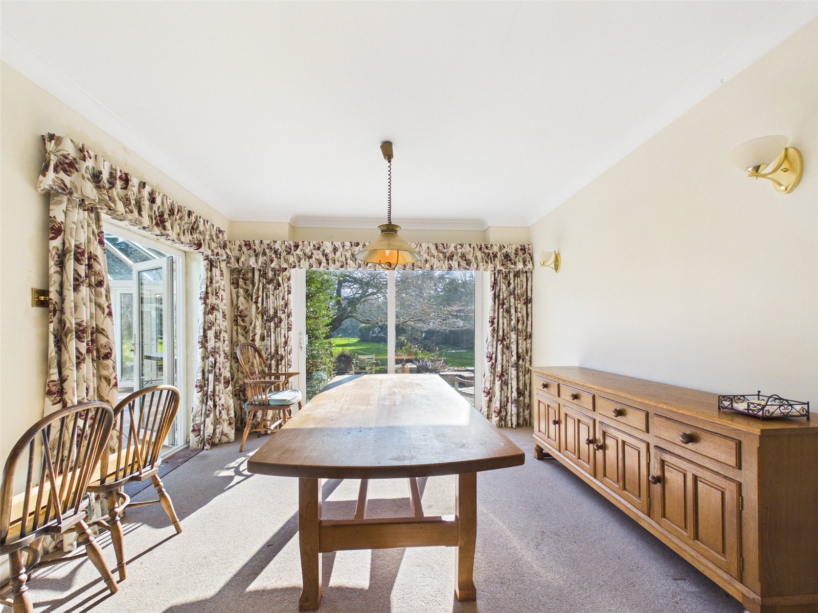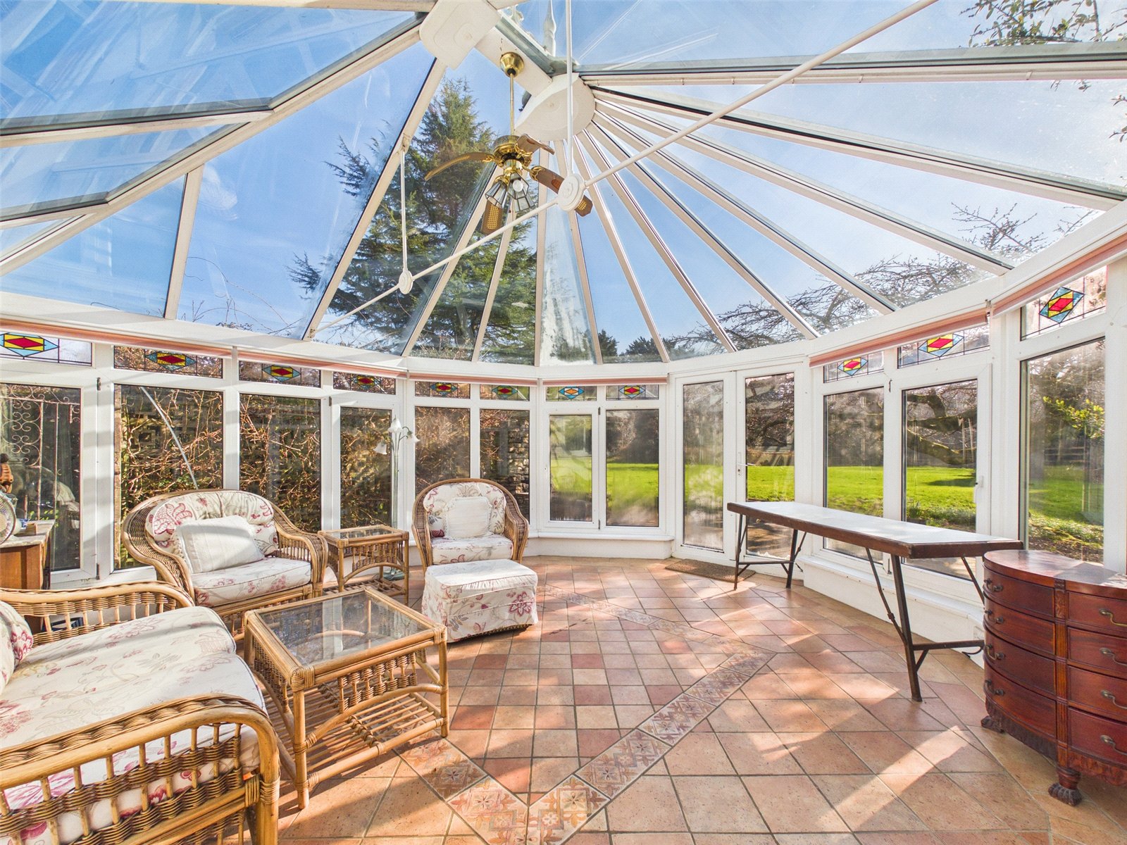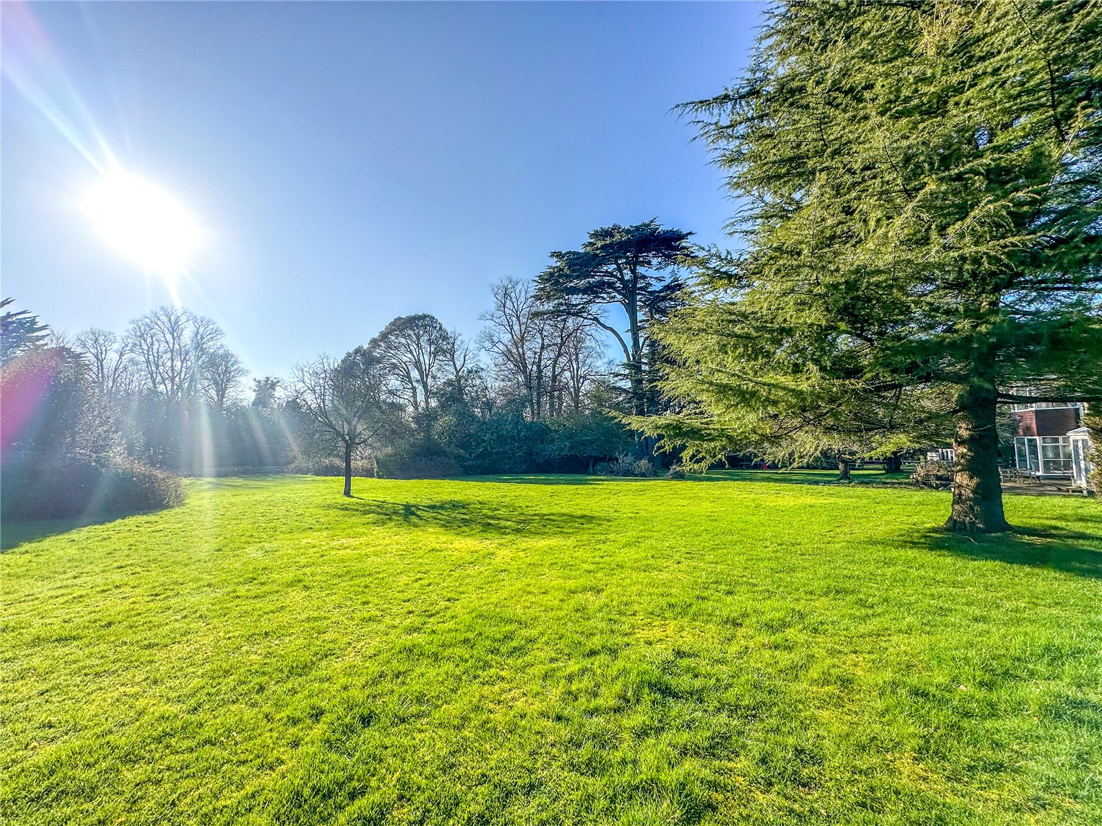 Upstairs there are four well proportioned bedrooms, three with built-in storage. The principal suite features an ensuite and balcony, with far-reaching views across the gardens. A shower room completes the first-floor accommodation.