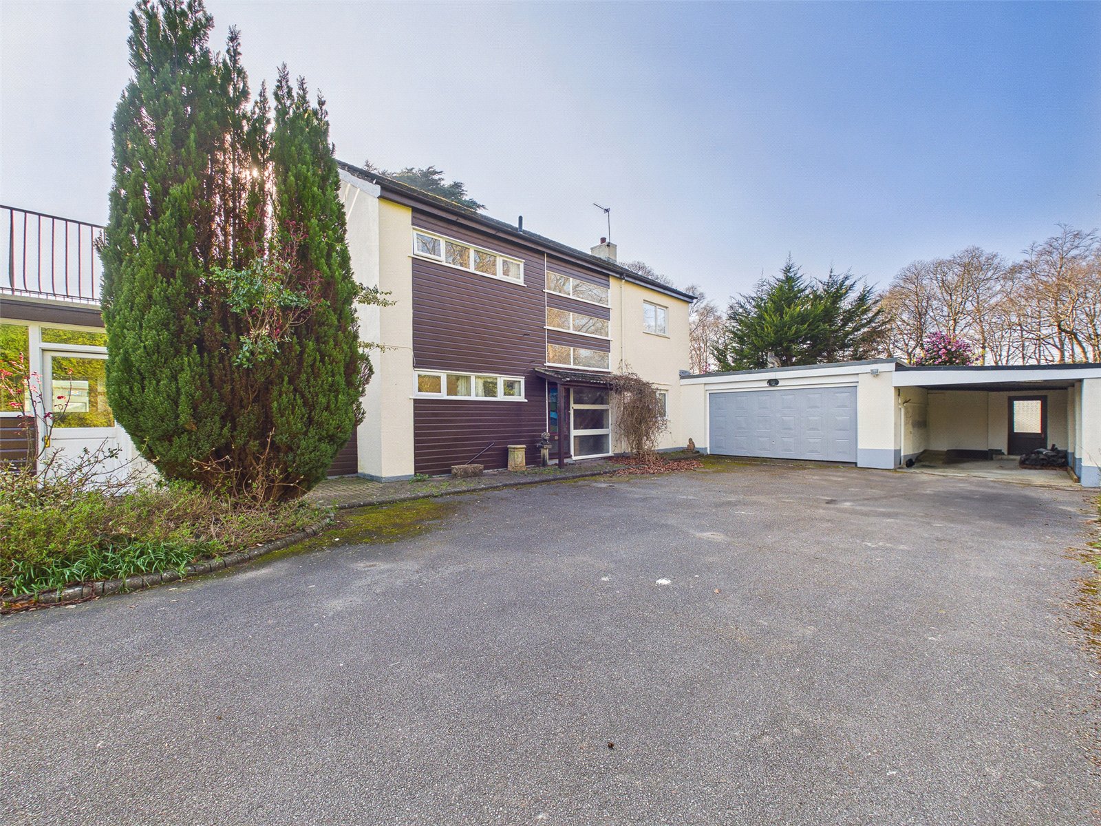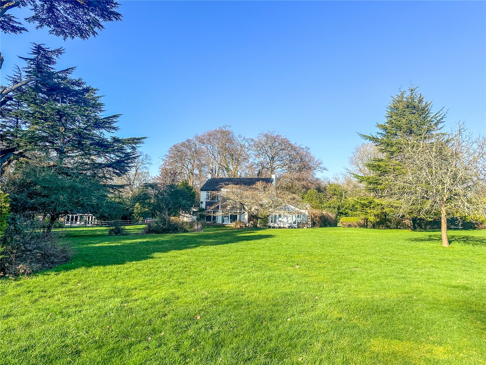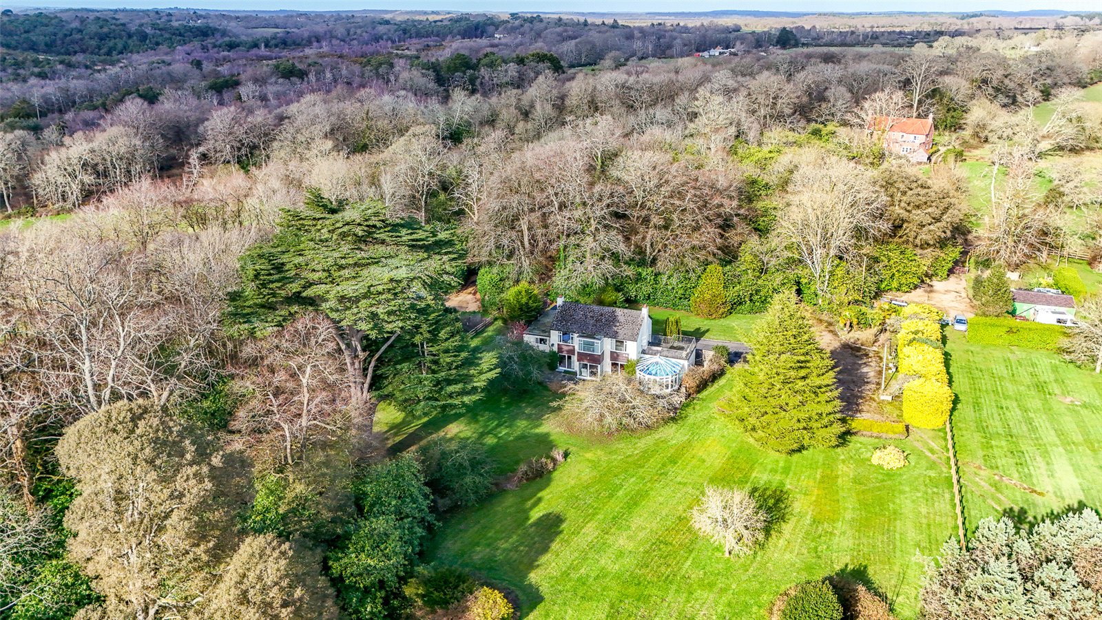 Externally, the grounds span approximately 2 acres, predominantly laid to lawn, with a tree-lined and fenced circumference. To the front is a large drive, with plenty of space for vehicles, alongside a carport and double garage. The property is entranced via a tree-lined driveway from Lyndhurst Road.