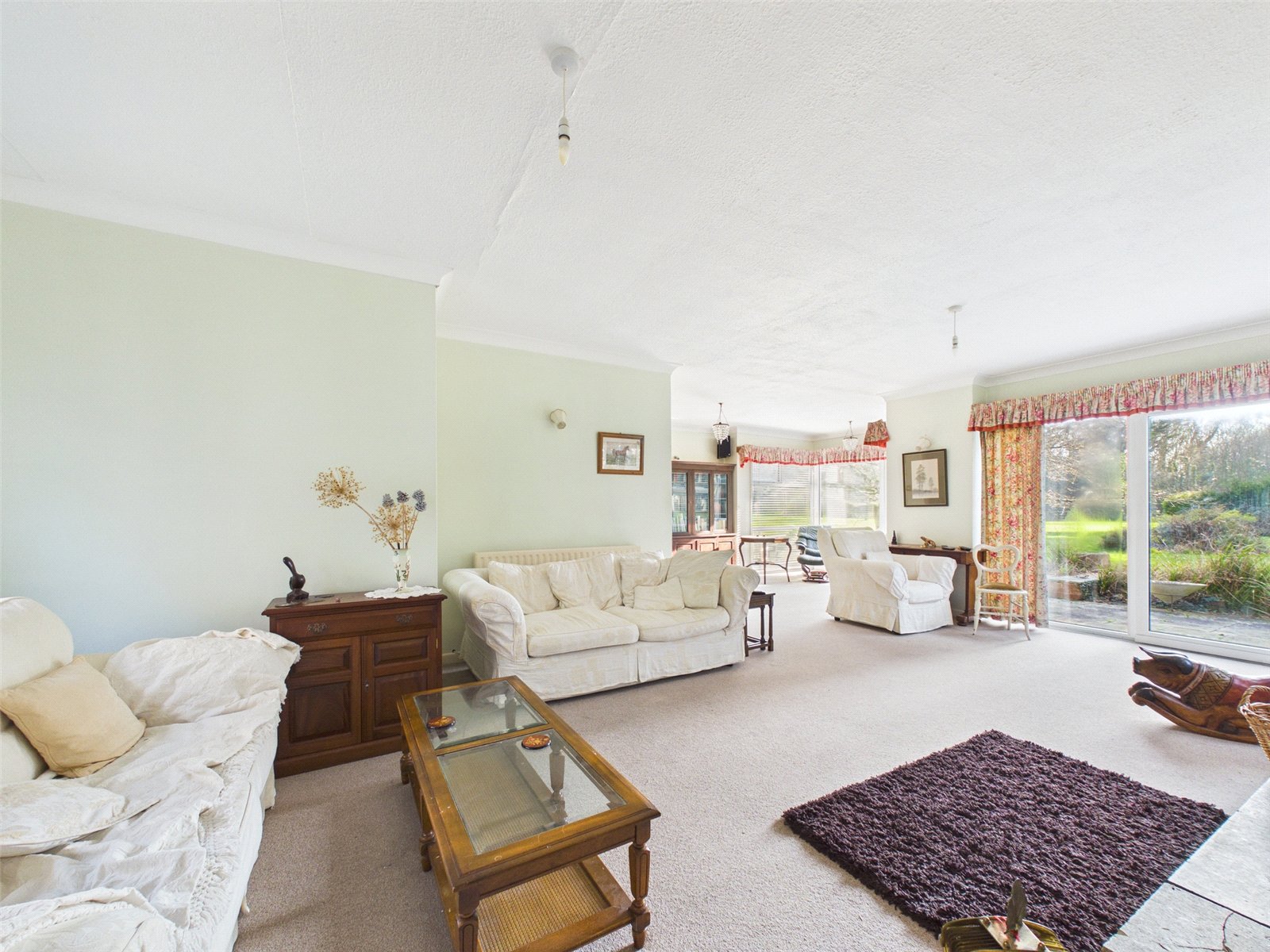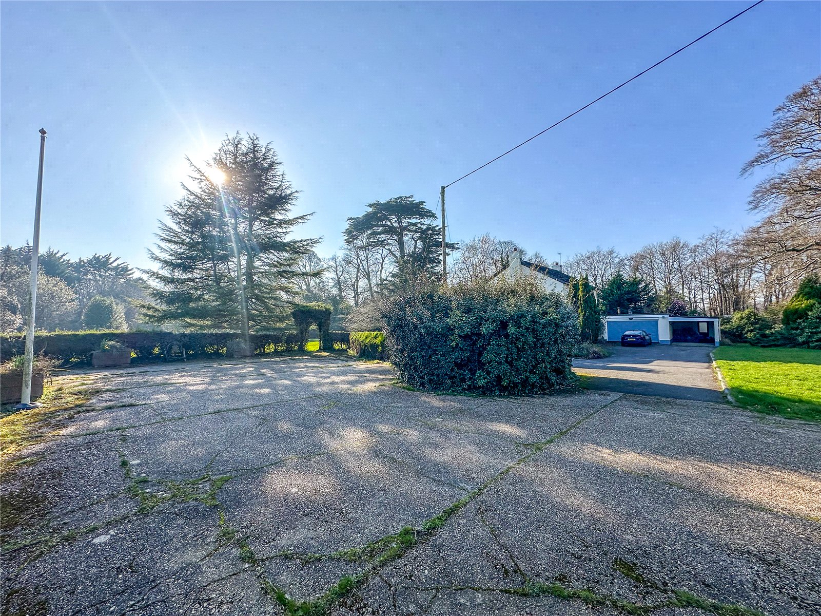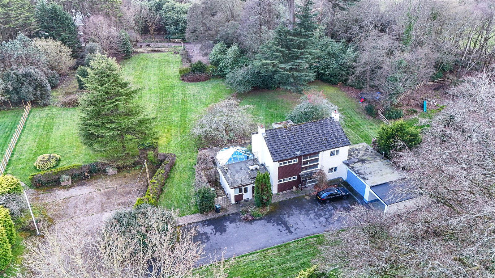 Externally, the grounds span approximately 2 acres, predominantly laid to lawn, with a tree-lined and fenced circumference. To the front is a large drive, with plenty of space for vehicles, alongside a carport and double garage. The property is entranced via a tree-lined driveway from Lyndhurst Road.